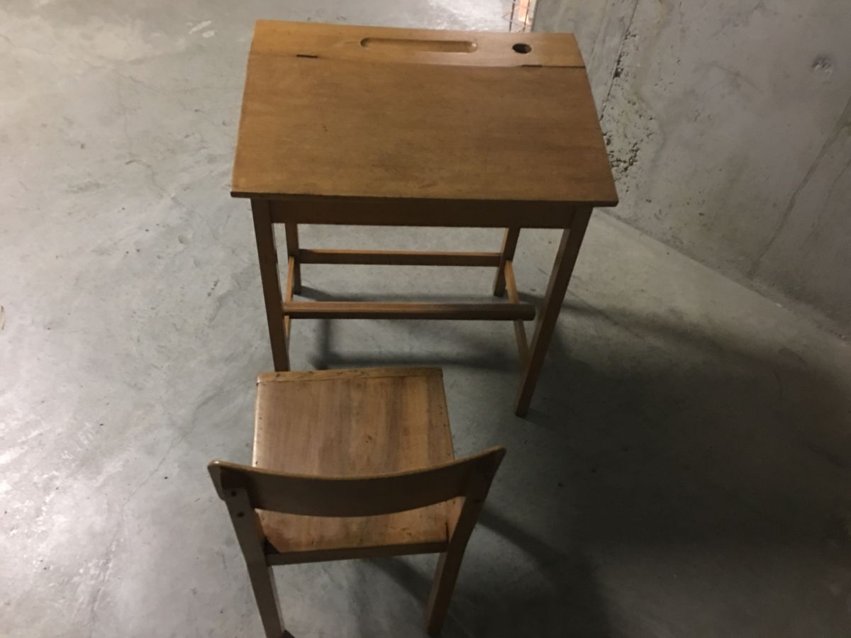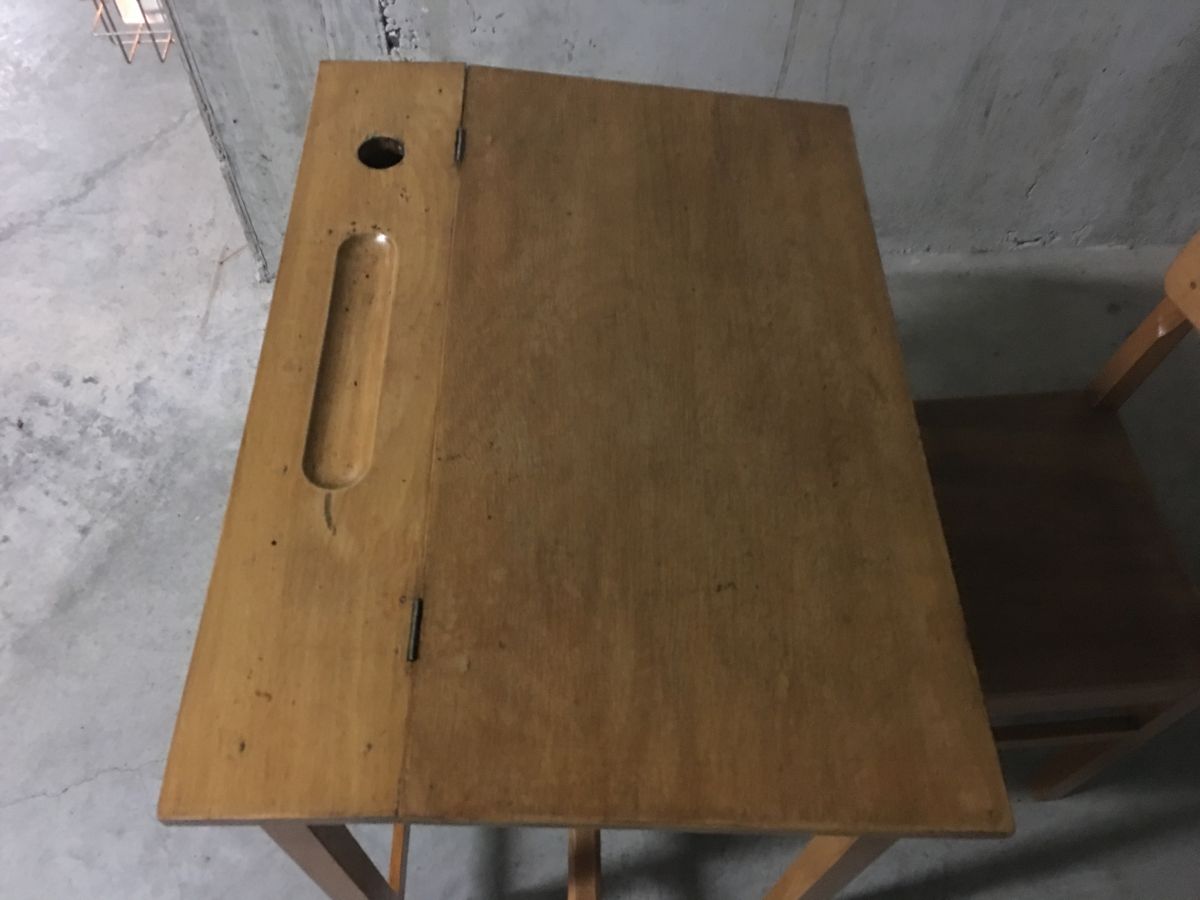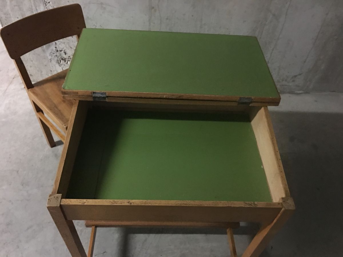 Superbe petit pupitre d’écolier et sa chaise des années 60 en bois, dimensions pupitre (cm) : L.60xH.70xP.44, chaise : hauteur totale 66cm, hauteur assise 40cm, assise 31x31cm, bon état.
