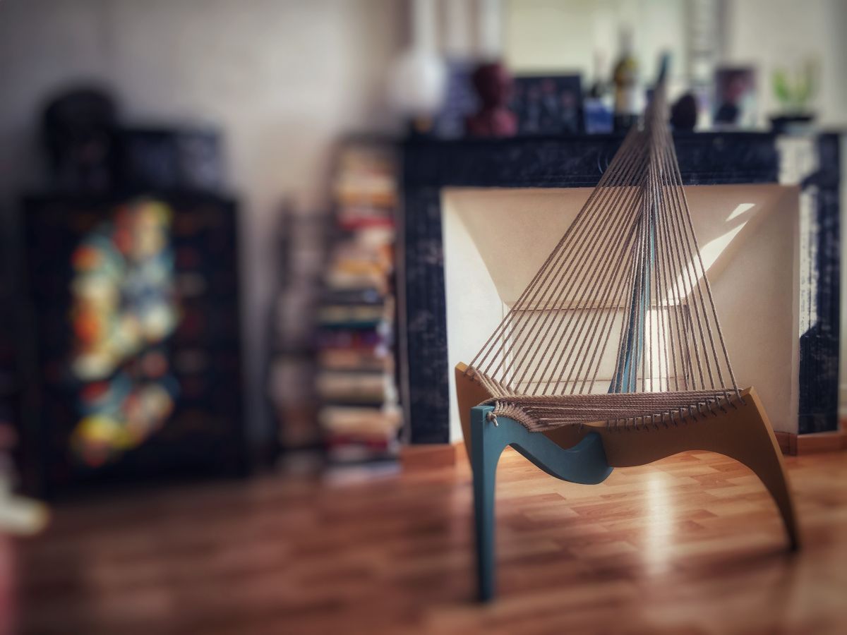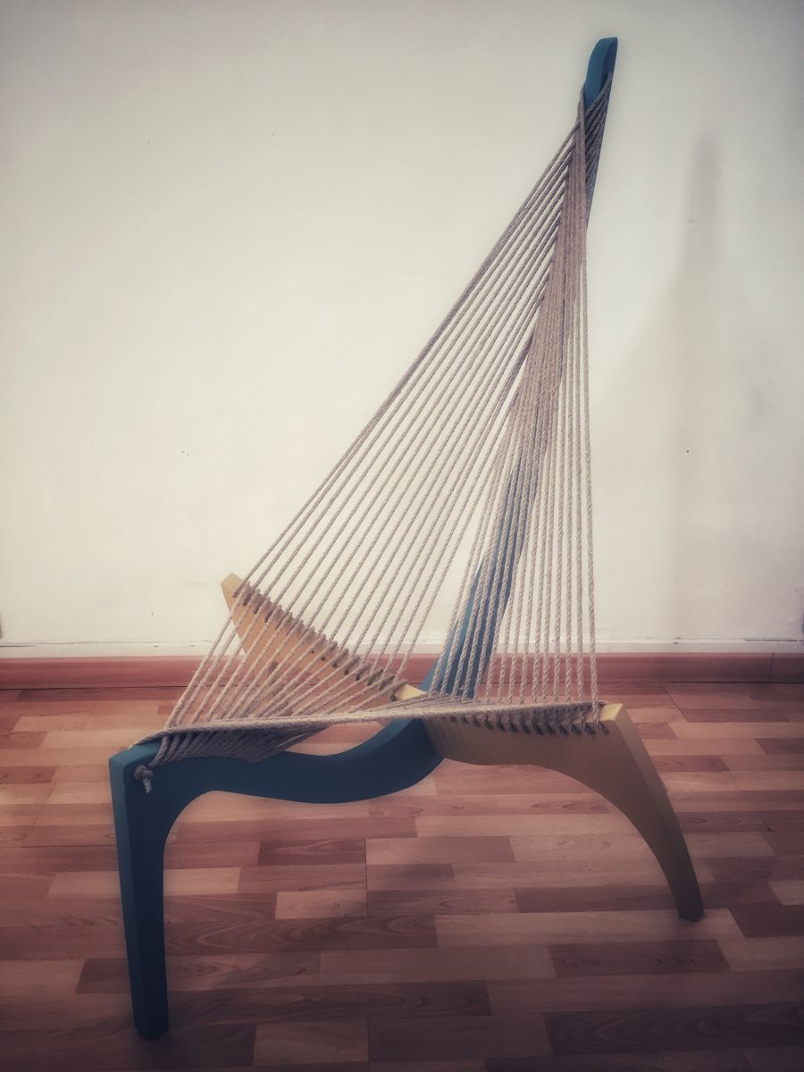 Ce fauteuil d'inspiration Harp Chair est de couleur jaune et bleu mat peint sur bois contreplaqué.