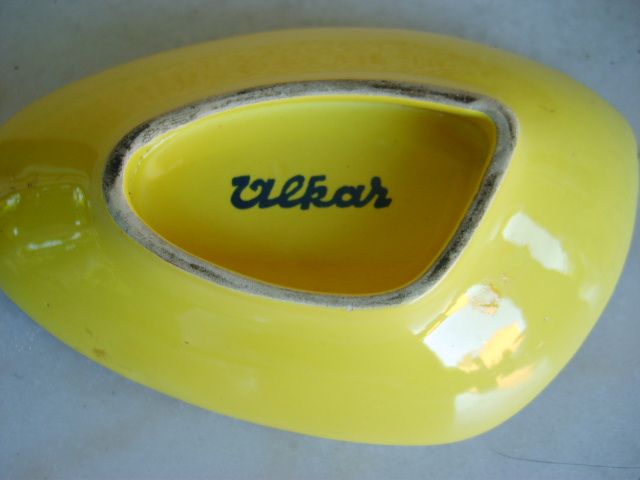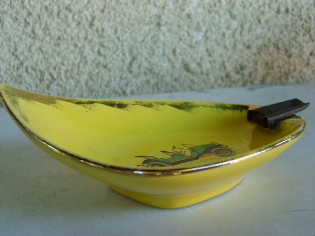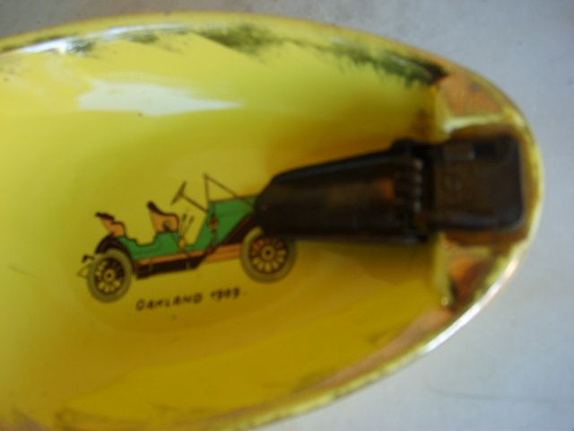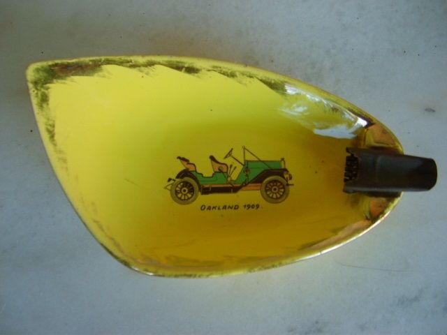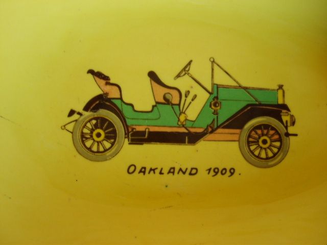 De forme ovoïde, jaune vif, cerclé de dorure avec au centre un véhicule ancien : Oakland 1909.