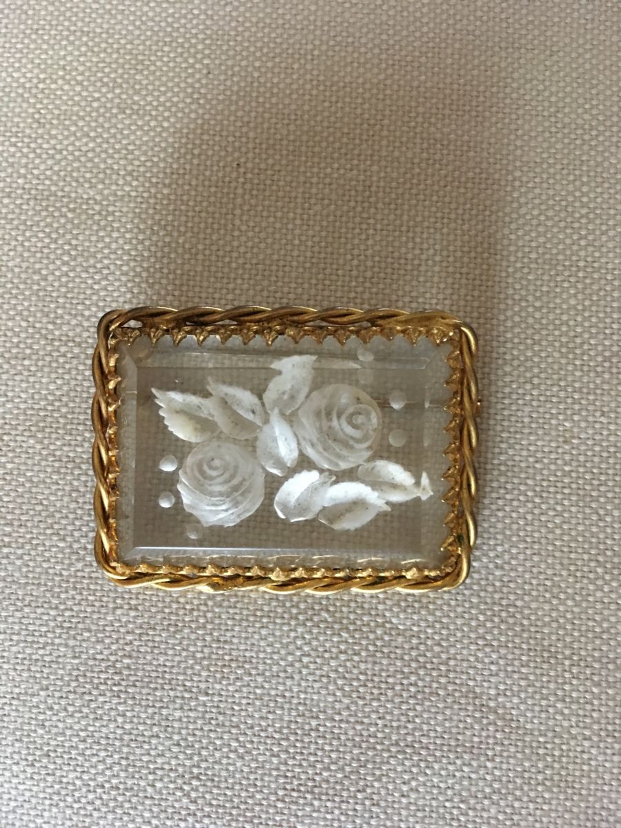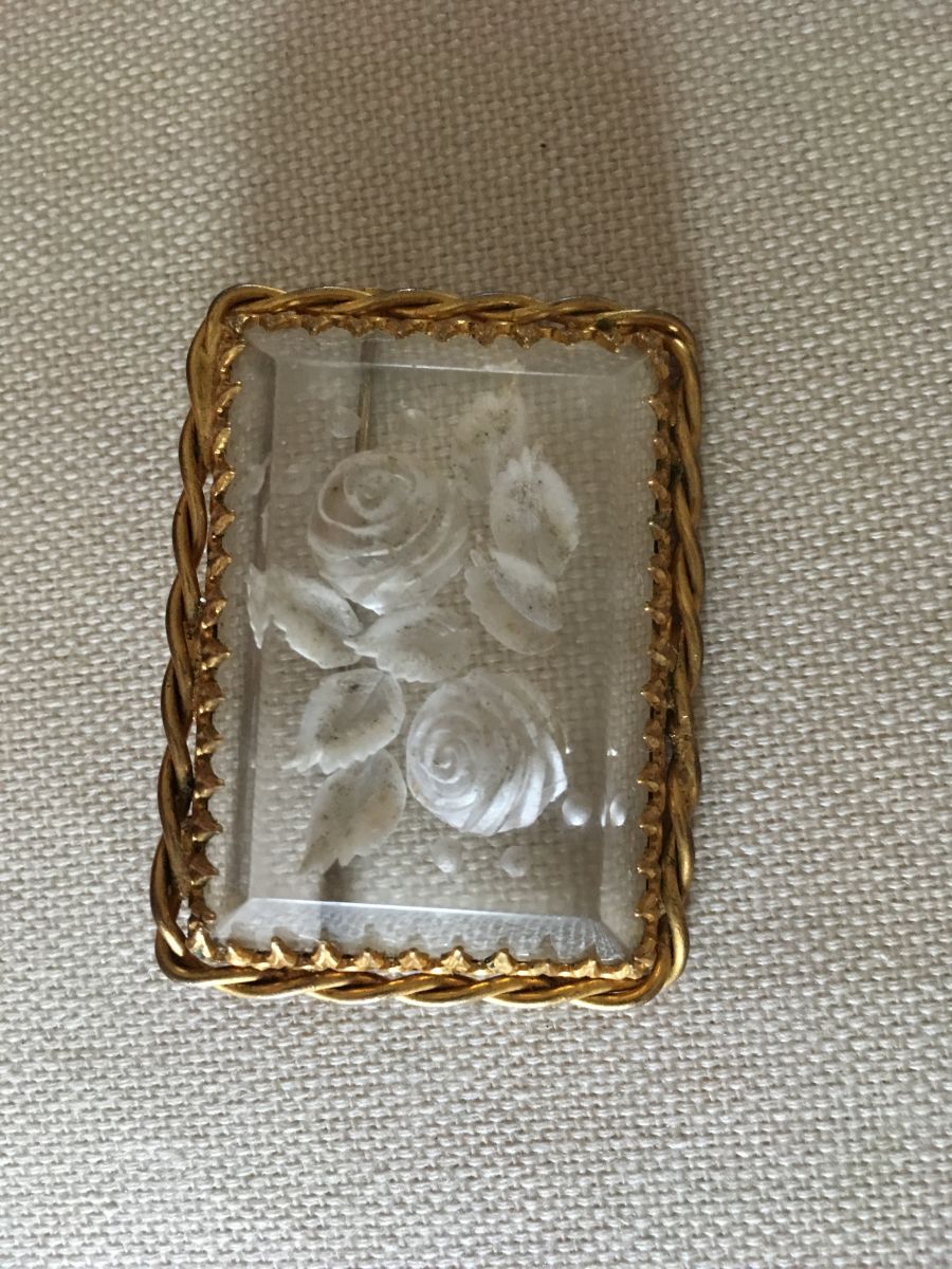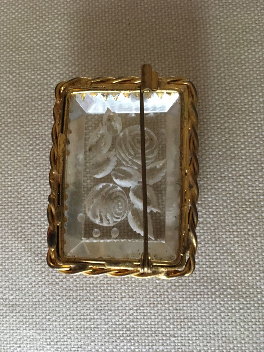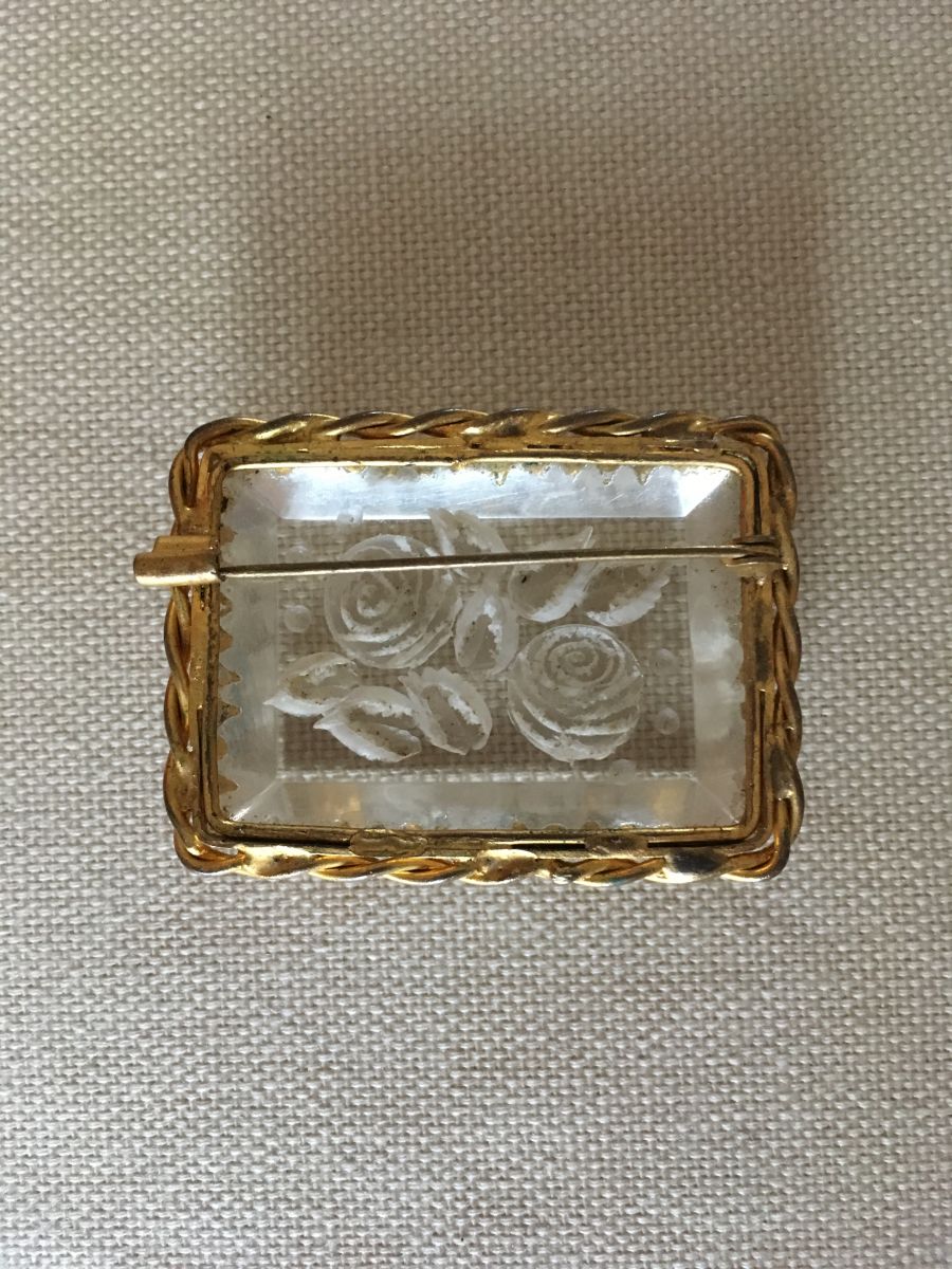 Broche en métal doré, en plexi glace translucide, sculptée à l’envers.