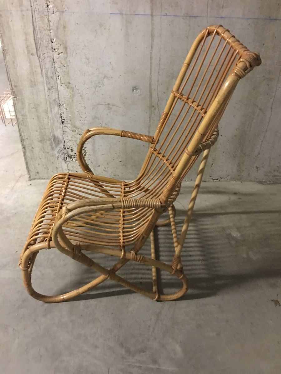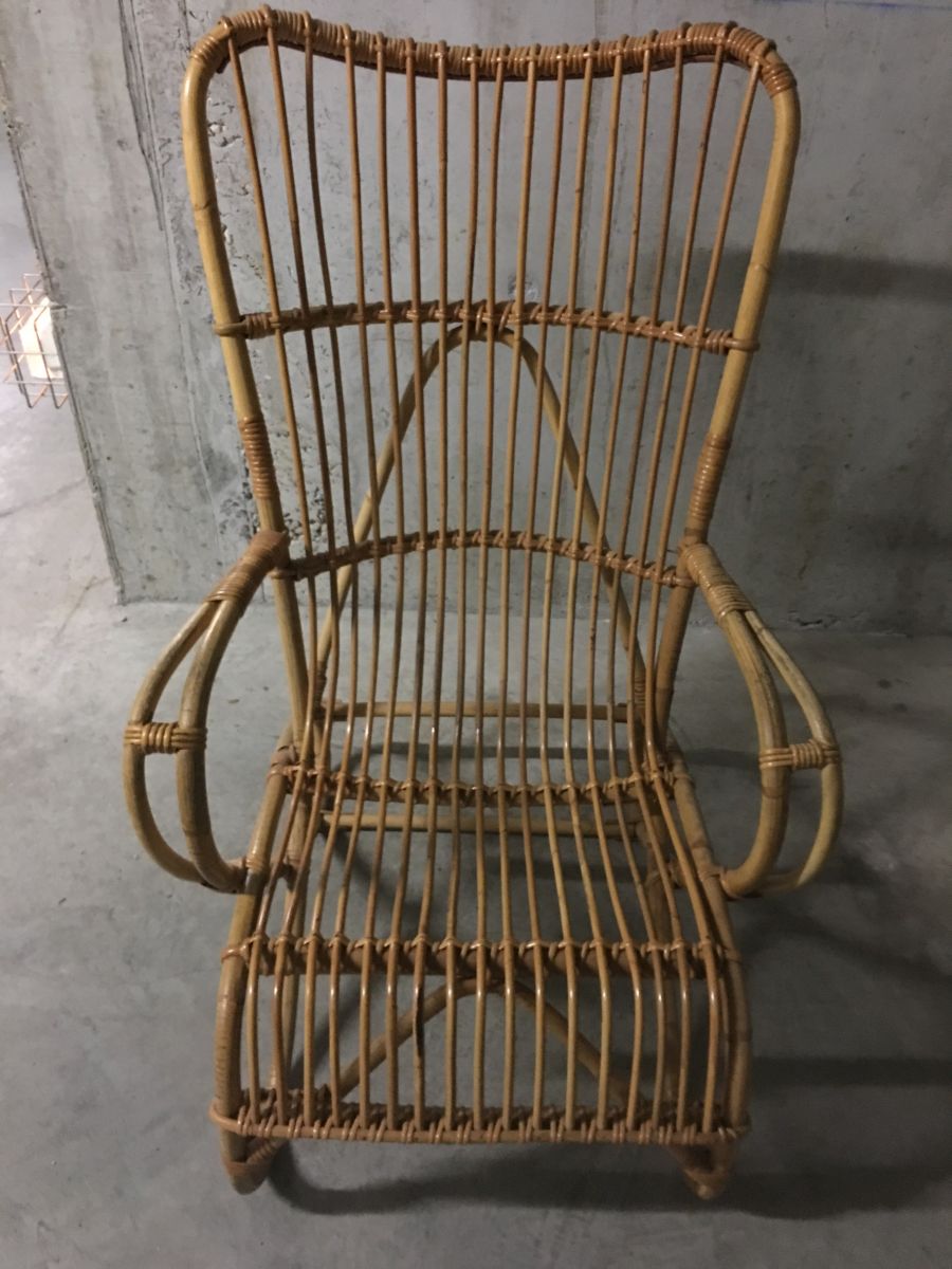 Magnifique fauteuil en rotin des années 60, coussin d’origine amovible en velours marron foncé, aucun manque, dimensions (cm) : L.67xH.103xP.73, hauteur assise 37cm, assise 48x40cm, très bon état.