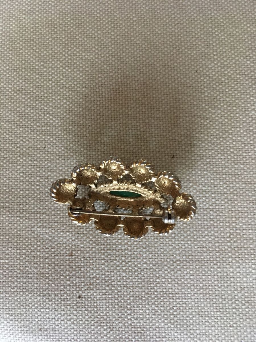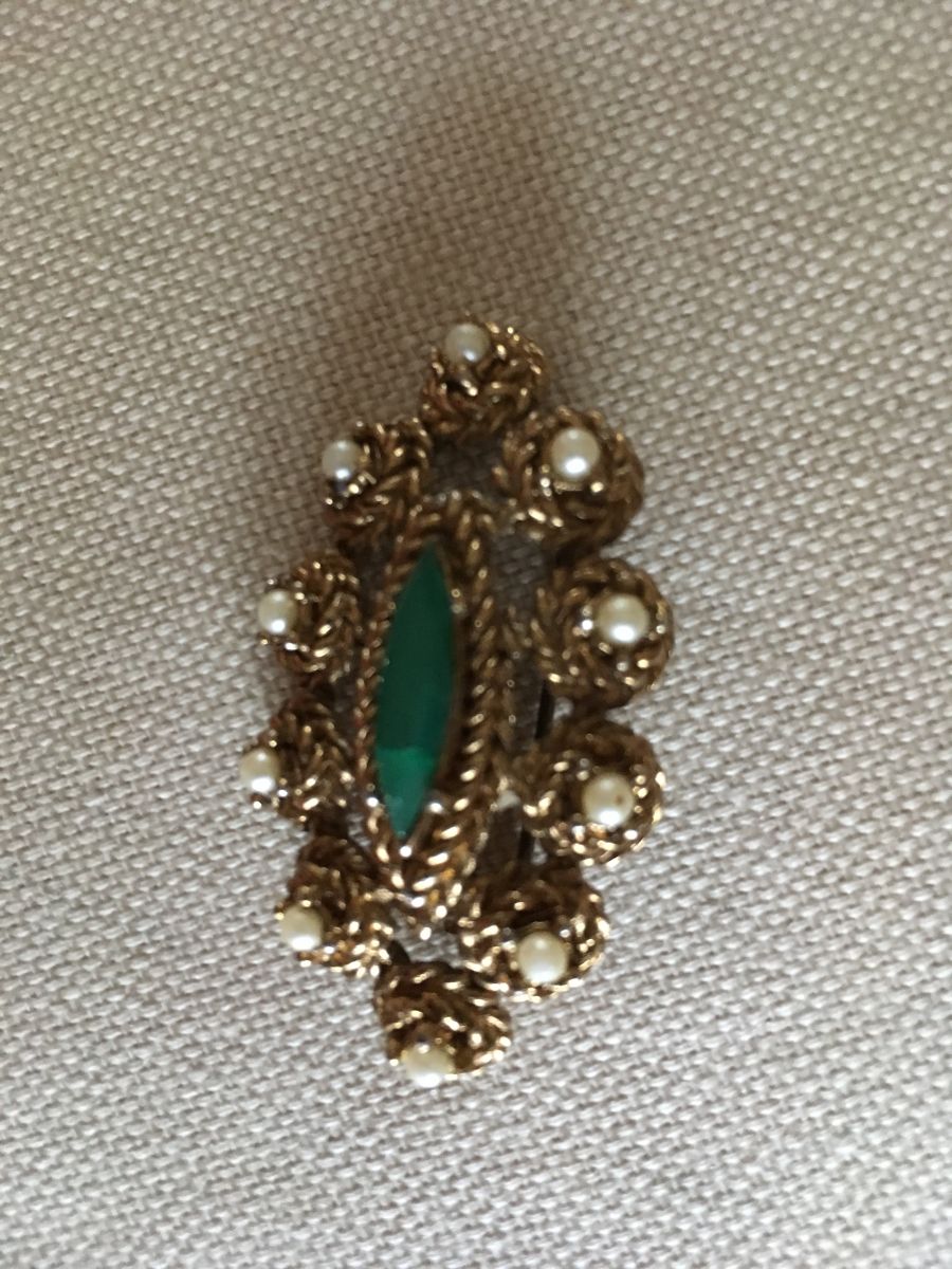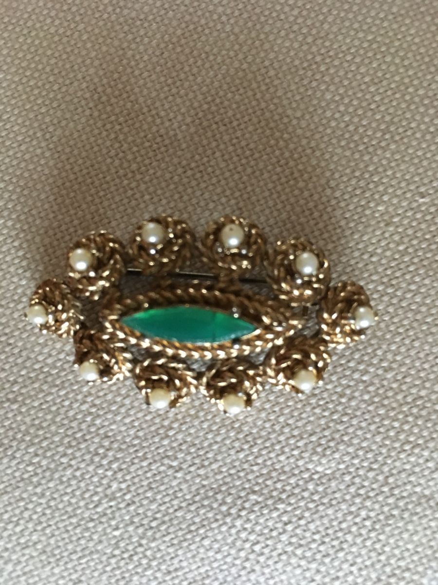 Broche vintage en métal doré, perles et pierre verte fendue.