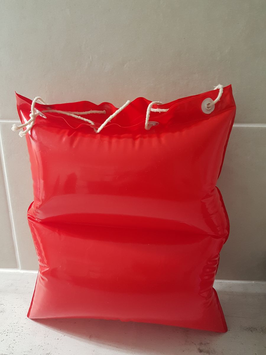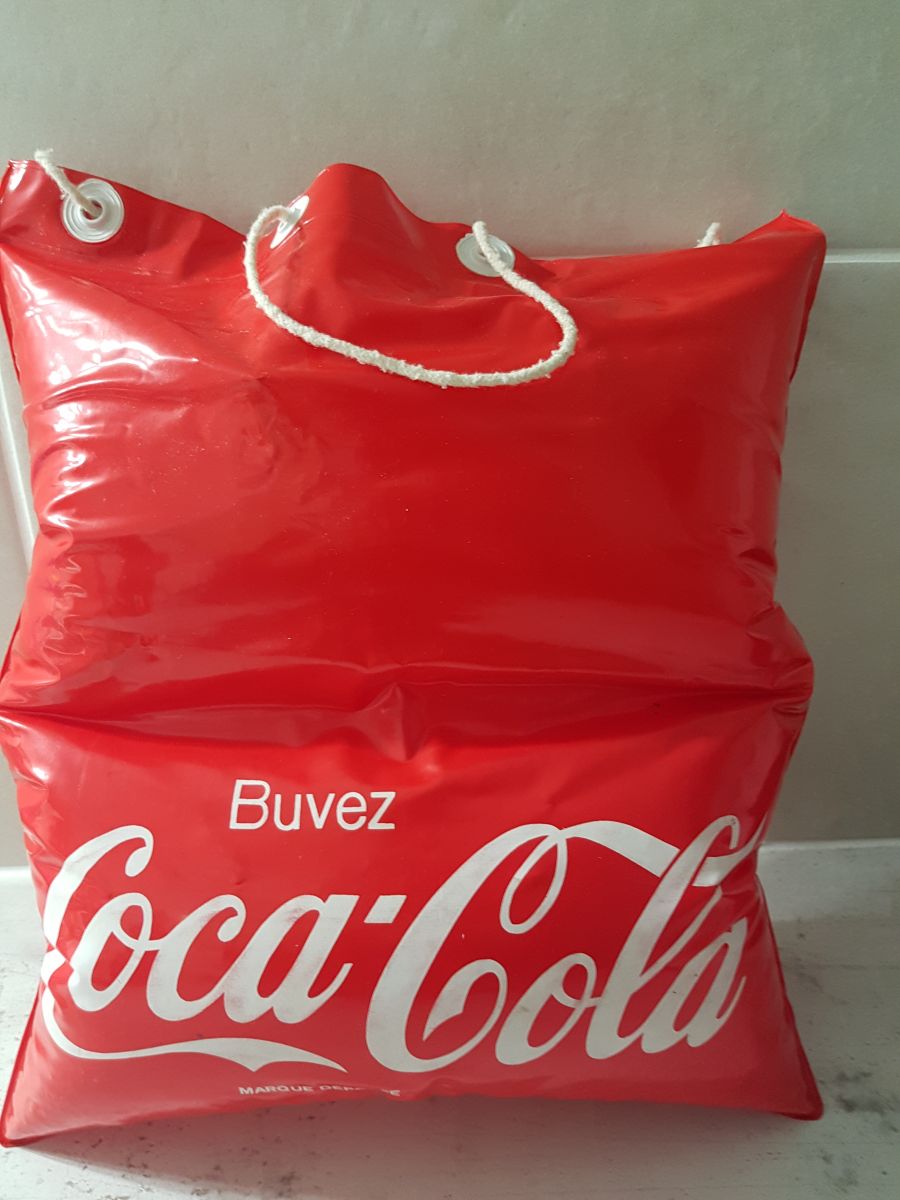 Sac de plage en plastique (style matelas de piscine) qui se gonfle et se transforme en oreiller de plage par exemple. ... année 80.