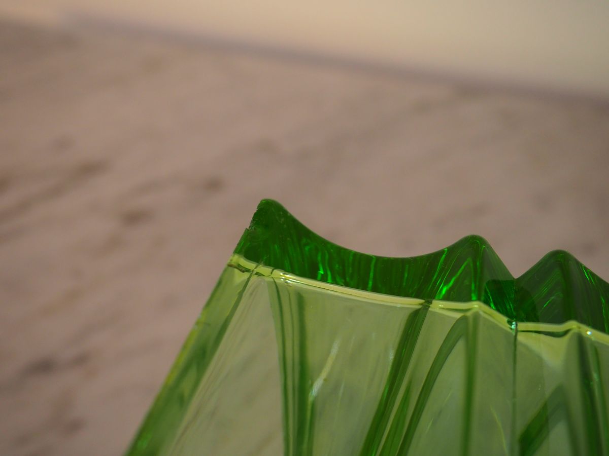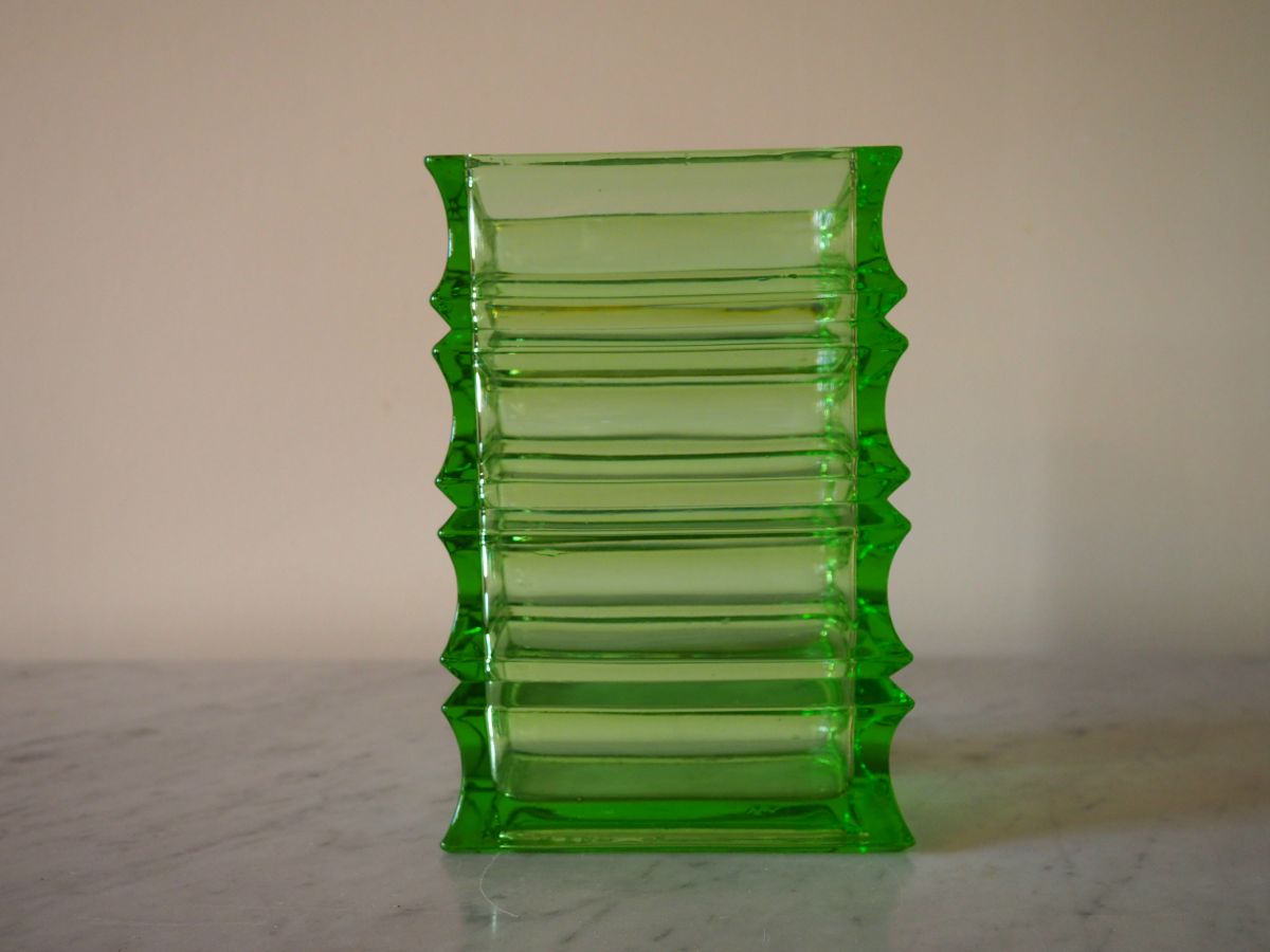Vase vert transparent années 50 en verre épais avec un léger éclat, visible sur la photo.