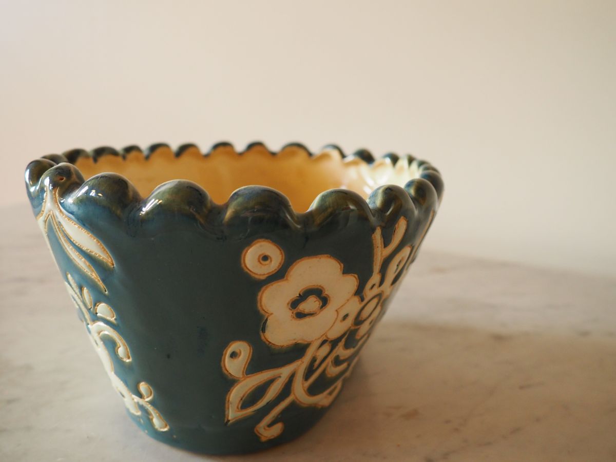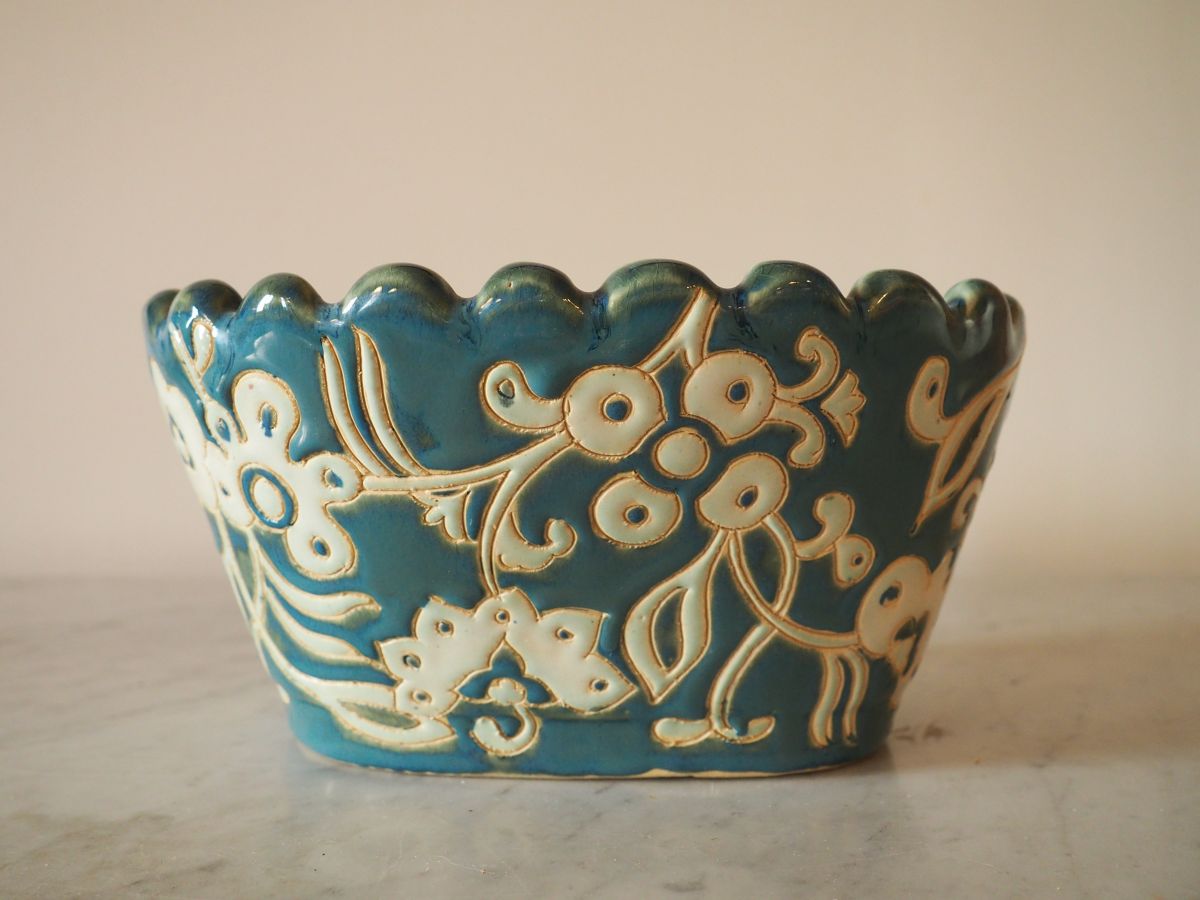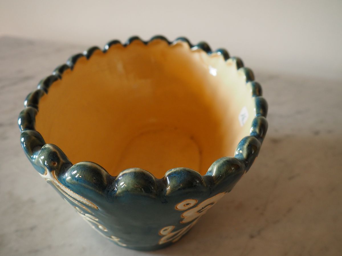 Pot à fleurs en terre cuite émaillée, motifs fleuris