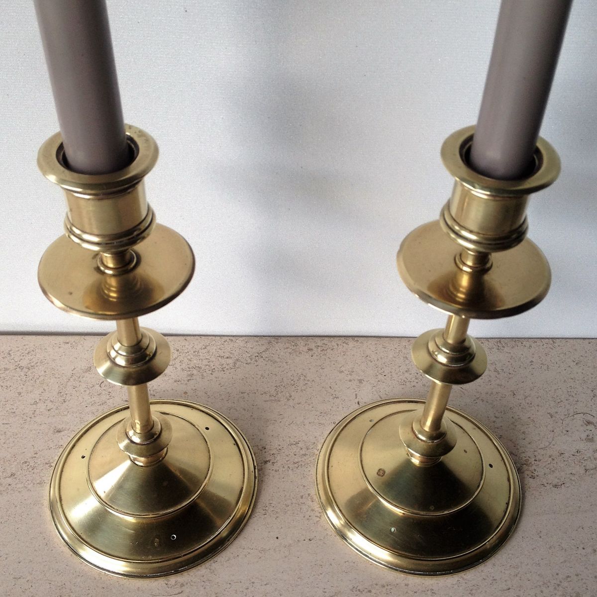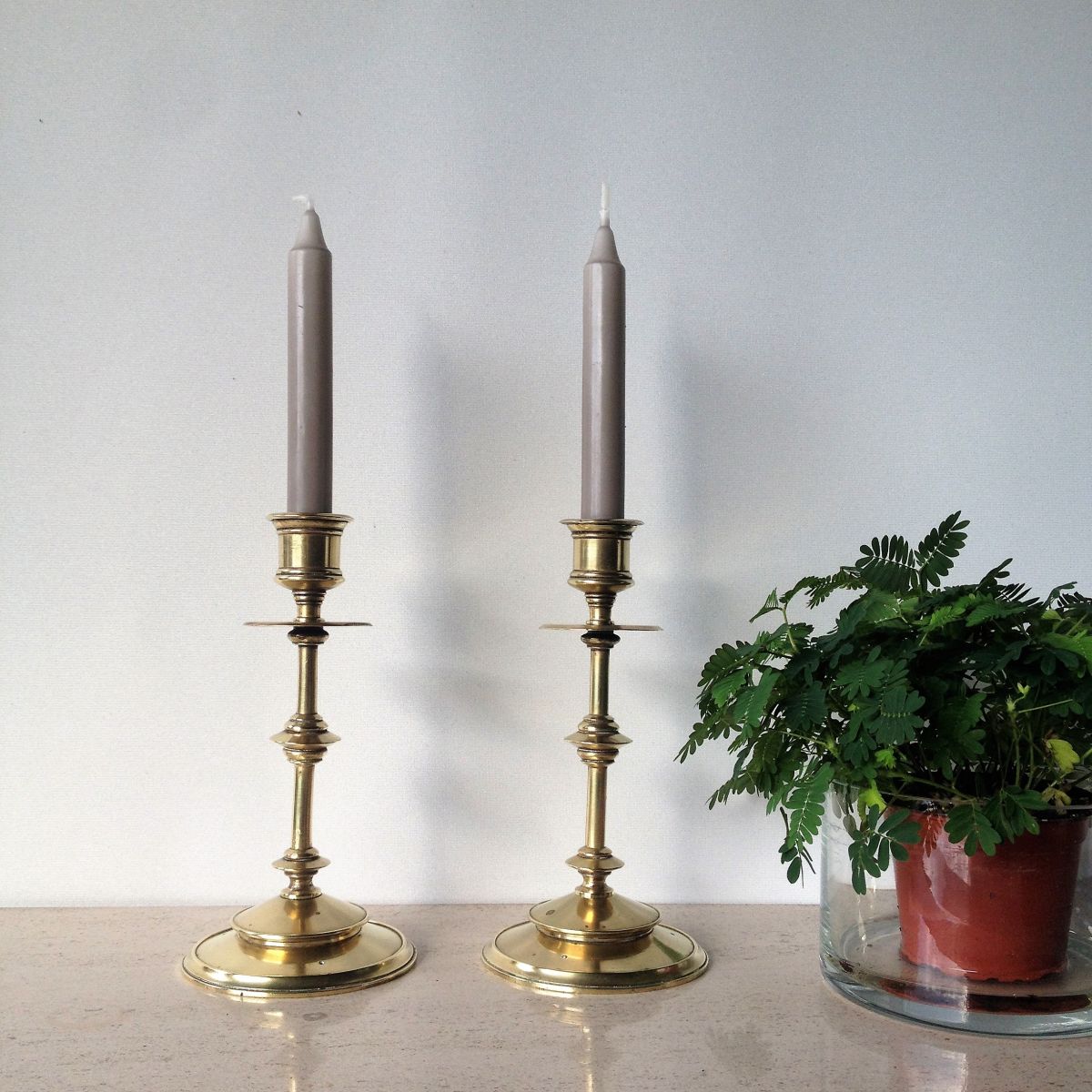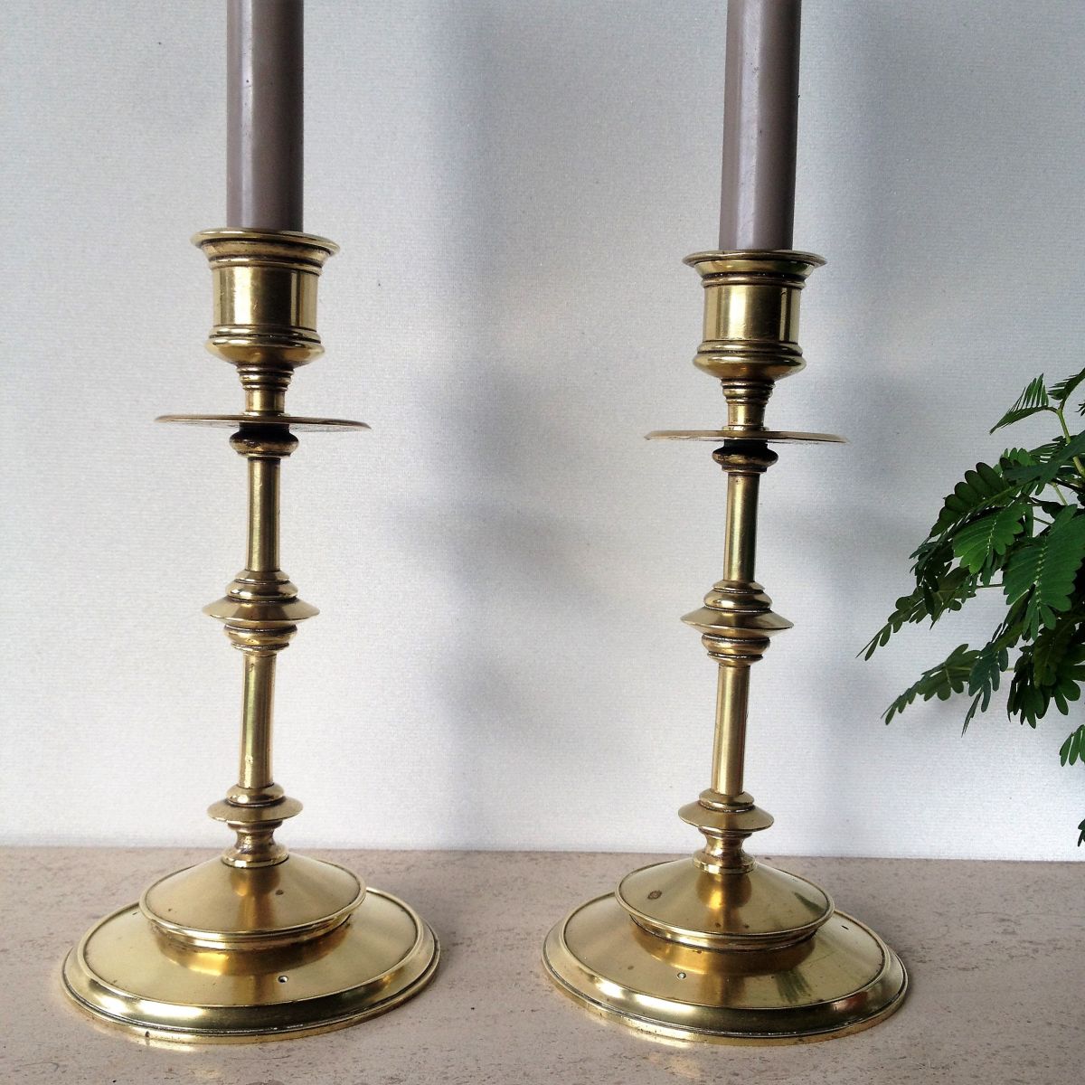 Superbes paires de bougeoirs en laiton massif. Classique et indémodables, ils illumineront vos tables de fête et se fonderont dans tout type d'intérieur. Hauteur 20 cm ; diamètre du pied 10 cm ; poids d'un bougeoir 500 gr
