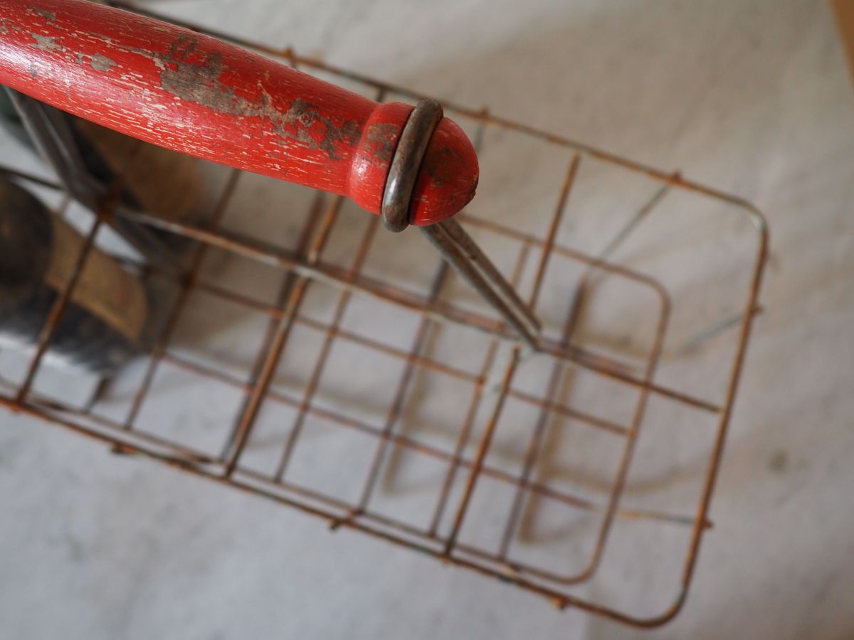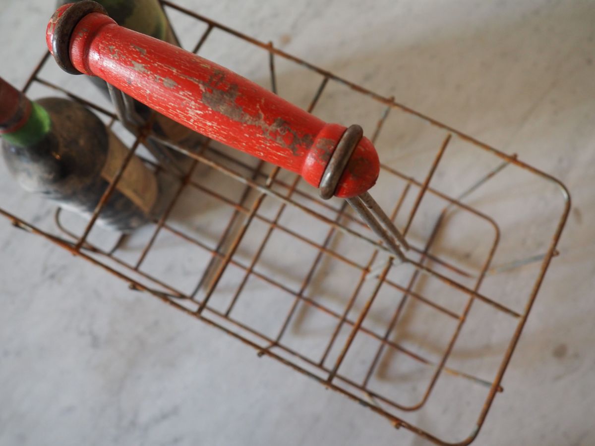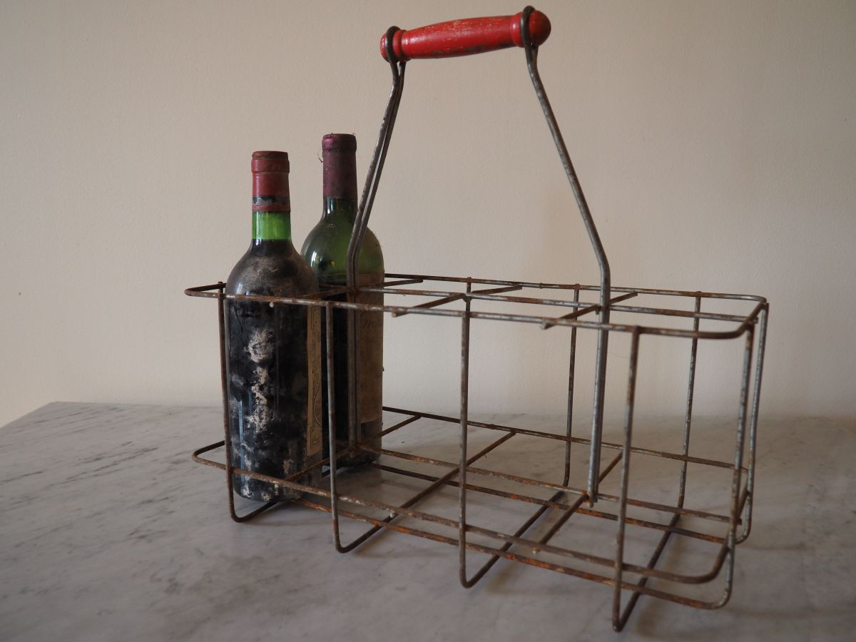 Porte bouteilles en métal rouillé, poignée bois, 8 cases