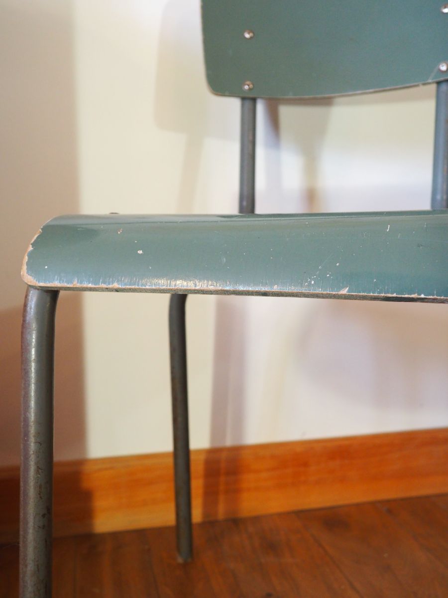 Structure métallique. Assise et dossier plaquage bois avec patine vert de gris.
