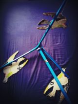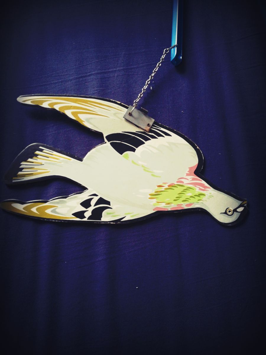 Support en métal bleu sur lequel s'accroche 3 pigeons sérigraphiés en carton à l'aide de chaînettes. ( ailes de pigeon avec marque de pliage mais sans gêne pour jouer )
