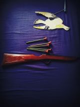 Un fusil et 5 fléchettes embout caoutchouc ( embouts usagés ).