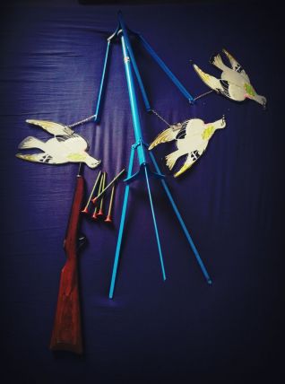Composé d'un trépied et d'une tige filetée qui dans son mouvement entraîne les pigeons mimant ainsi leur vol et donc l'occasion de les atteindre avec la fléchette.