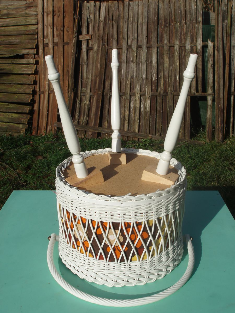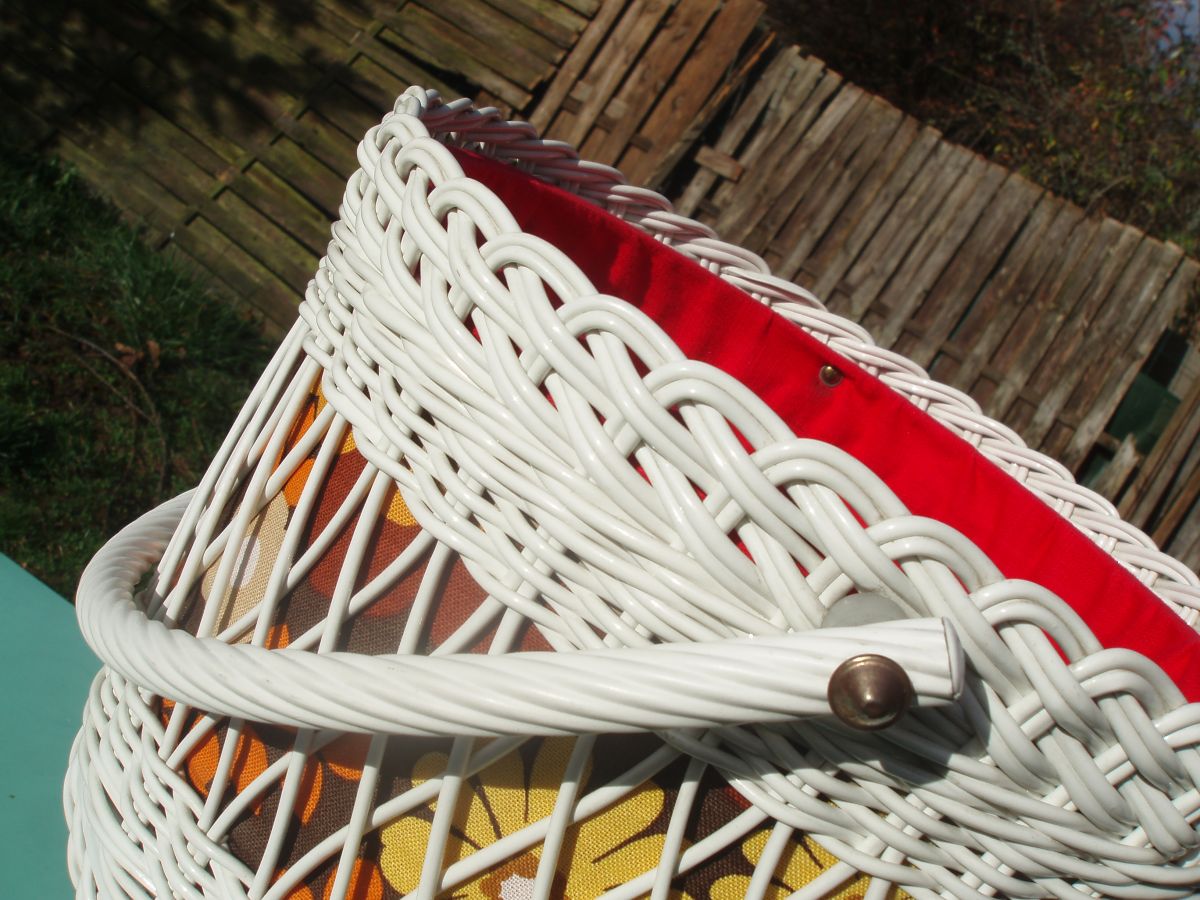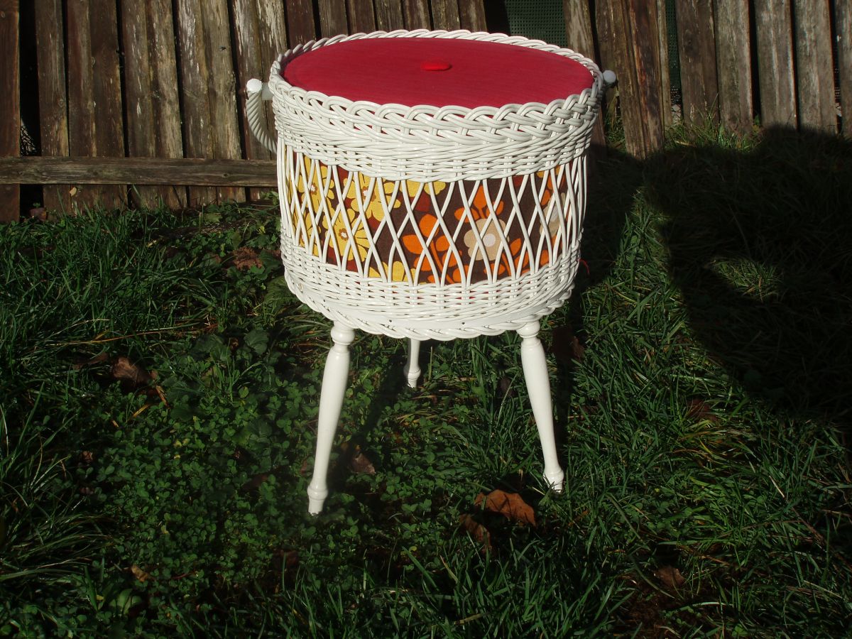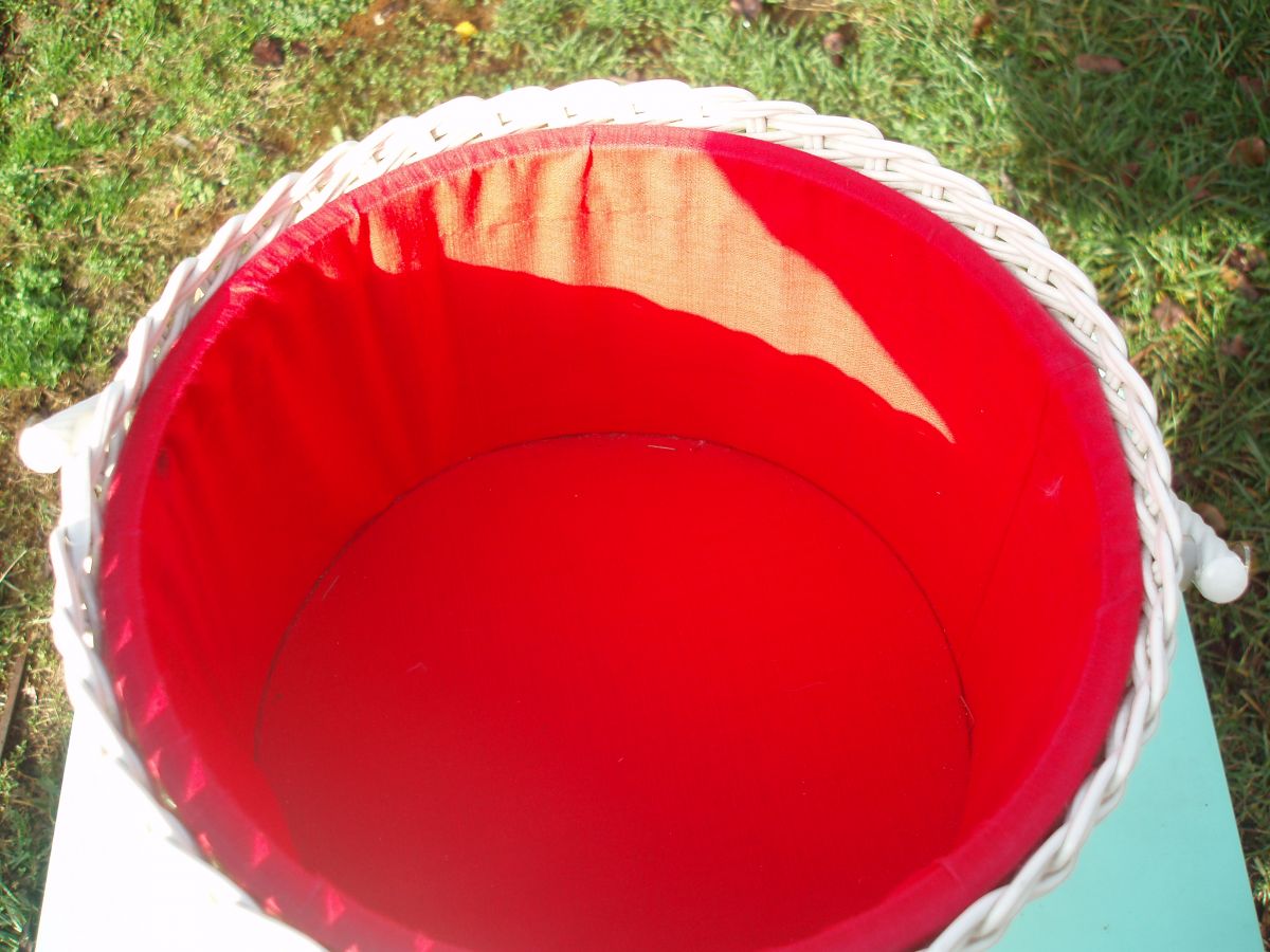 l'article est il encore disponible? y a t'il des rénovations à y faire , par exemple peinture blanche et le tissu rouge du couvercle est il en bon état ou un peu usé ? L'anse est elle en rotin ou en plastique.?..