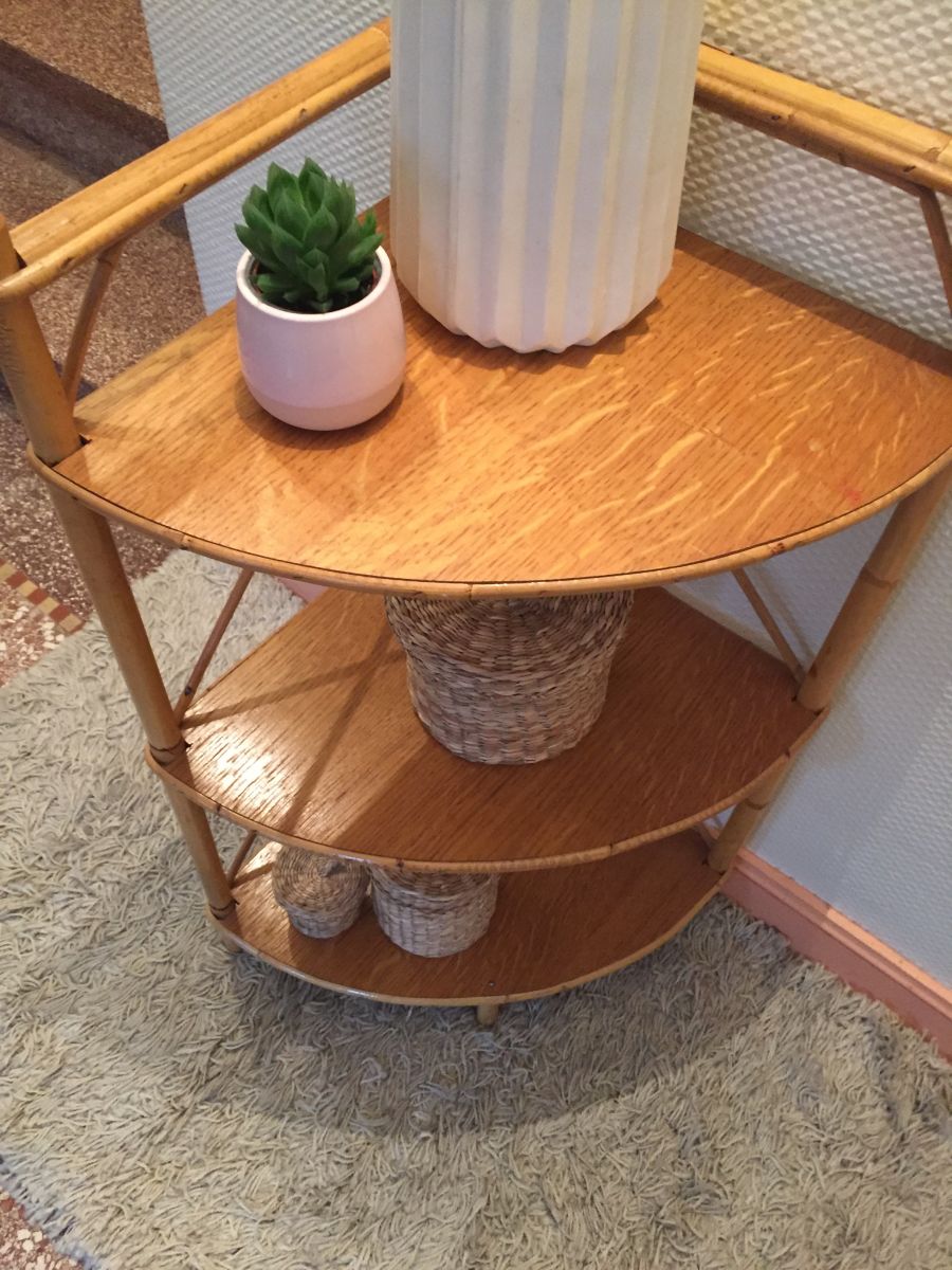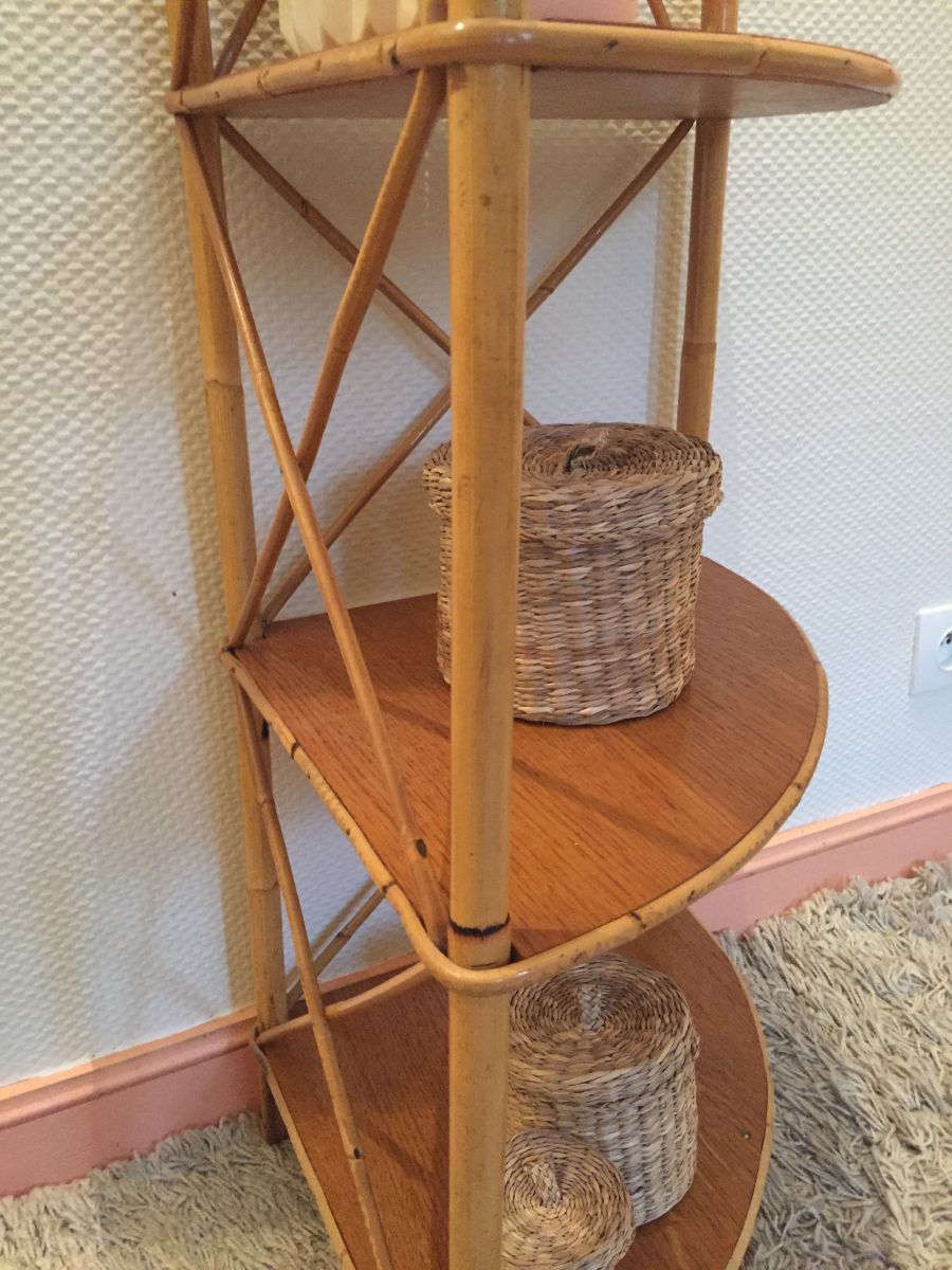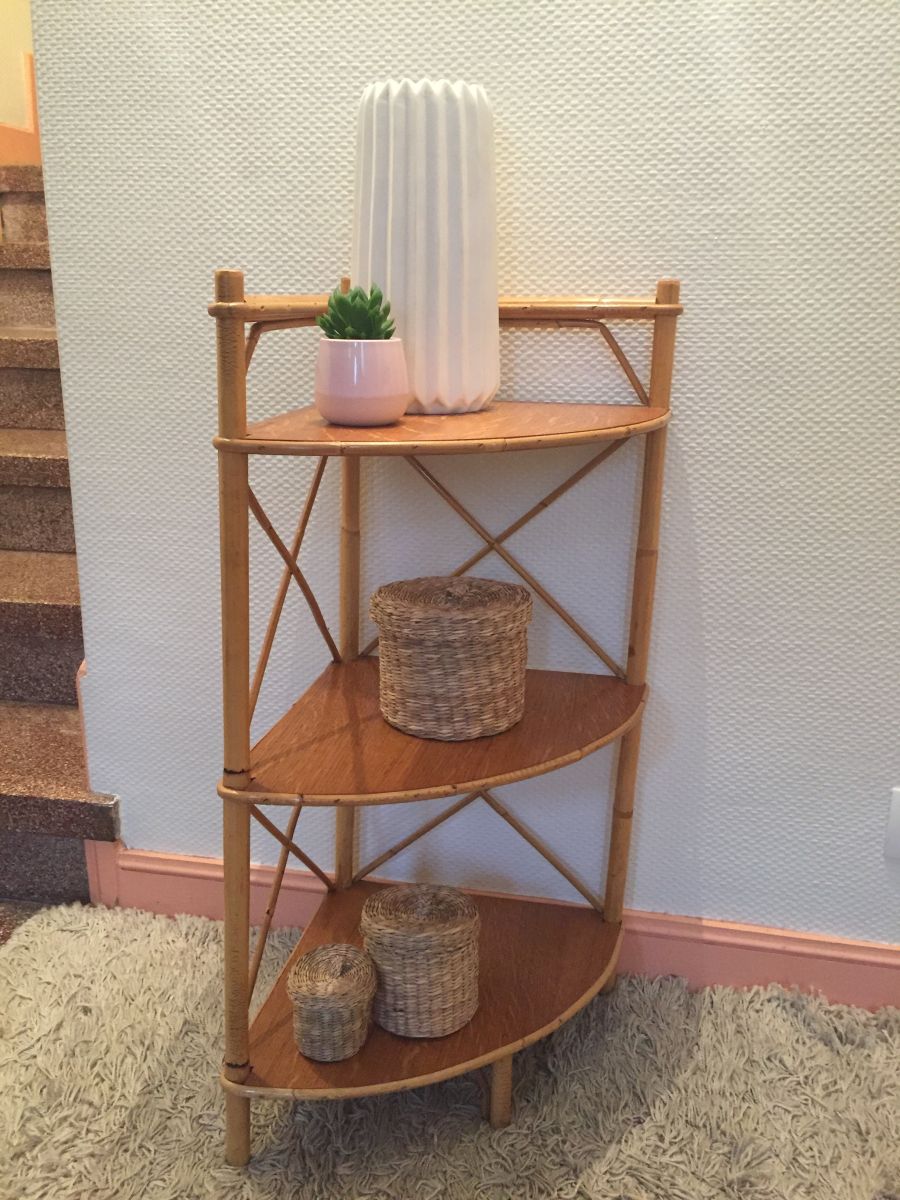 Meuble d’angle en rotin caramel avec trois tablettes.