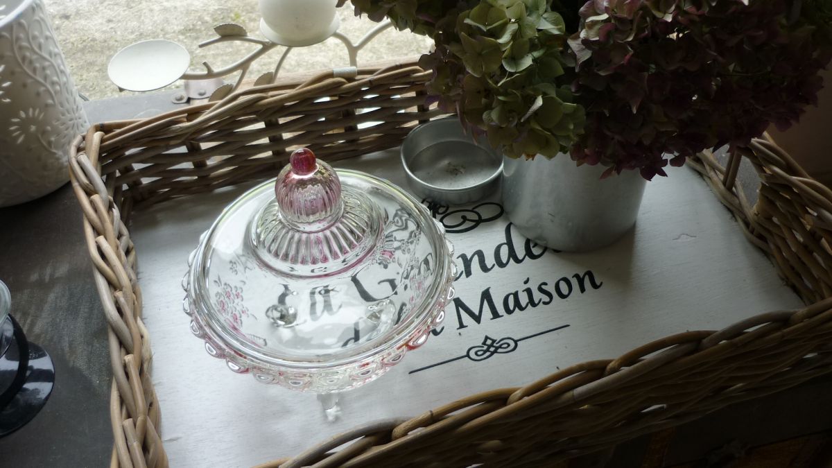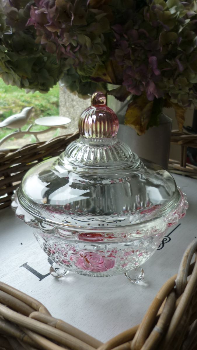 Bonbonnière toute en transparence ajourée d'une couronne de roses. Hauteur 15 centimètres environ
