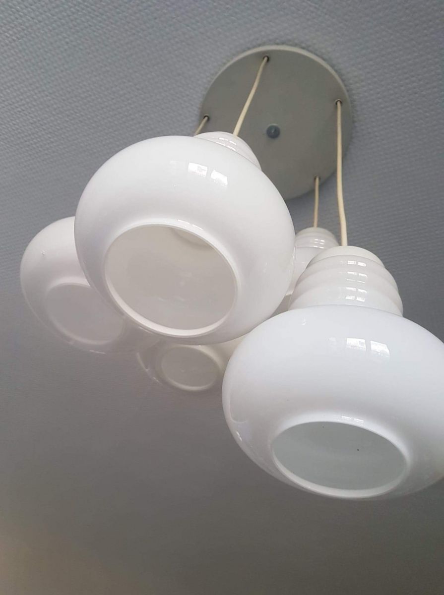 suspension plafonnier 5 globes en cascade en verre opaline blanc représentatif des années 70