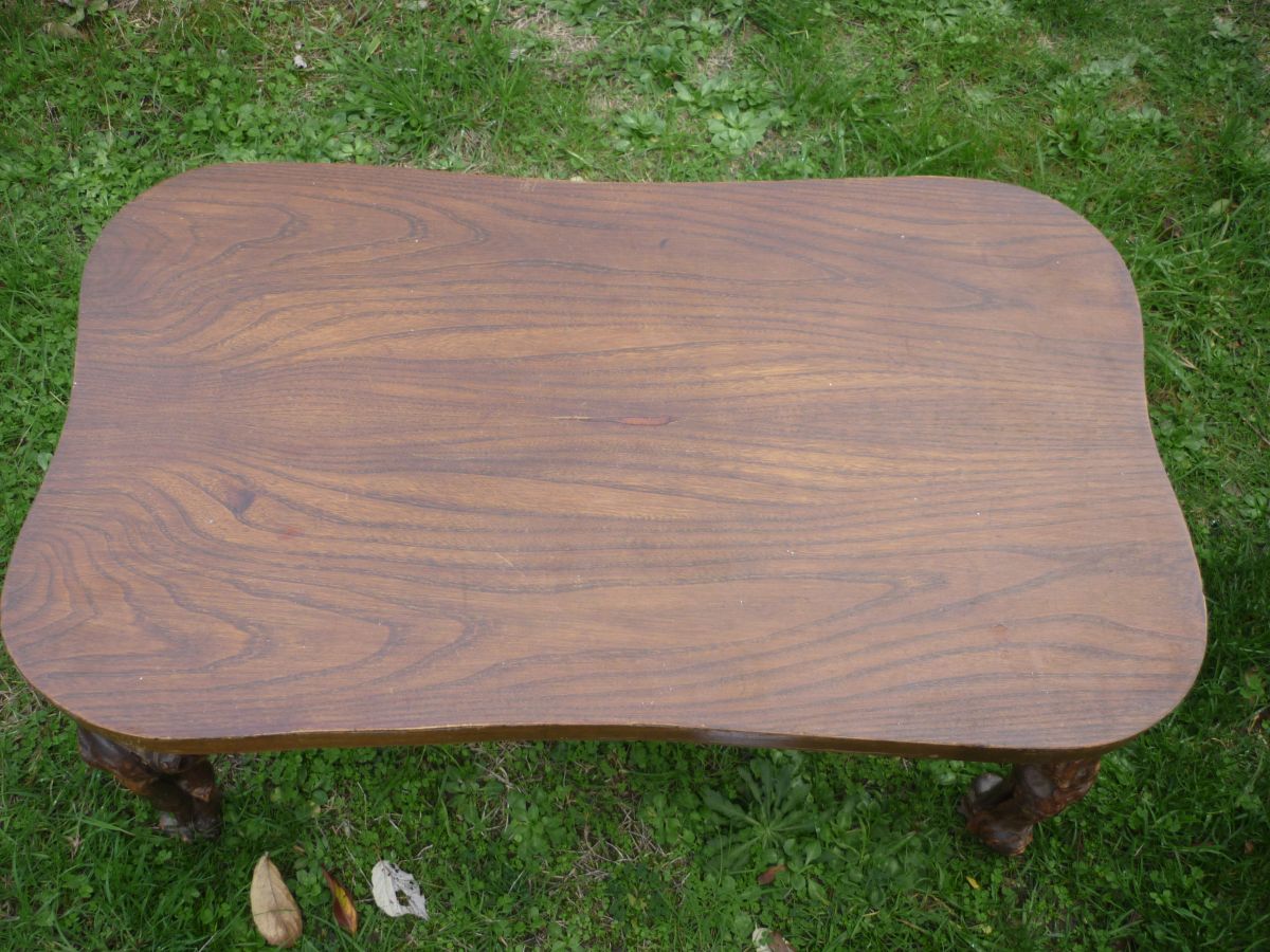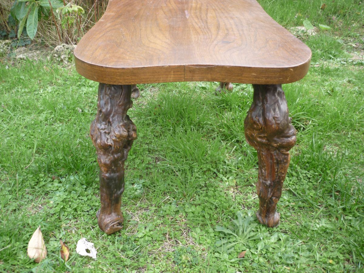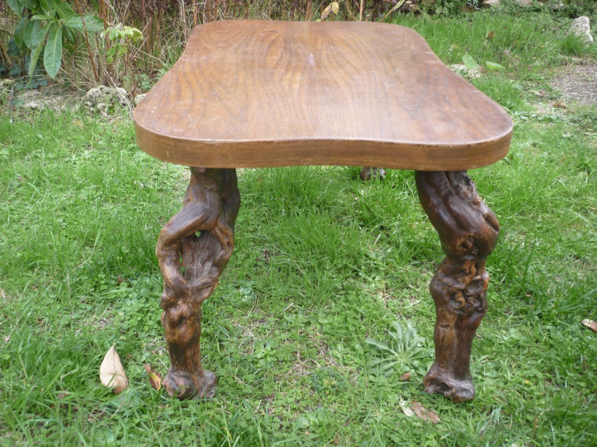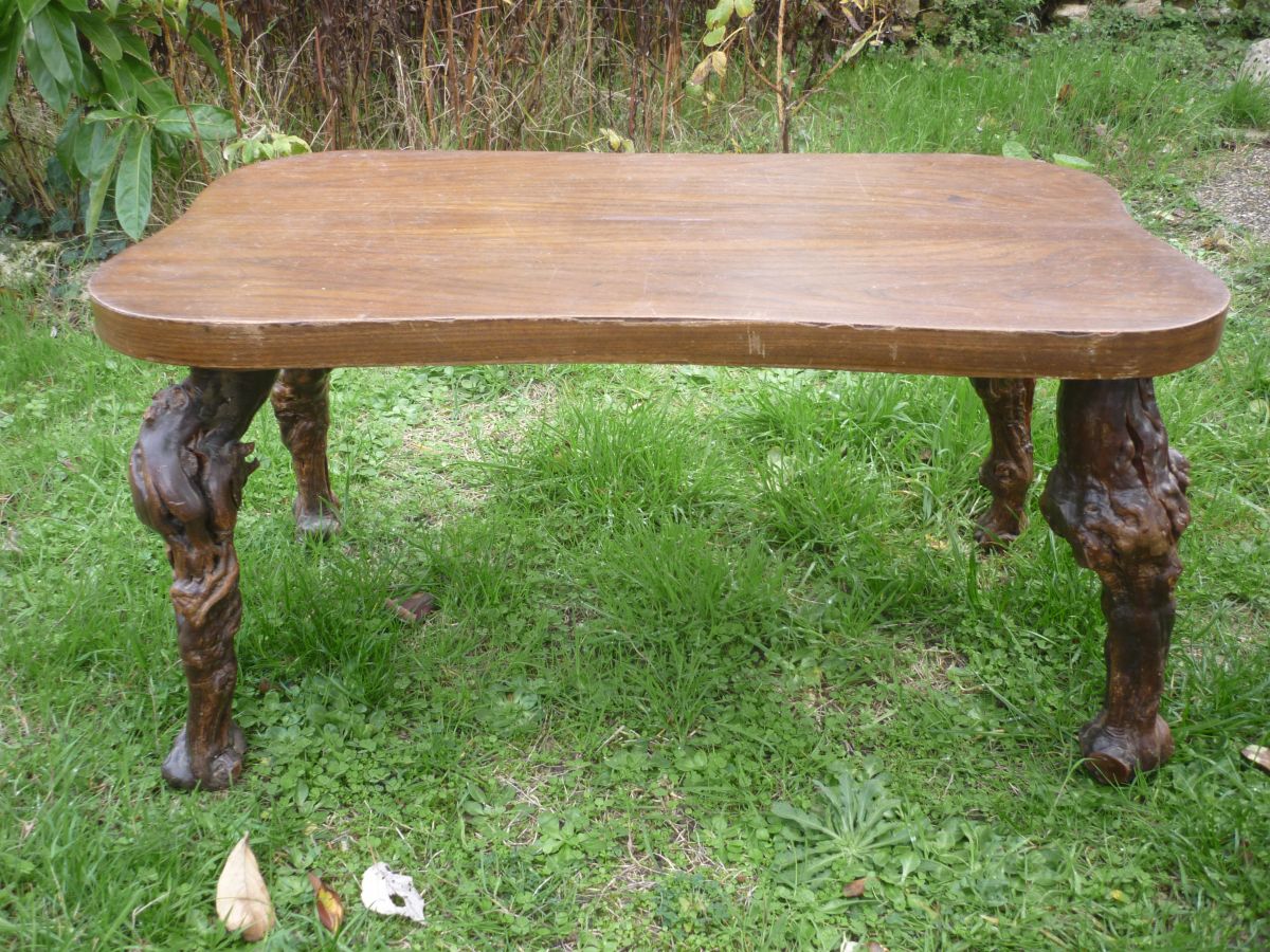 Table basse vintage avec 4 pieds formés de ceps de vigne,plateau en bois recouvert de contreplaqué:dimensions 76x45x39cms:dans son jus,etat d'usage du plateau et du pourtour(voir photos)