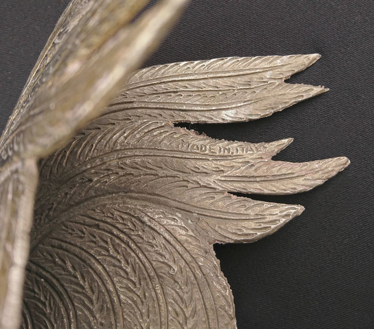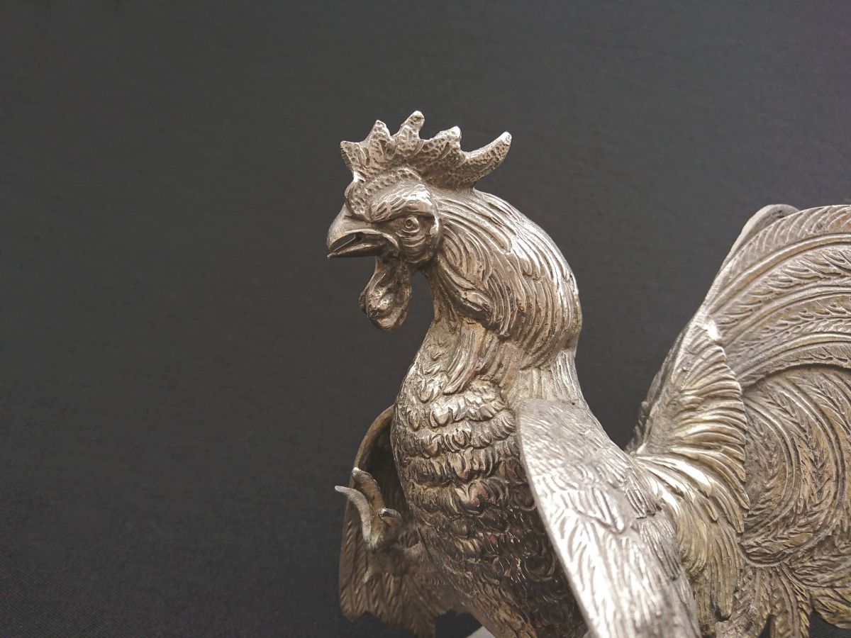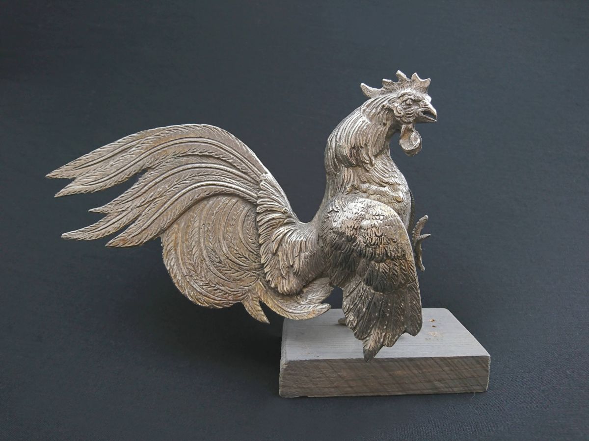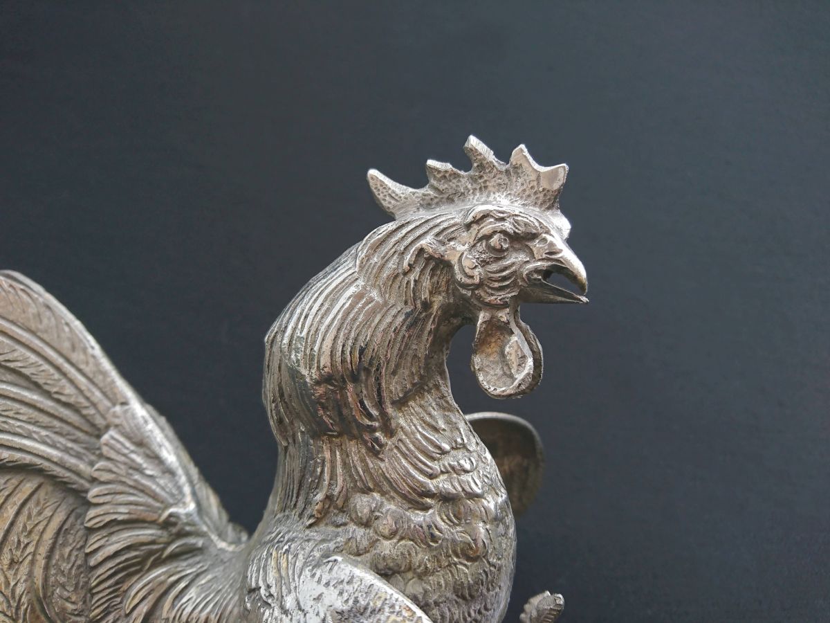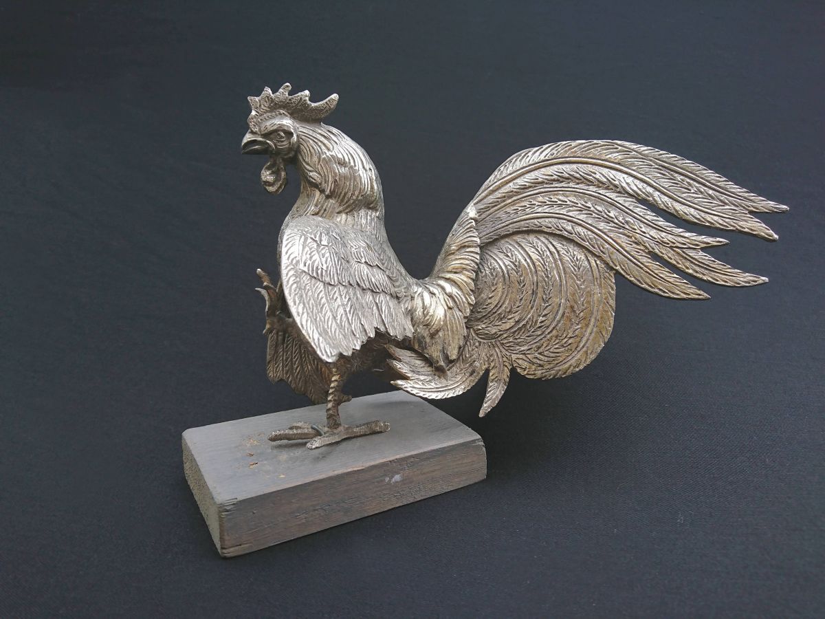 Superbe sculpture de coq de combat en laiton argenté, beaux détails et très belle apparence. Patine argentée, usure d'age et d'usage. Gravé "Made in Italy" sous l'aile droite (photo 6).