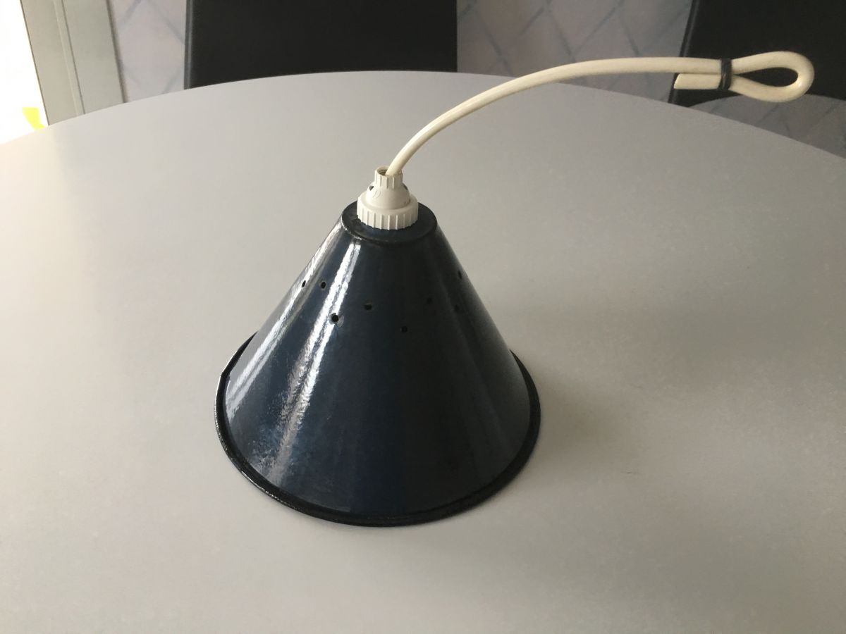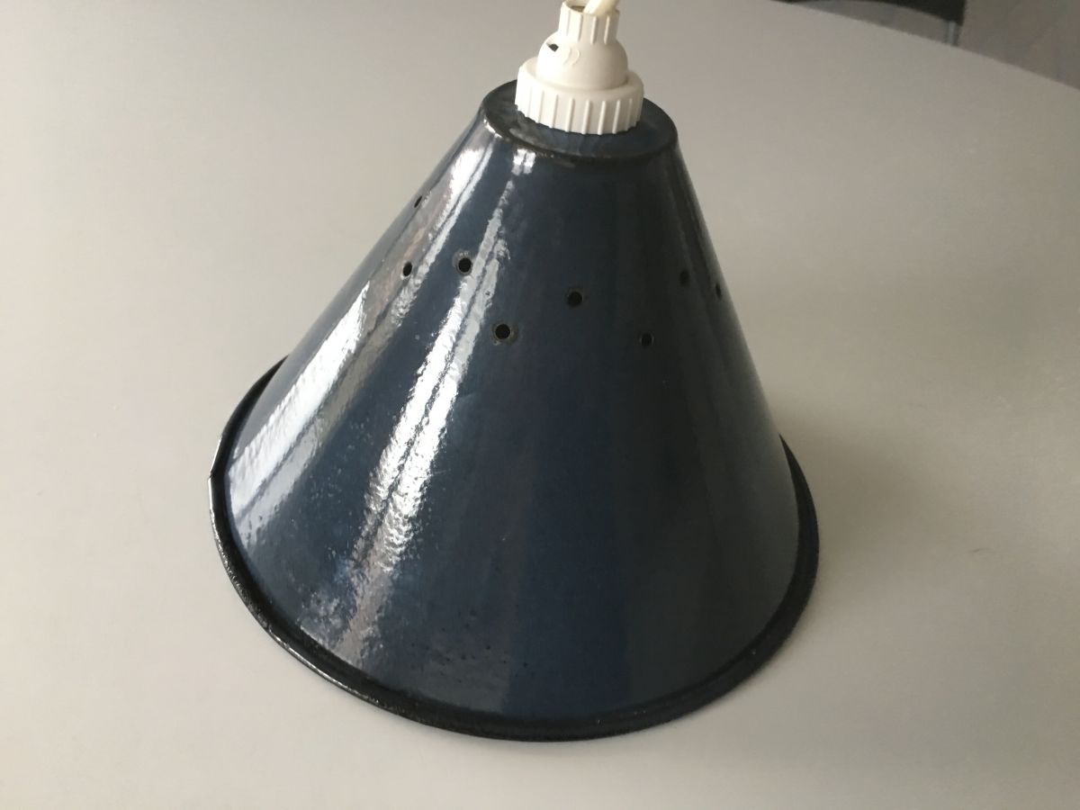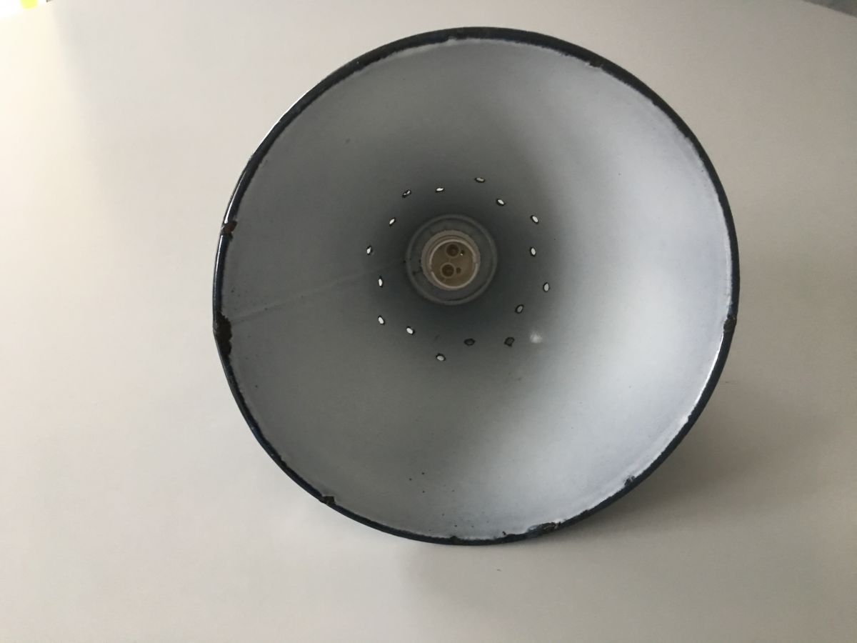 Petite suspension industrielle des années 60 en tôle émaillée bleu gris et blanc, quelques petits éclats (voir photos) qui contribuent au vécu et au charme de la lampe, parfait état de marche, hauteur 15cm, diamètre 19cm, douille et fil électrique changés, bon état.