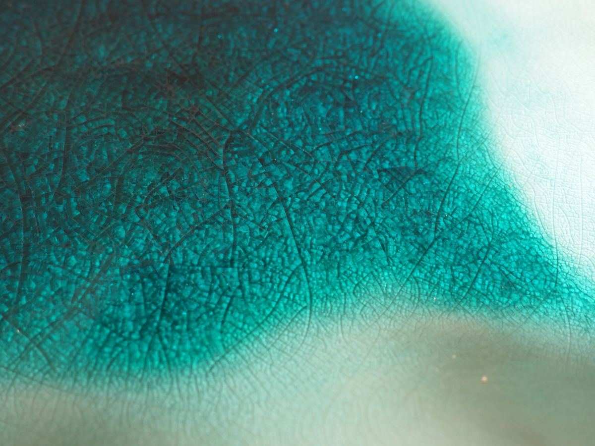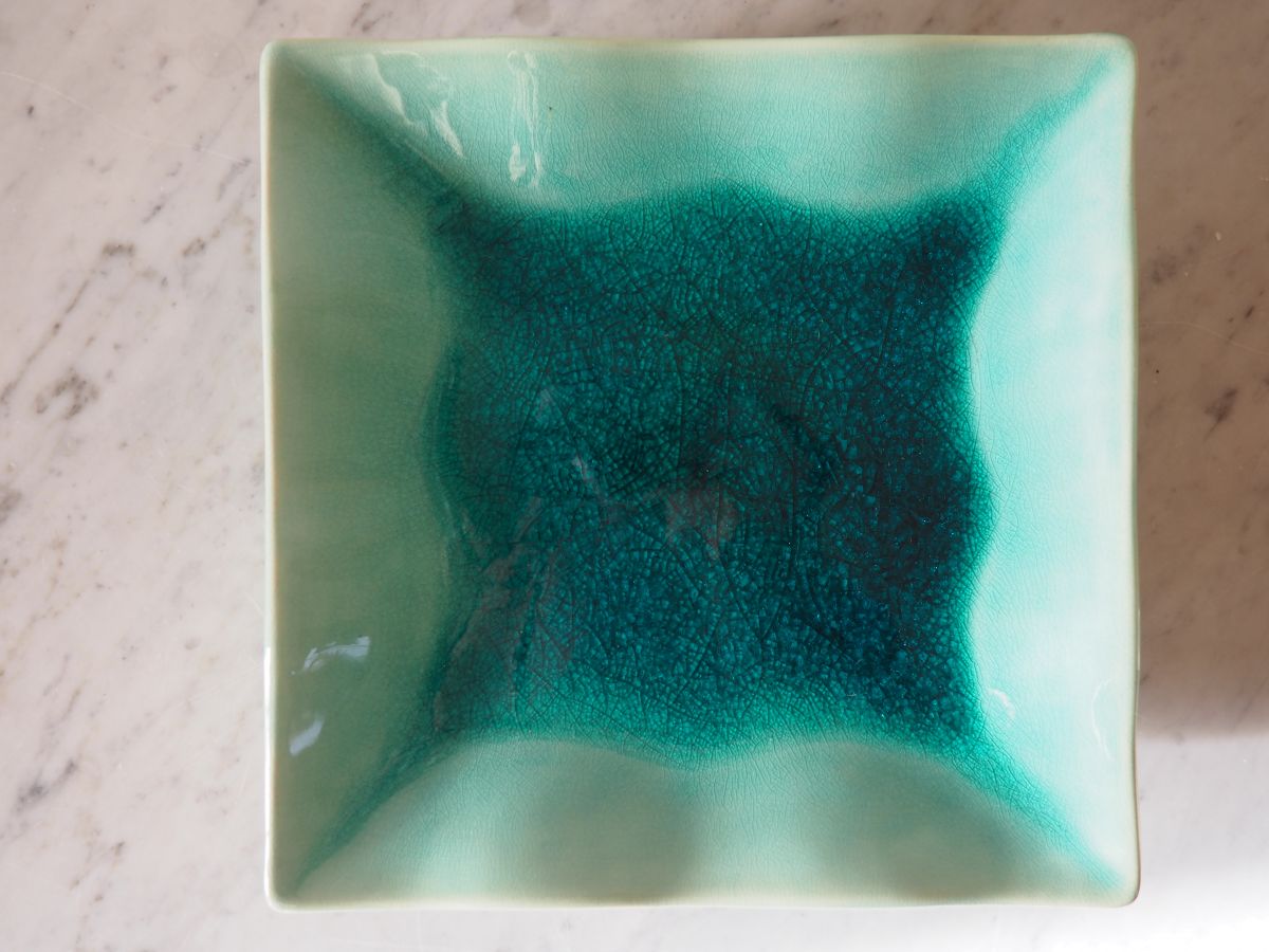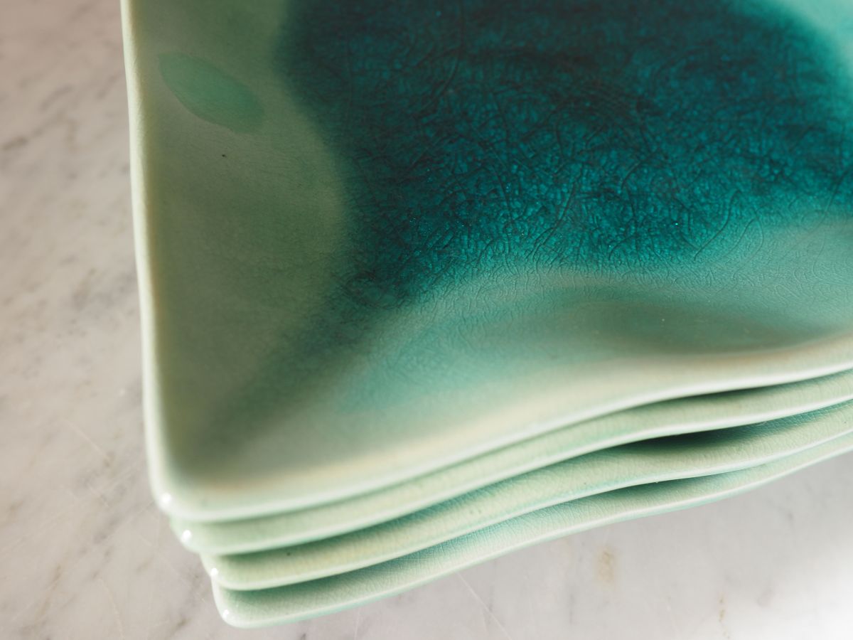 Lot de 12 assiettes émeraude de forme carrée, en céramique vernie, effet craquelé.