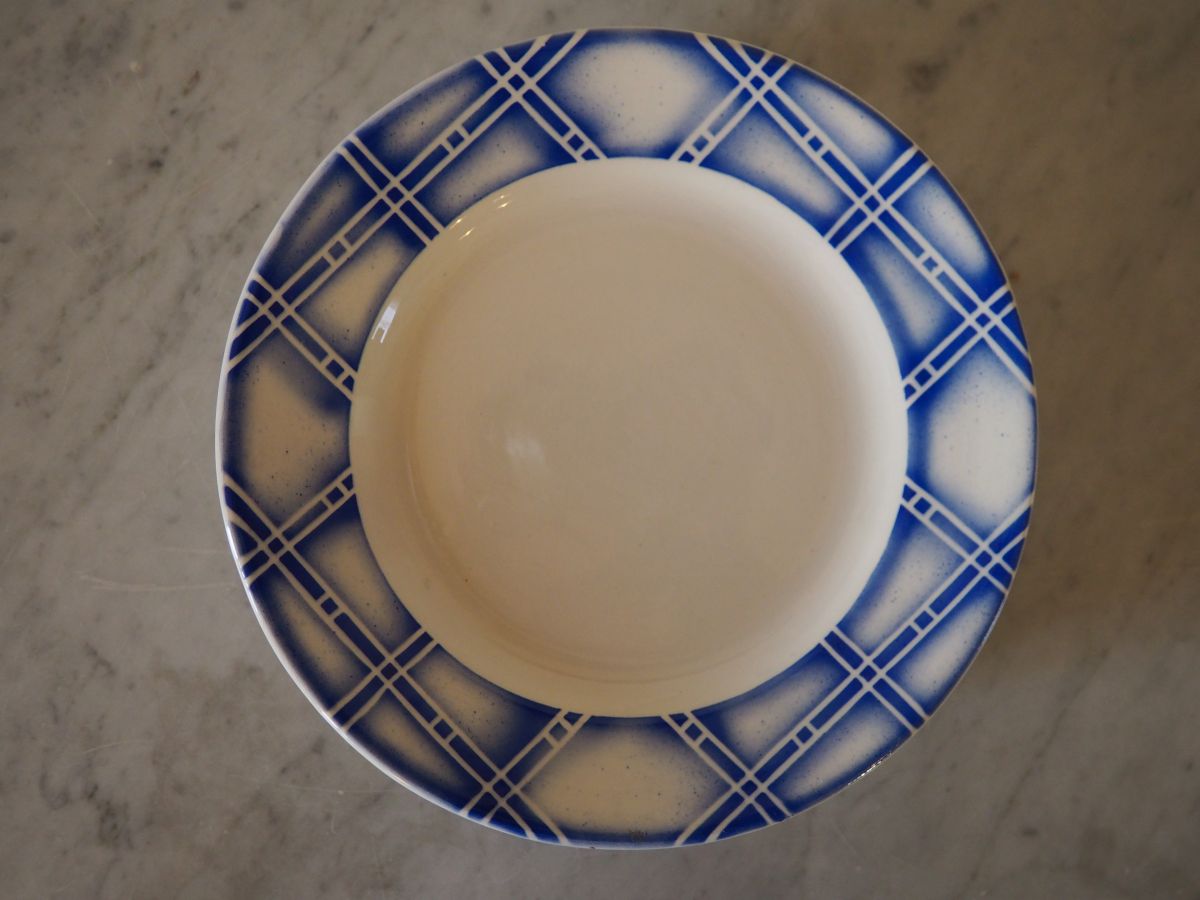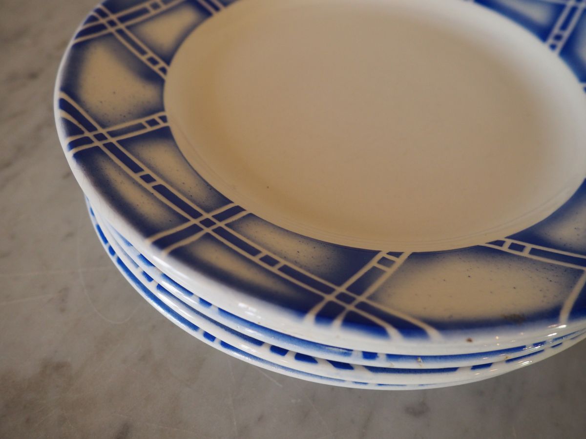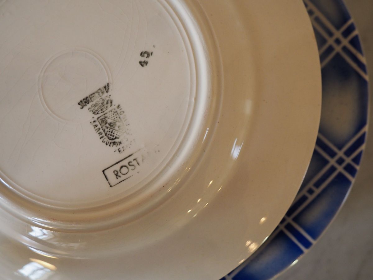 Lot de 6 assiettes bleues / blanches en céramique de Sarreguemines, tamponnées au dos, service “Rostand” numéro 45