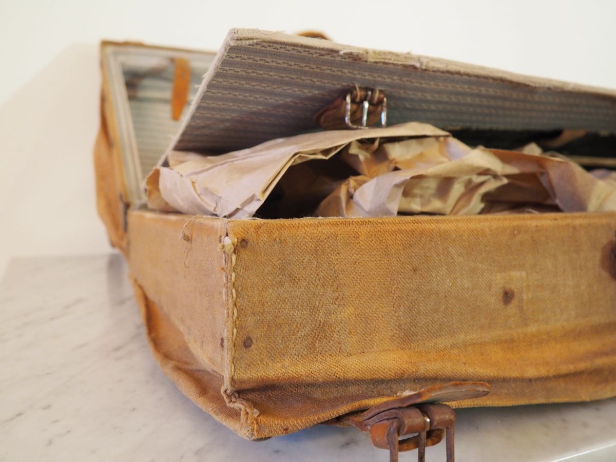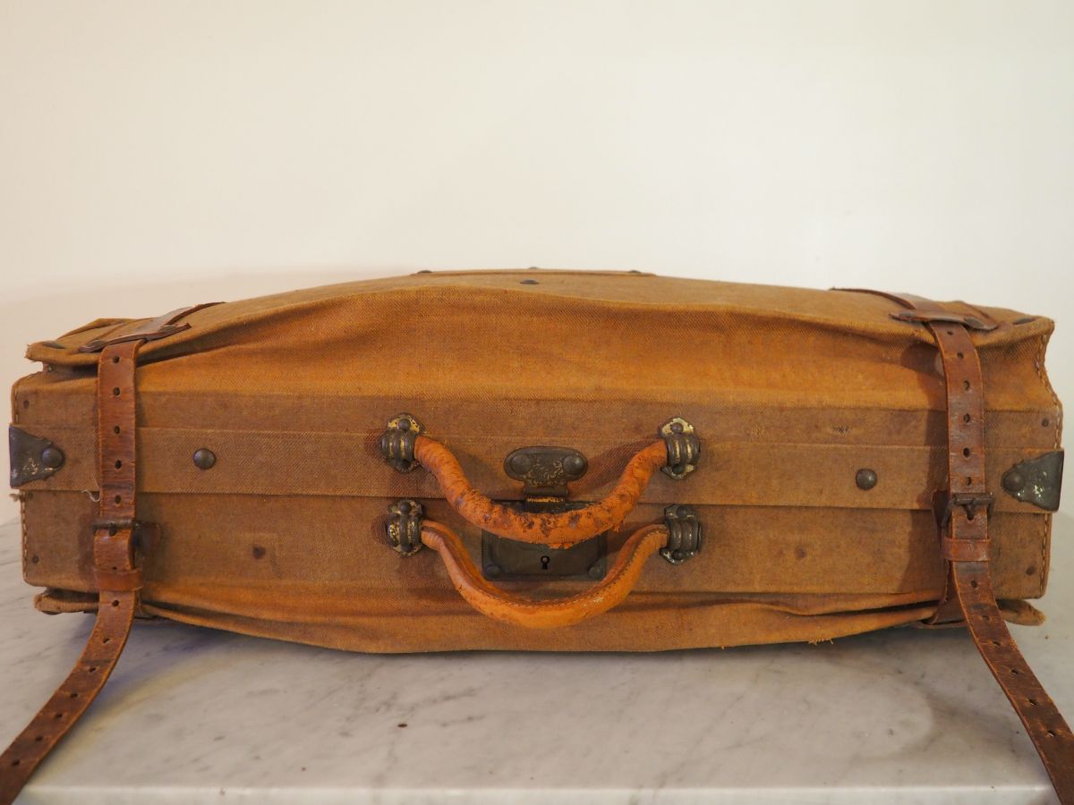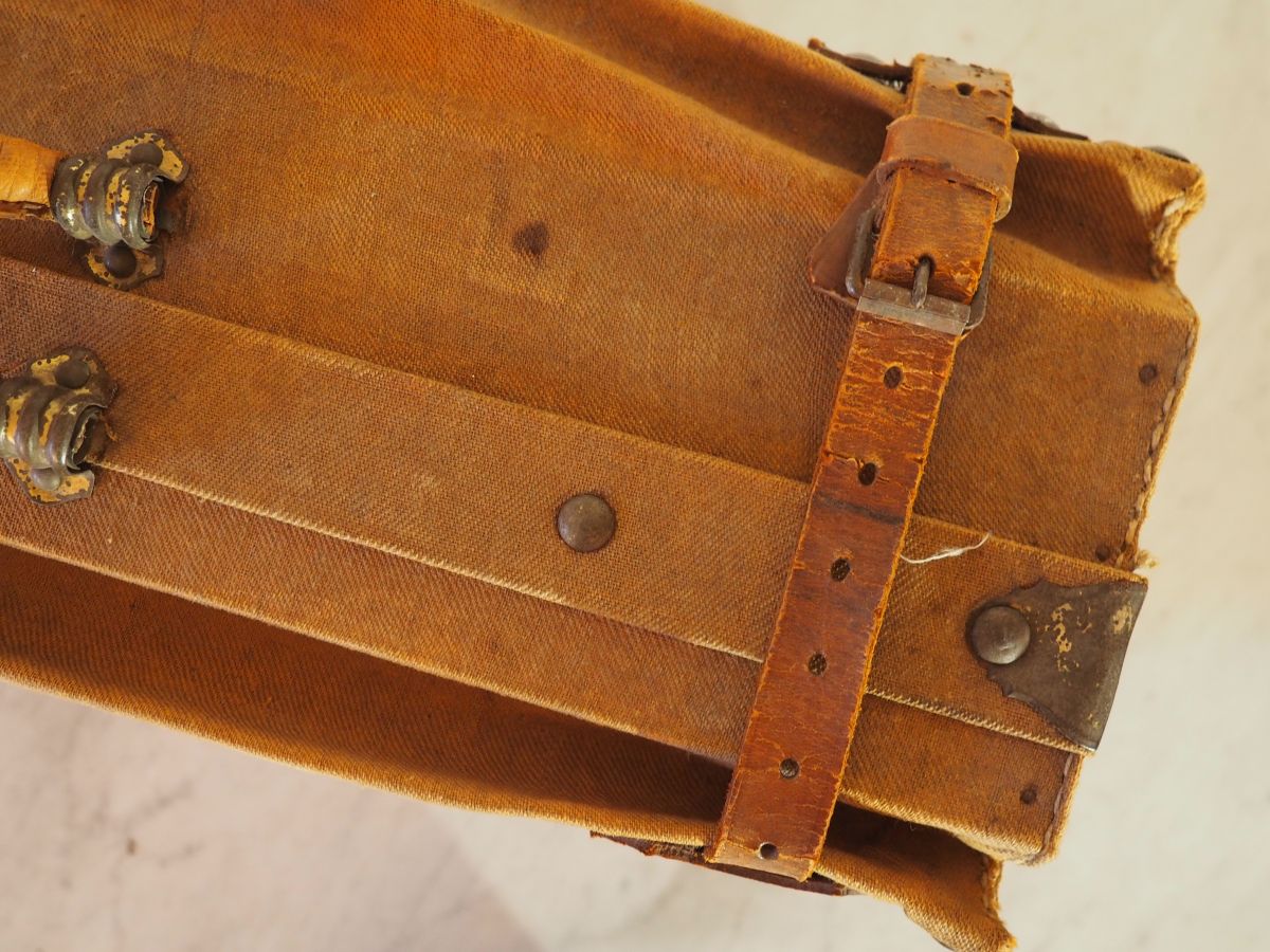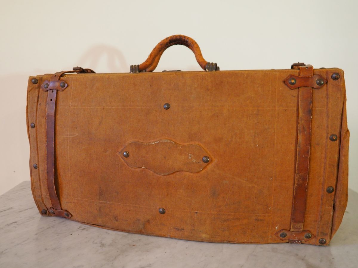 Valise à soufflets d’époque en tissu et lanières de cuir