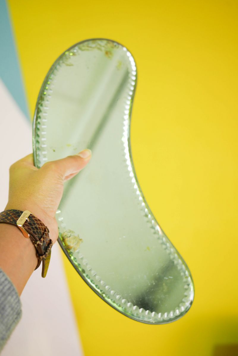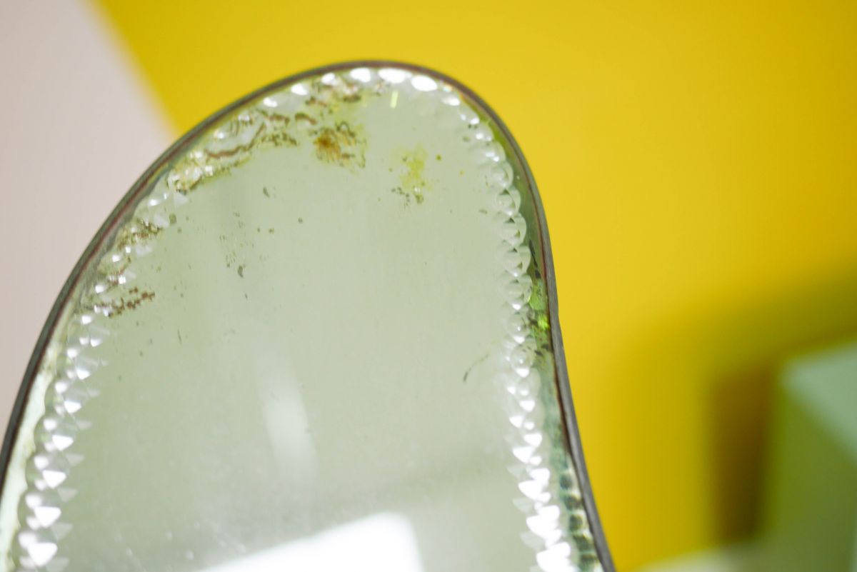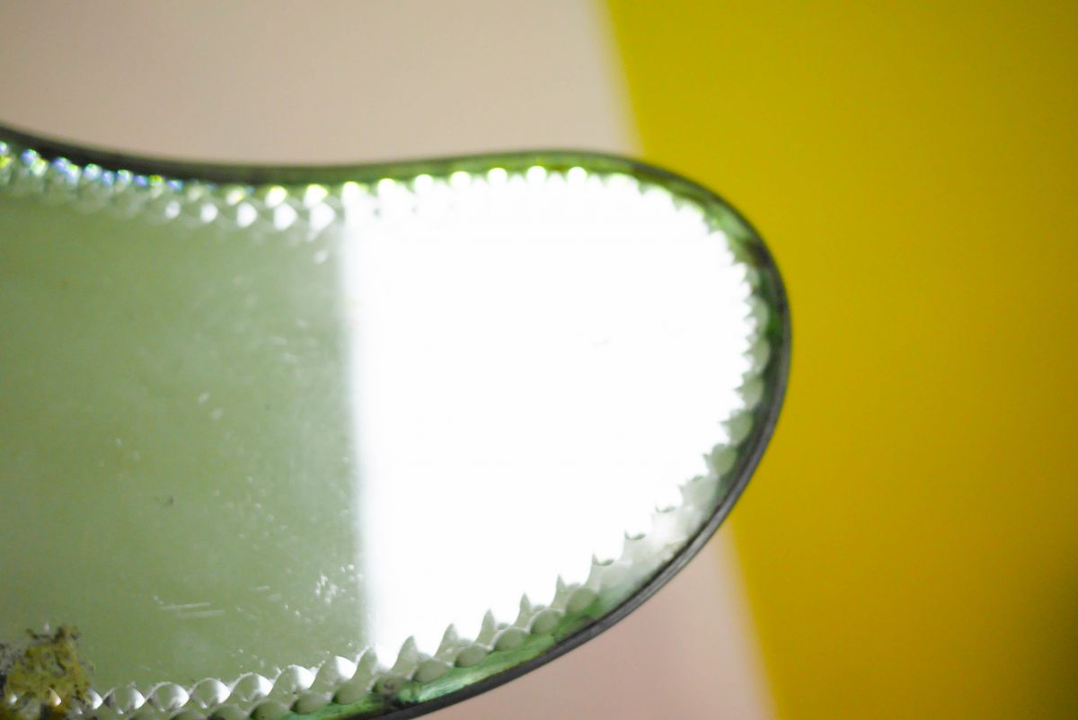 Voici un magnifique miroir vintage en forme de lune, biseauté sur les côtés.