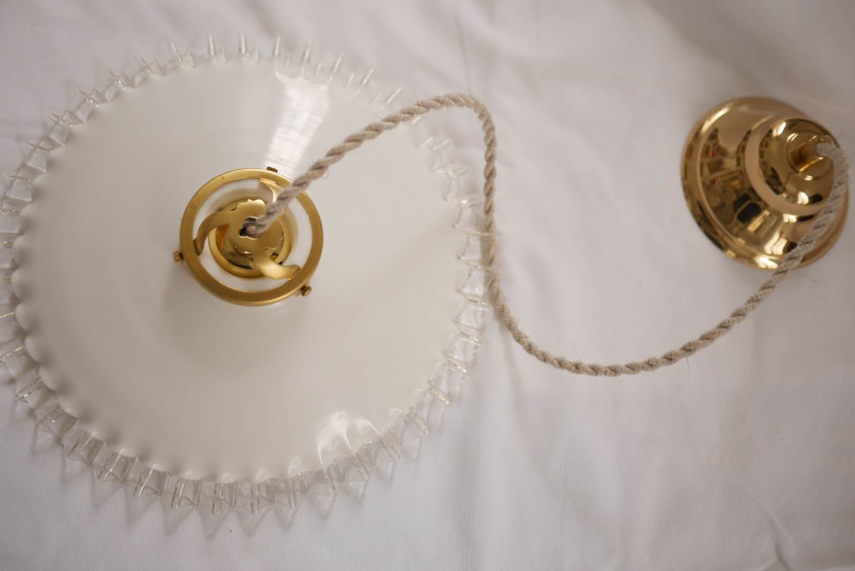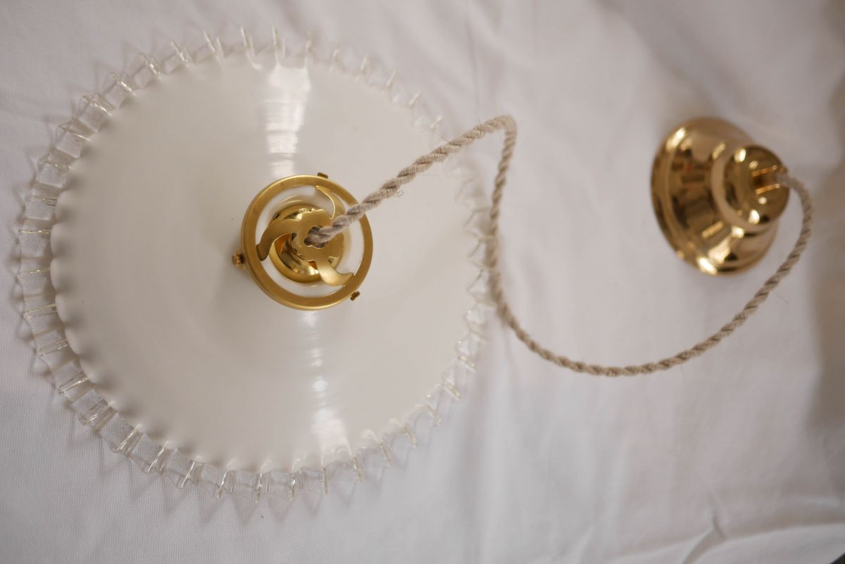 Voici une très jolie suspension en verre cranté. Très délicate, elle est blanche avec le liseré cranté transparent, habillée de douille et plafonnier en laiton et d’un câble en lin.