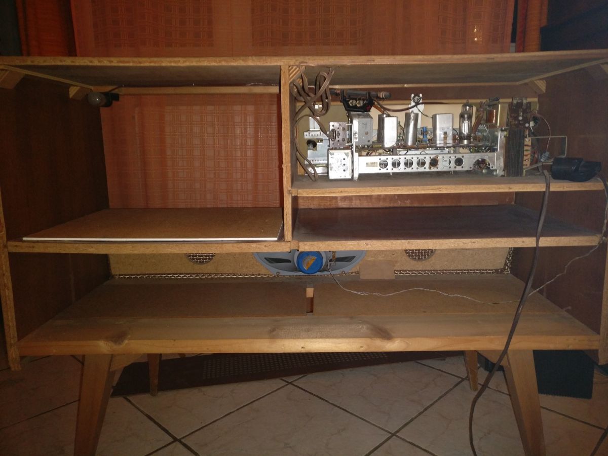 Le meuble est équipé d'une lumière automatique (sur la partie droite : rangement). Les basses de la radio sont réglables, la radio fait plusieurs ondes (réglables également).