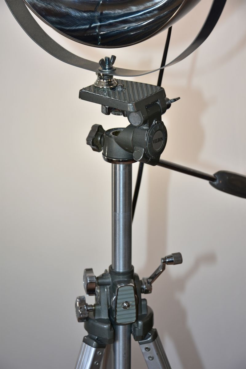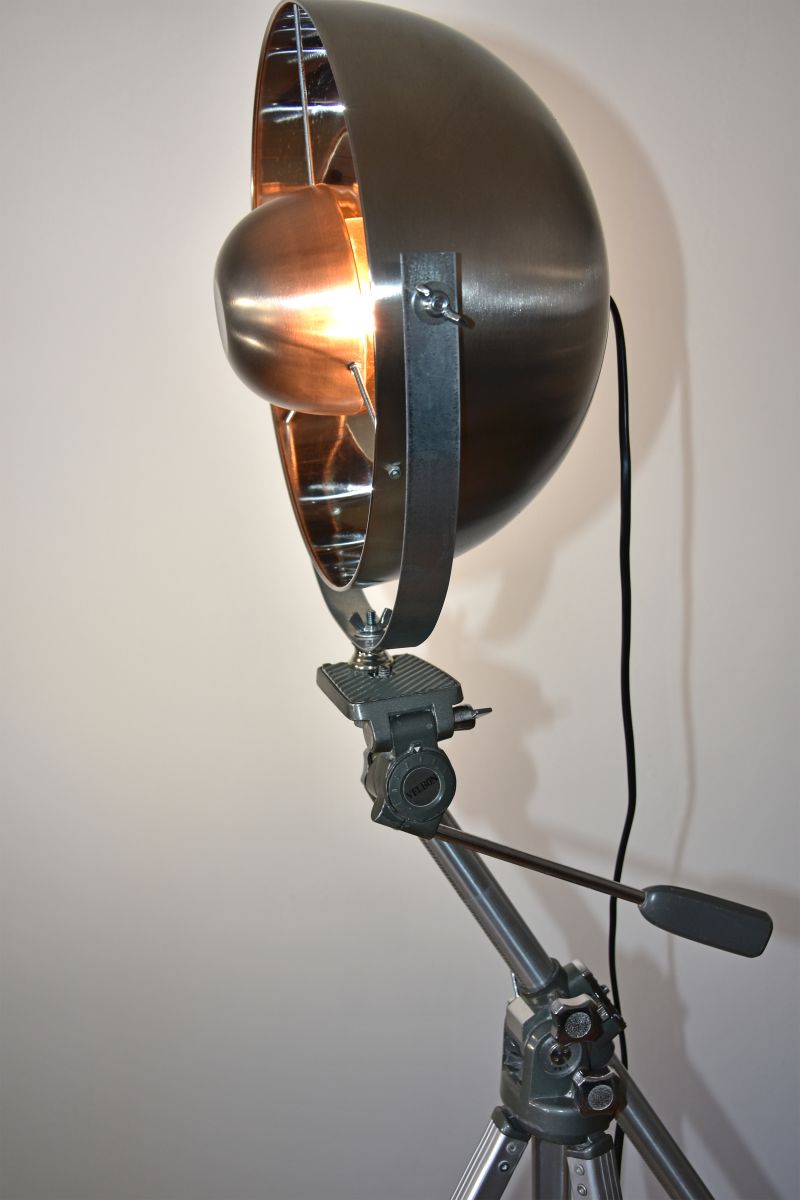 Très belle lampe unique inspirée des projecteurs vintage, le bowl inox est assemblé à la main sur un ancien trépied photo 3 axes (rare) ce qui permet de multiples combinaisons , la connexion électrique est neuve douille E27 avec son ampoule type Edison elle diffuse avec style une douce lumière