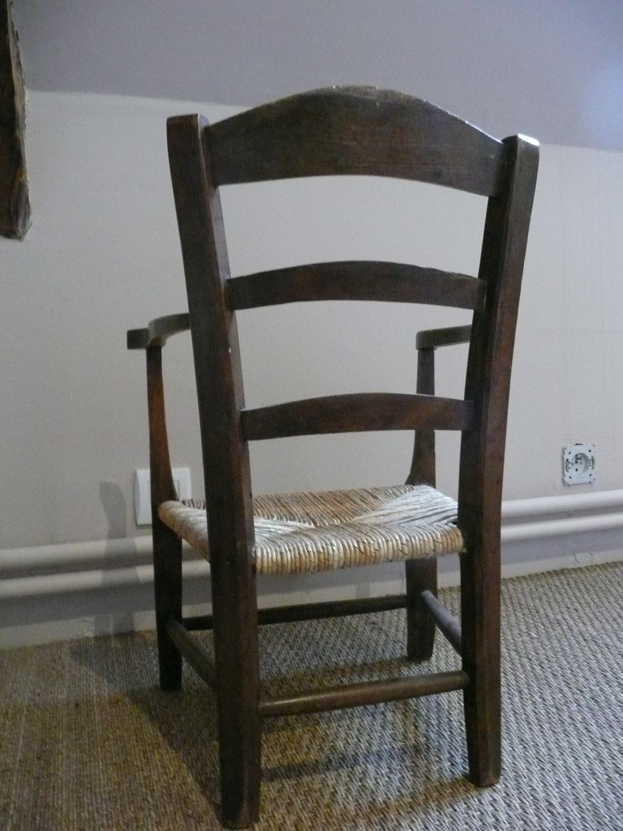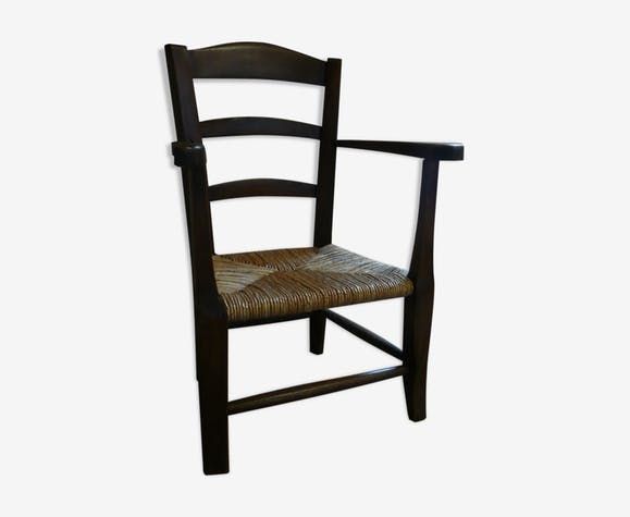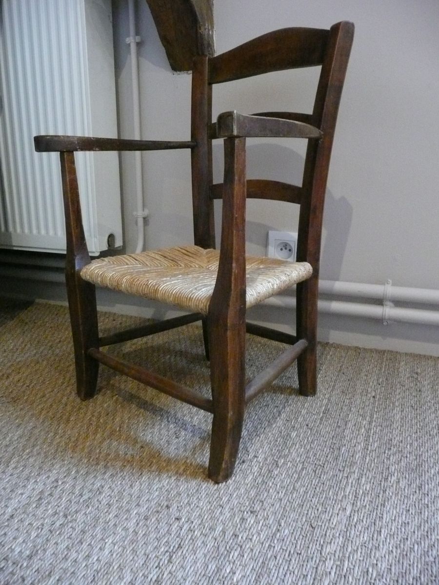 Fauteuil enfant en bois. Assise en paille refaite par professionnel. Très bon état. Stable et confortable. Hauteur assise: 24cm Profondeur assise: 27cm Hauteur: 60cm.