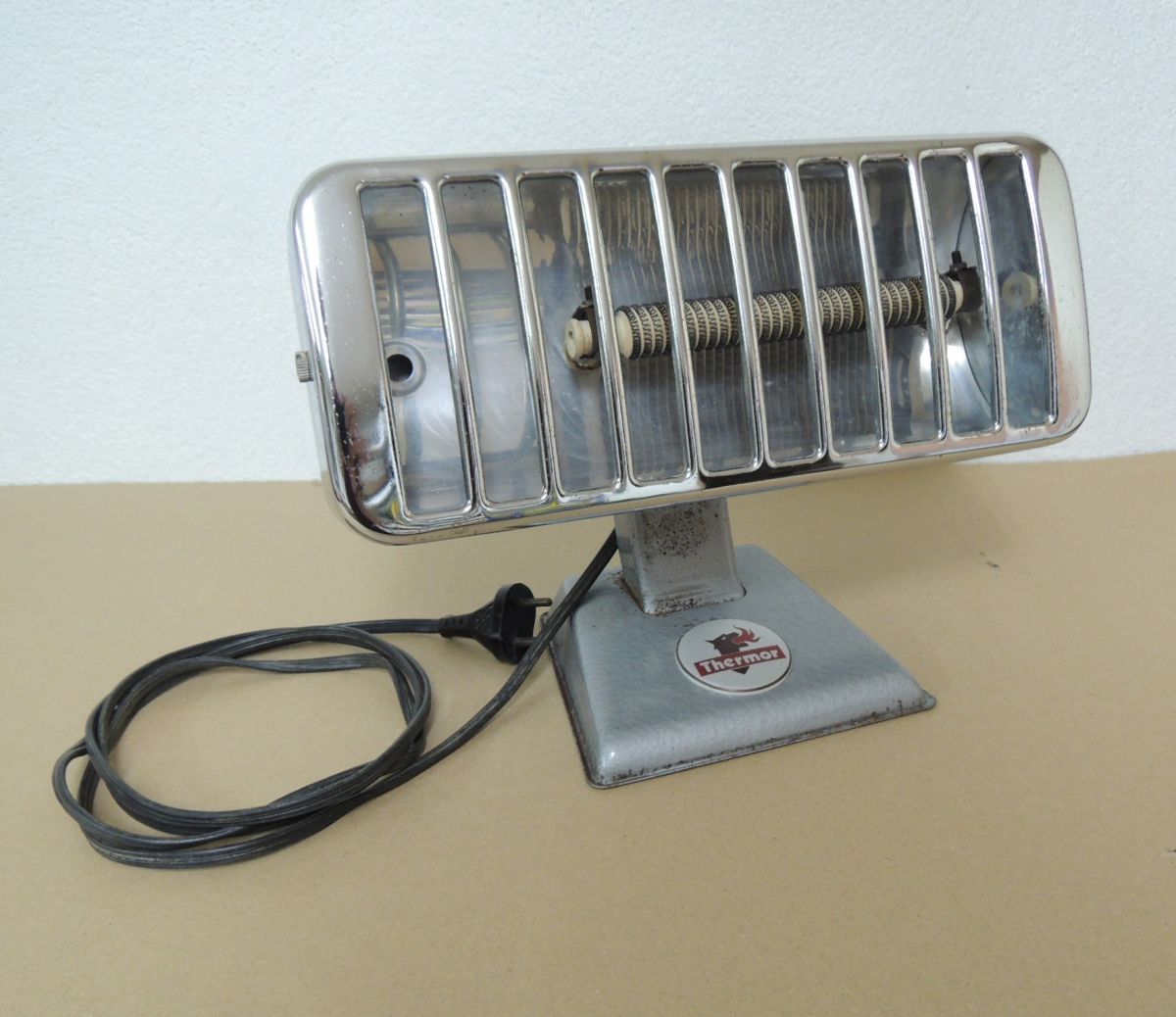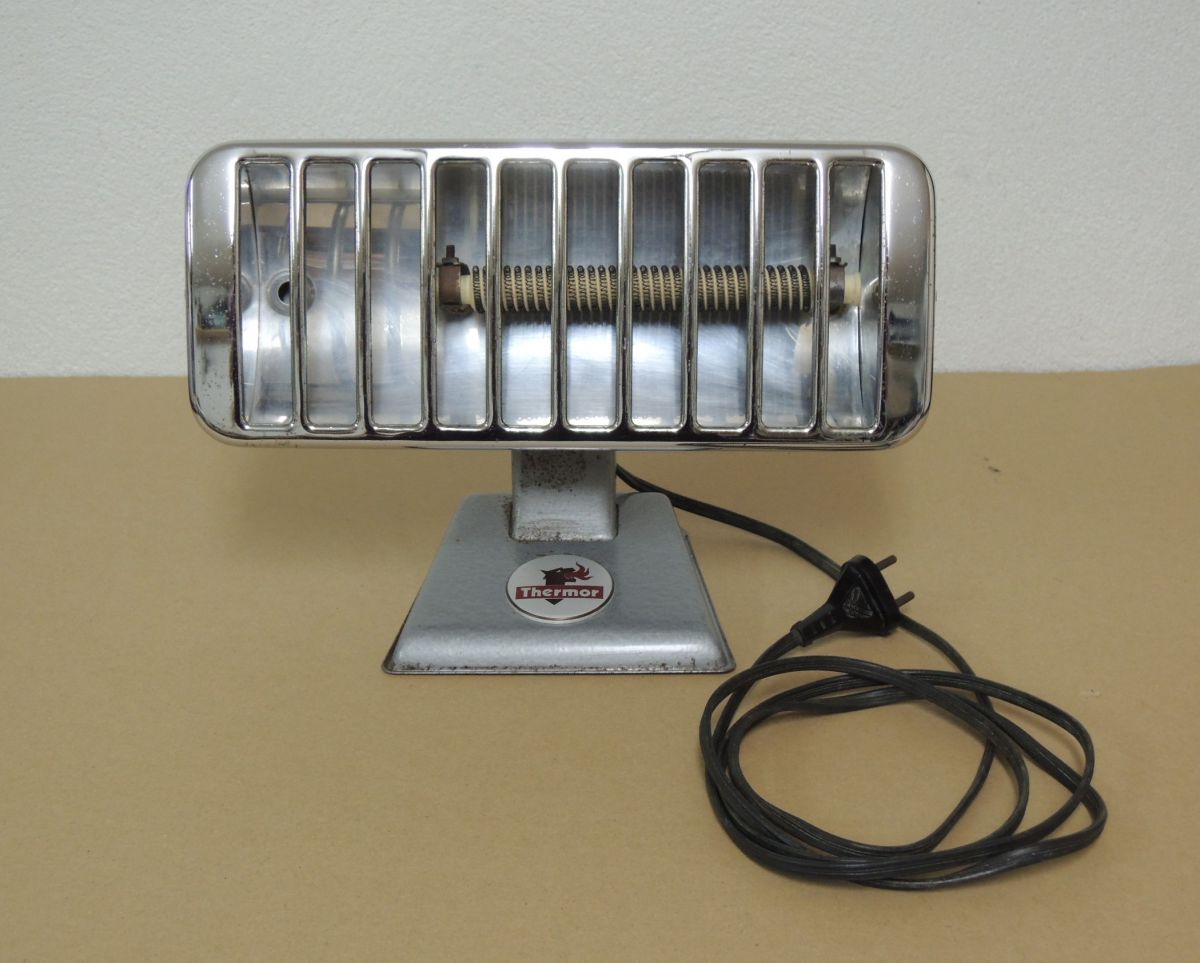 Radiateur d'appoint à poser de marque Thermor, années 50/60. Gris, aspect martelé et chrome. Résistance courte (18cm), câble plat 2 fils (sans terre). Fonctionne et en bon état (traces d'usure normale). Dimensions : Longueur 30cm x Profondeur14cm x Hauteur 22 cm. Poids 1,5 kg