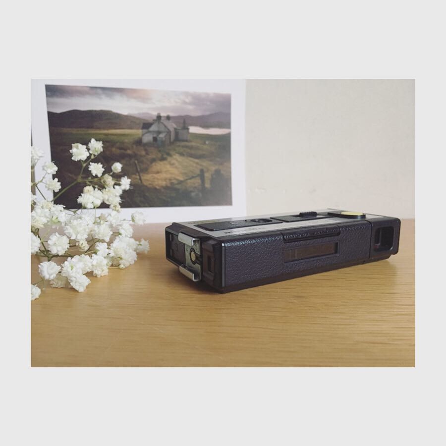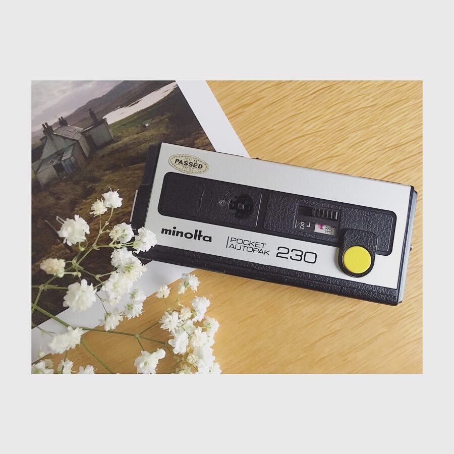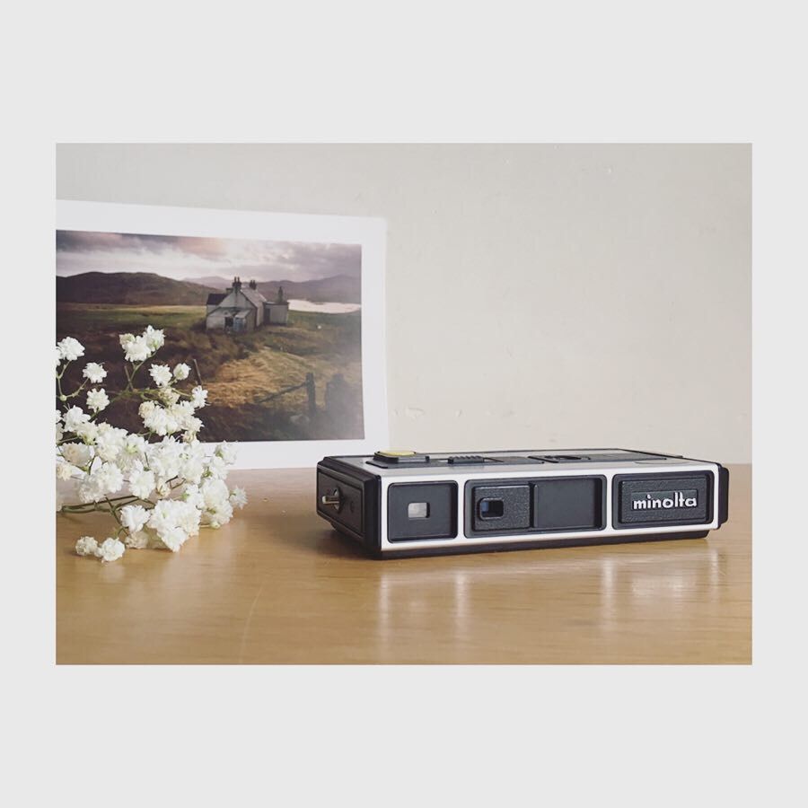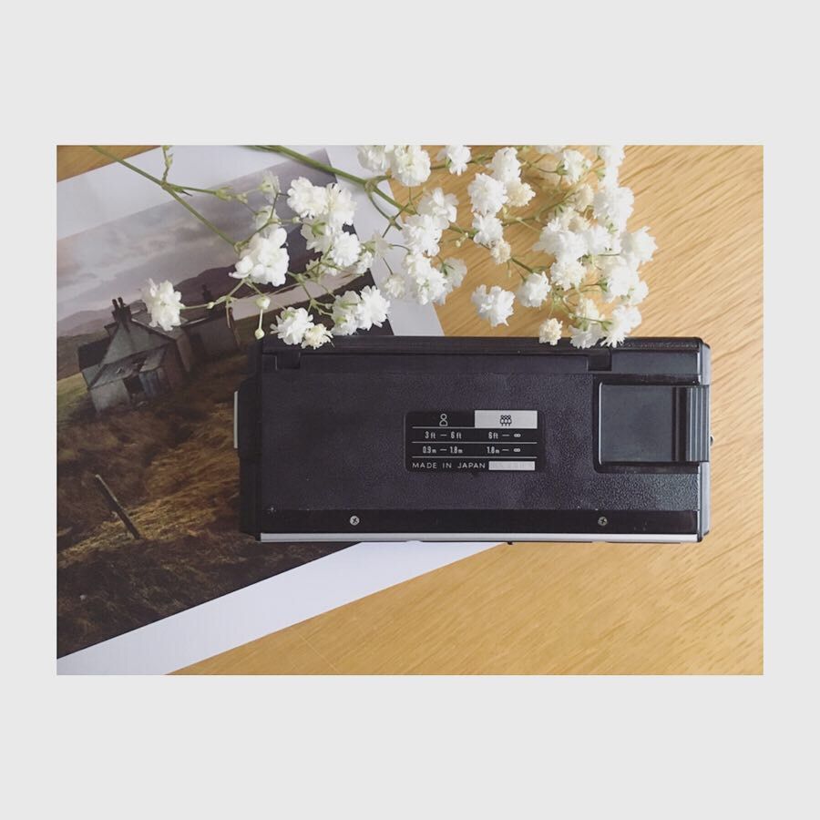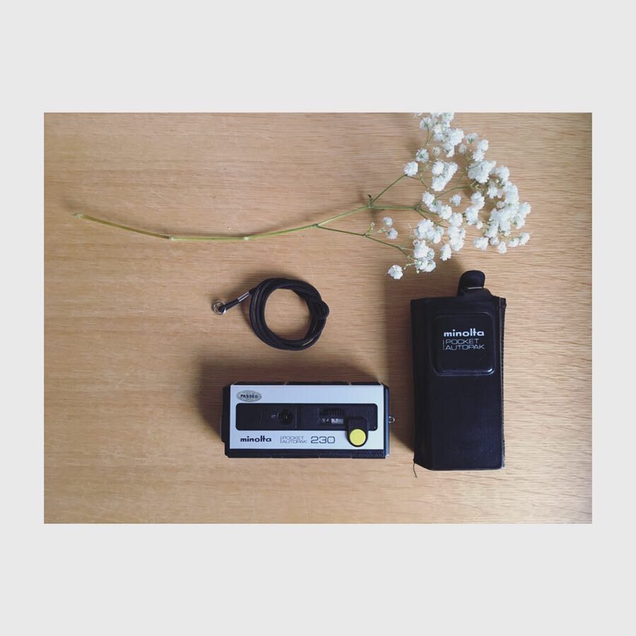 Ce très charmant Minolta autopocket 230 sorti en 1976, est monté en plastique, son capot en alu et son déclencheur jaune lui donne une allure digne d’un grand. Il possède deux vitesses (50ème et 125ème) réglables par un curseur, placé sur le capot coulissant, devant deux symboles (groupes et portrait). L’objectif est un 26mm qui ouvre à 1:8. L’armement se fait par une glissière sous le boîtier. Un tableau sérigraphié sous l’appareil indique les distances de mise au point en fonction des symboles. Appareil en très bel état, accompagné de sa dragonne et de son étui (fermoir par bouton pression).