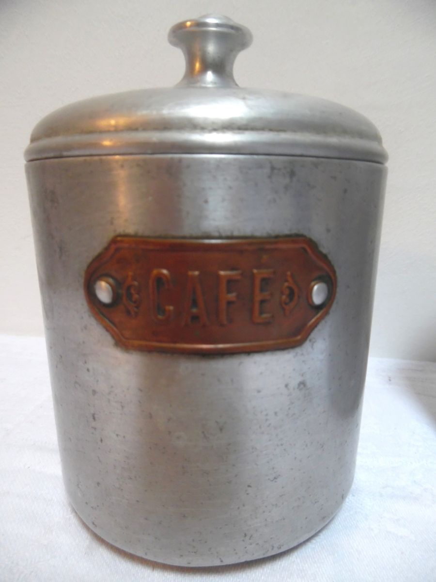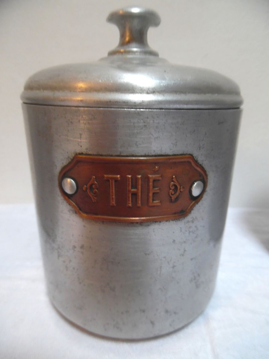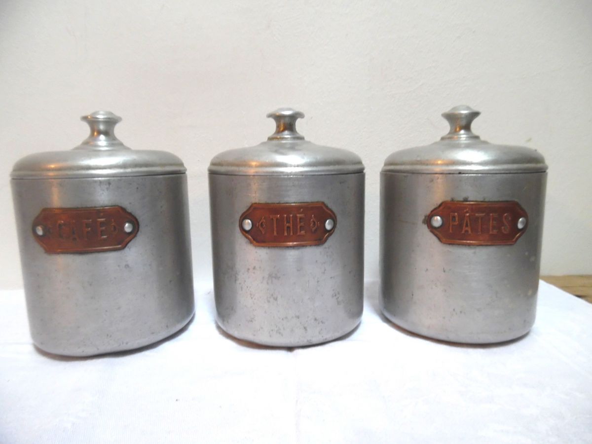 Trio de boites à condiment( thé,pâtes,café) en alu ,quelques petites cabosses ,ce qui leurs donnent tout leurs charmes, vintage.