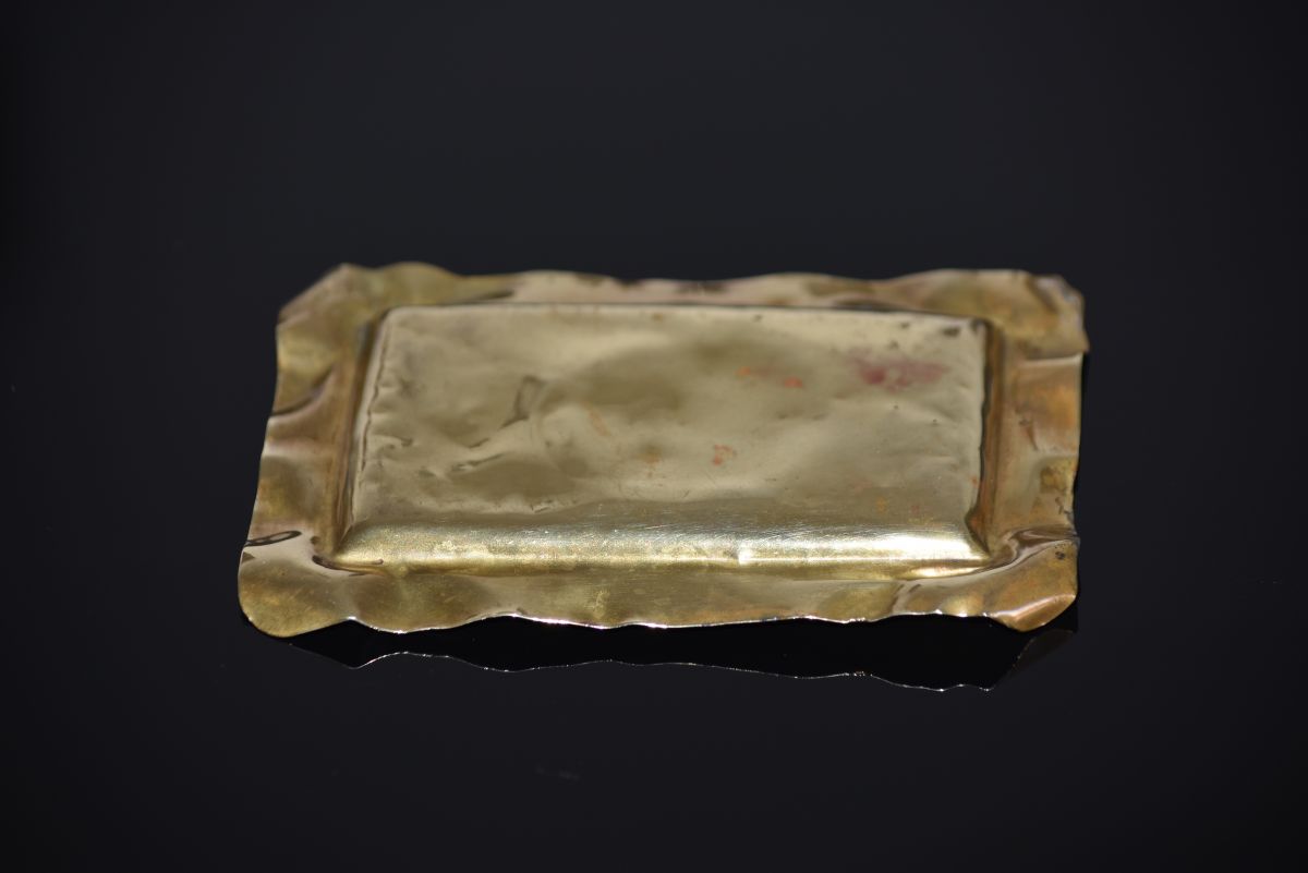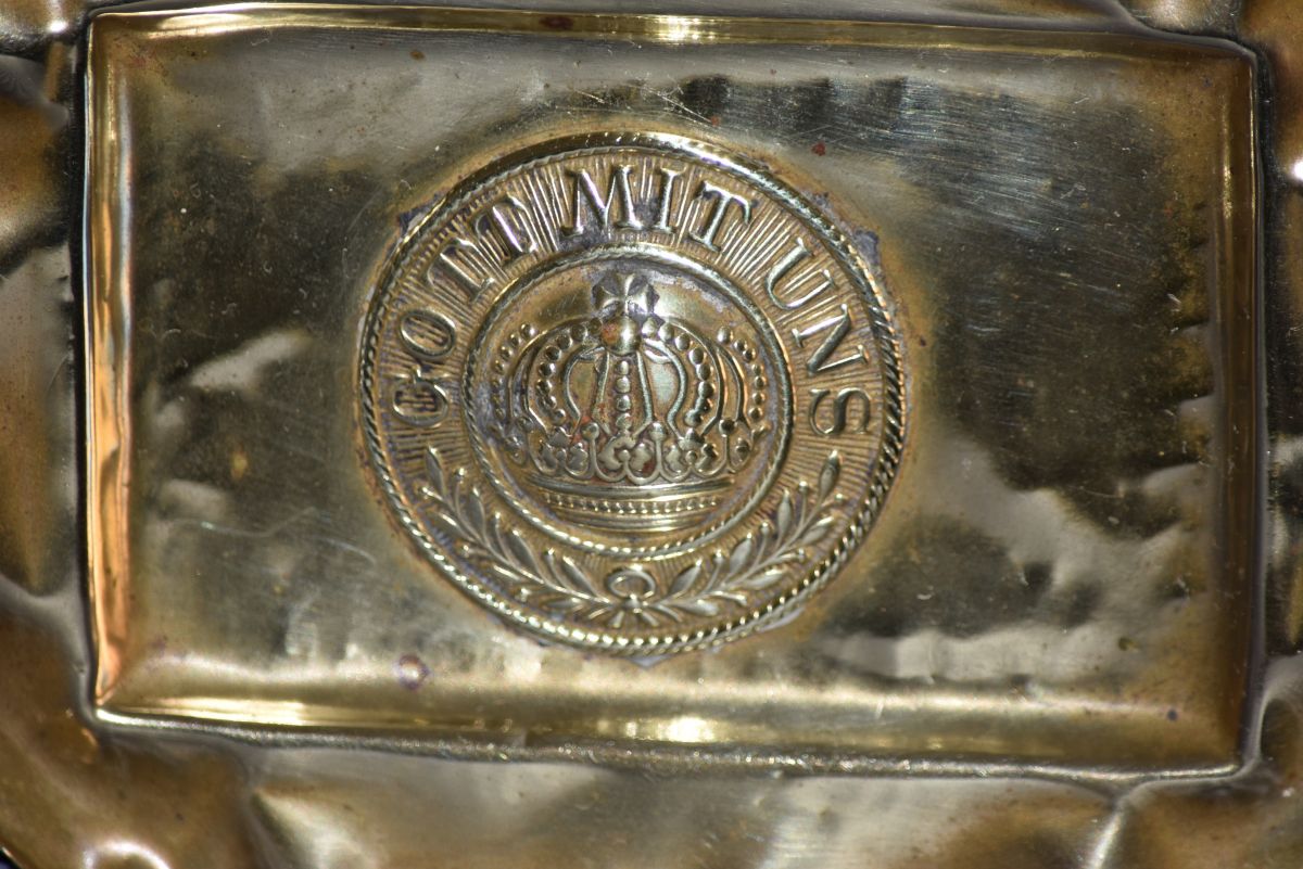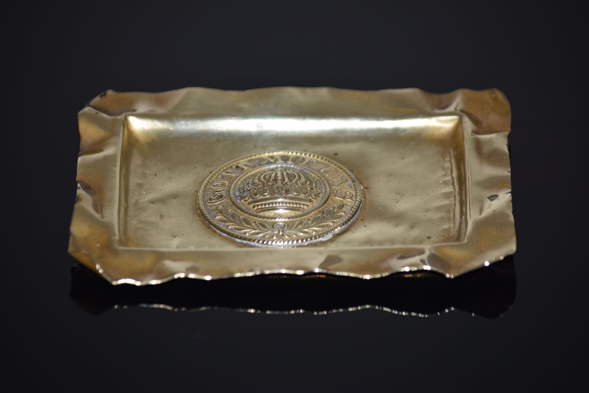 Véritable pièce historique artisanat de tranchée ce cendrier fabriqué par un soldat allemand durant La Grande Guerre 14-18 à partir d'une feuille de laiton martelée et d'un écusson de boucle de ceinture "Gott mit uns"devise de la maison royale de prusse depuis 1701 la couronne du Kaiser sera remplacée par l'aigle en 39-45
