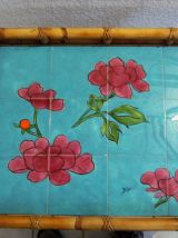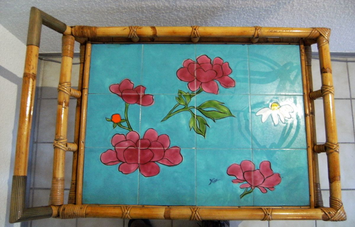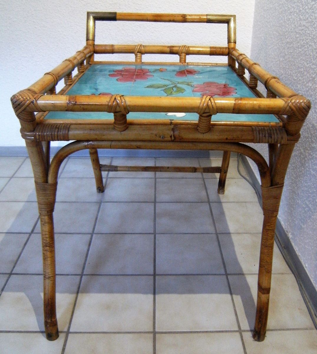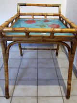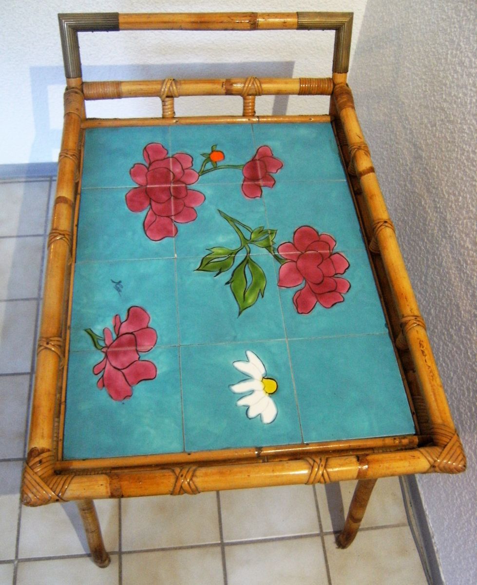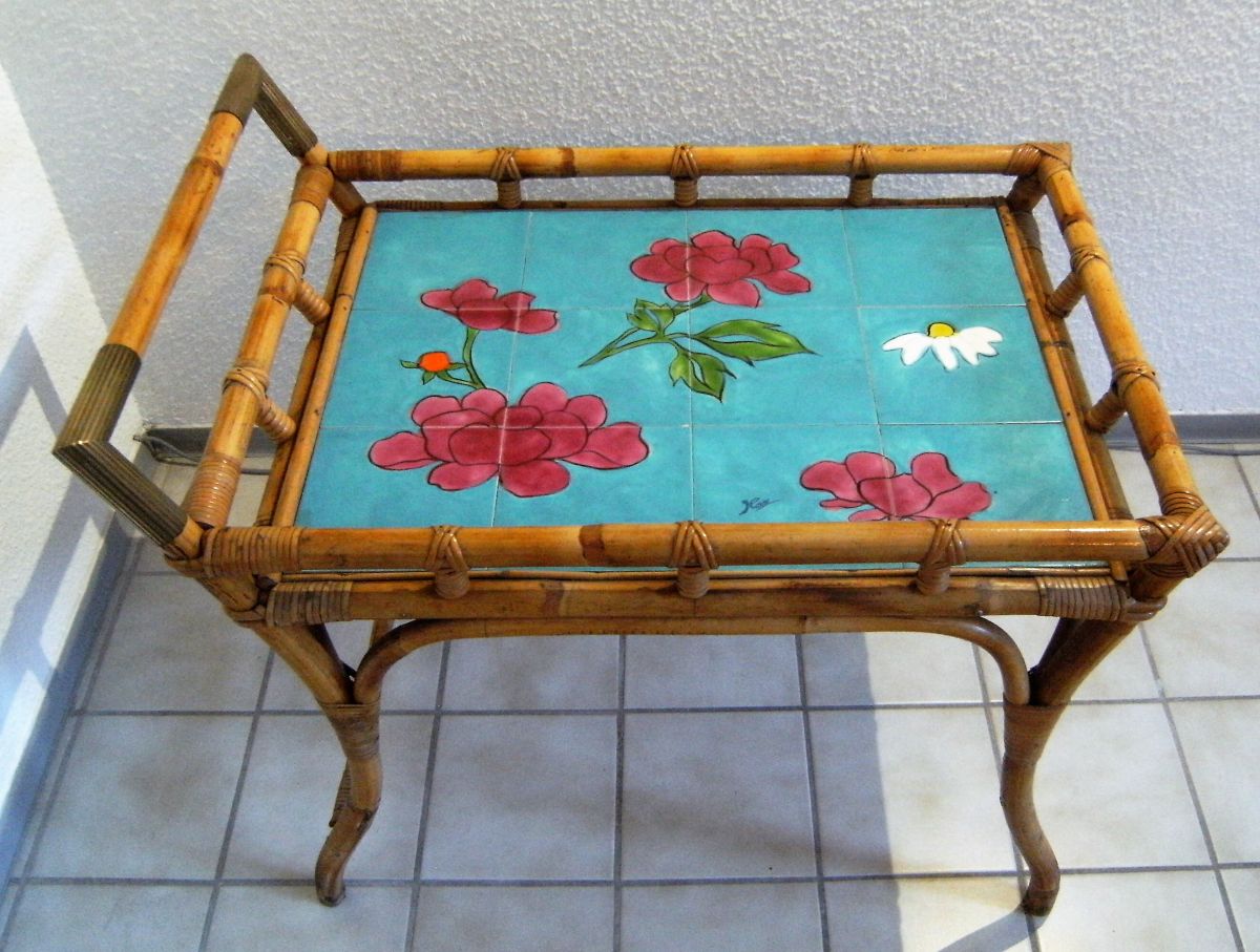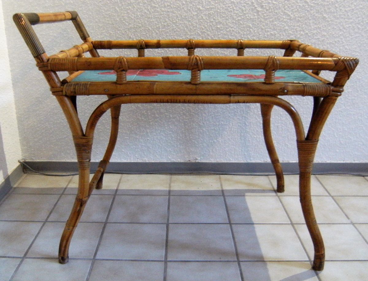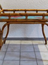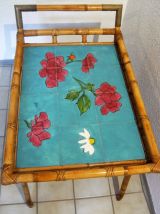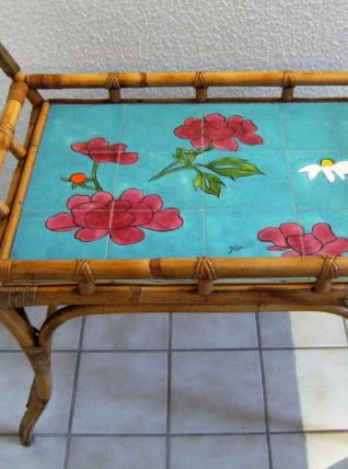 Servante apéritif ,table d'appoint en rotin/bambou ,espace de pose en céramique style Vallauris signée ,articulations en laiton .