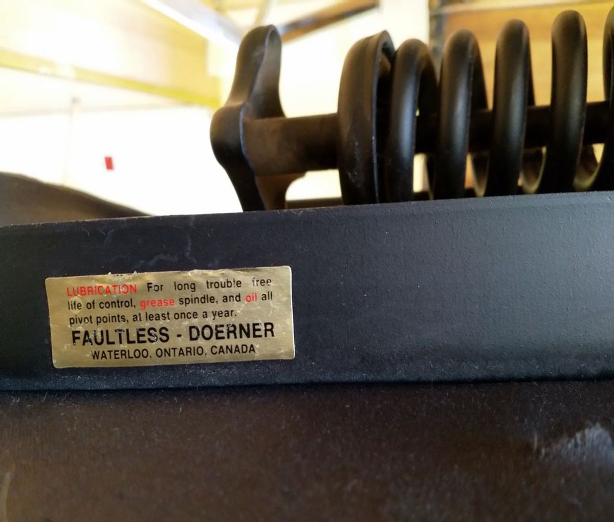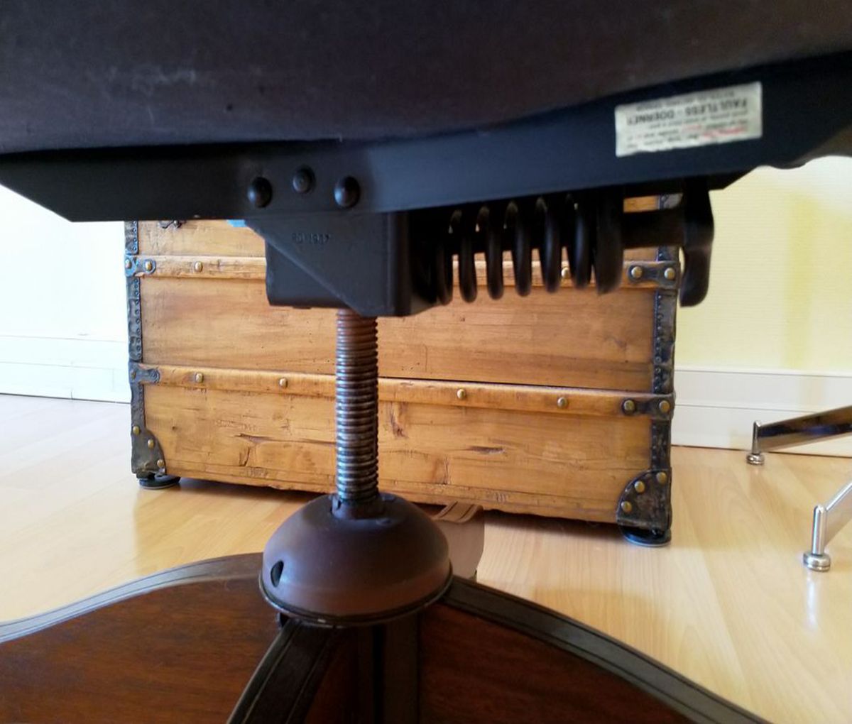 Fauteuil en très bon état (peu utilisé), il est de couleur rouge antique. 1950 Le fauteuil est de fabrication canadienne. Réglable en hauteur, bascule, roulettes en laiton. Dimensions (en cm) : 63 l x 73 p x 88 h