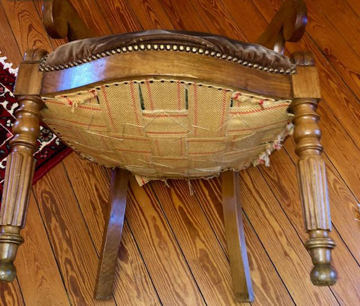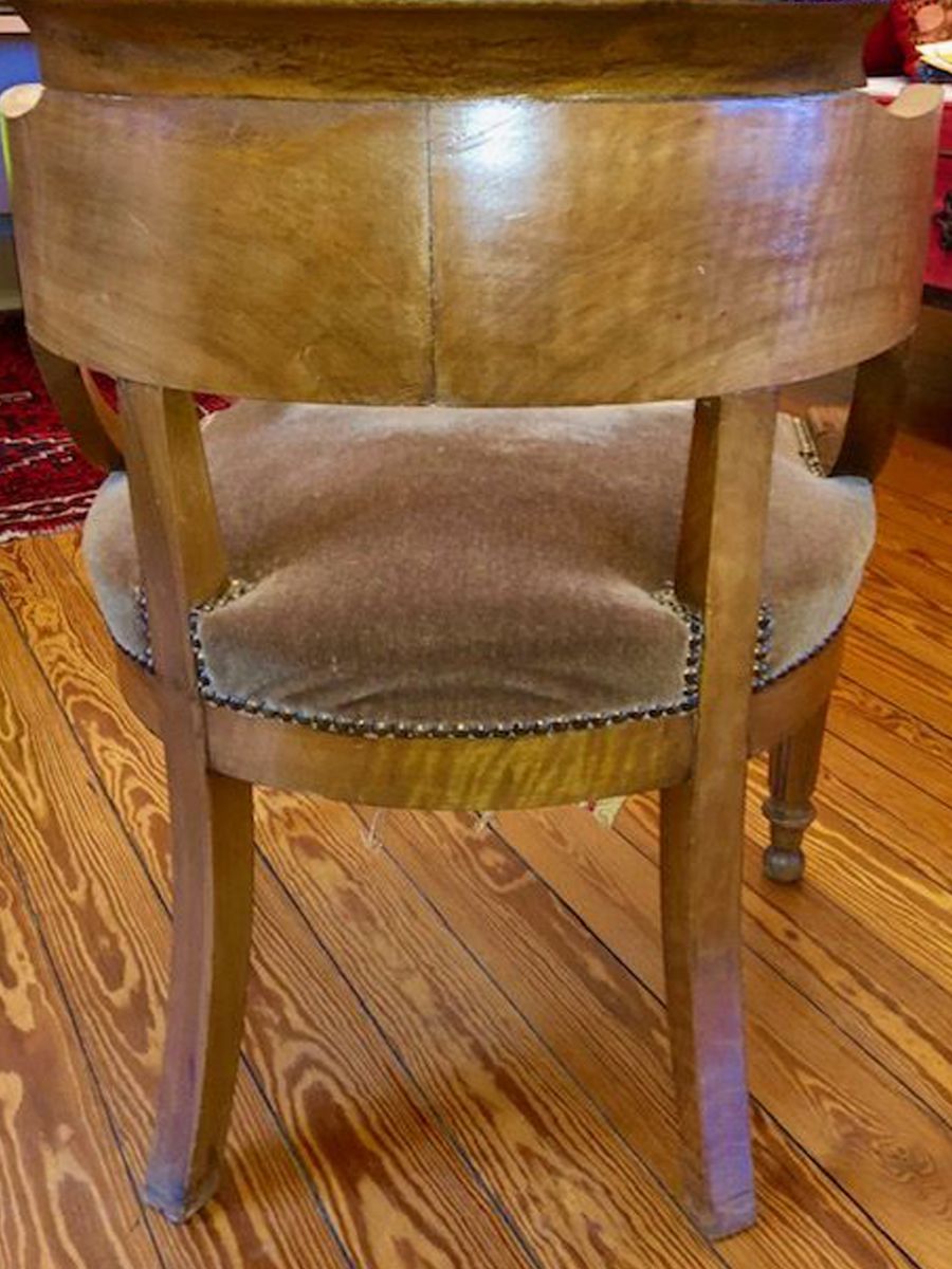 Fauteuil de bureau en chêne blond Louis-Philippe. Son dossier à crosses est élégamment recourbé vers l’arrière. L’assise est recouverte d’un velours marron dont le pourtour est garni de clous vieillis. le rembourrage est quelque peu fatigué. Il repose sur 4 pieds dont ceux de l’avant sont tournés à godrons et ceux de l’arrière sont galbés. Époque Fin XIXème. Largeur 60 cm – Profondeur 55 cm – Hauteur 76 cm Assise : Largeur 51 cm – Profondeur 47 cm – Hauteur 48 cm