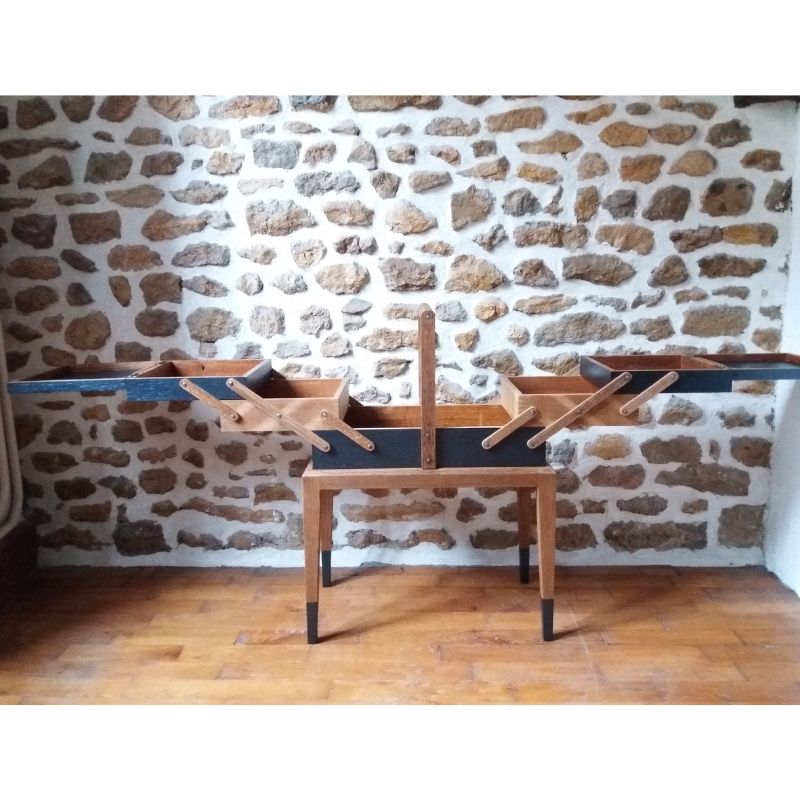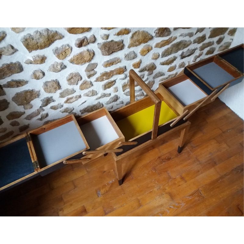 Elle comporte des petites imperfections qui font partis de son charme : un des plateau du dessus comporte une petite irrégularité (cf photo), et le bois comporte un “coup de soleil” visible lorsque la travailleuse vintage est ouverte qui perdure malgré le ponçage. En effet, le bois se fonce souvent au fil du temps avec le soleil. La visserie est d’origine et même bien nettoyée, elle reste “dans son jus”.