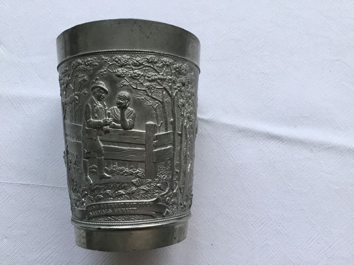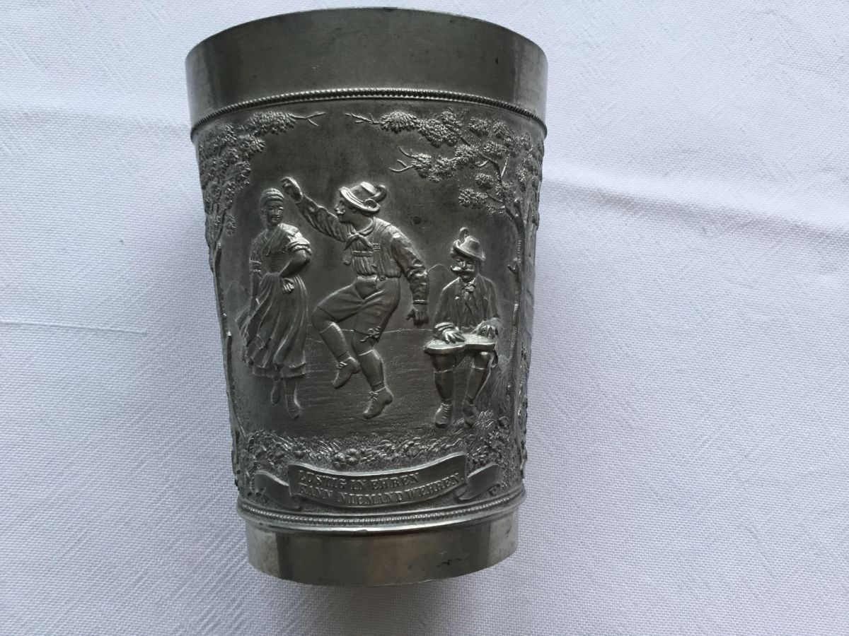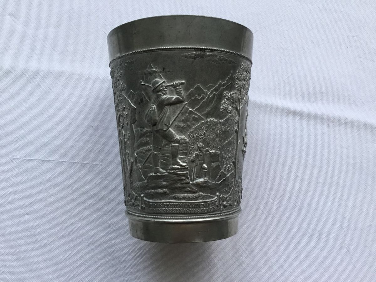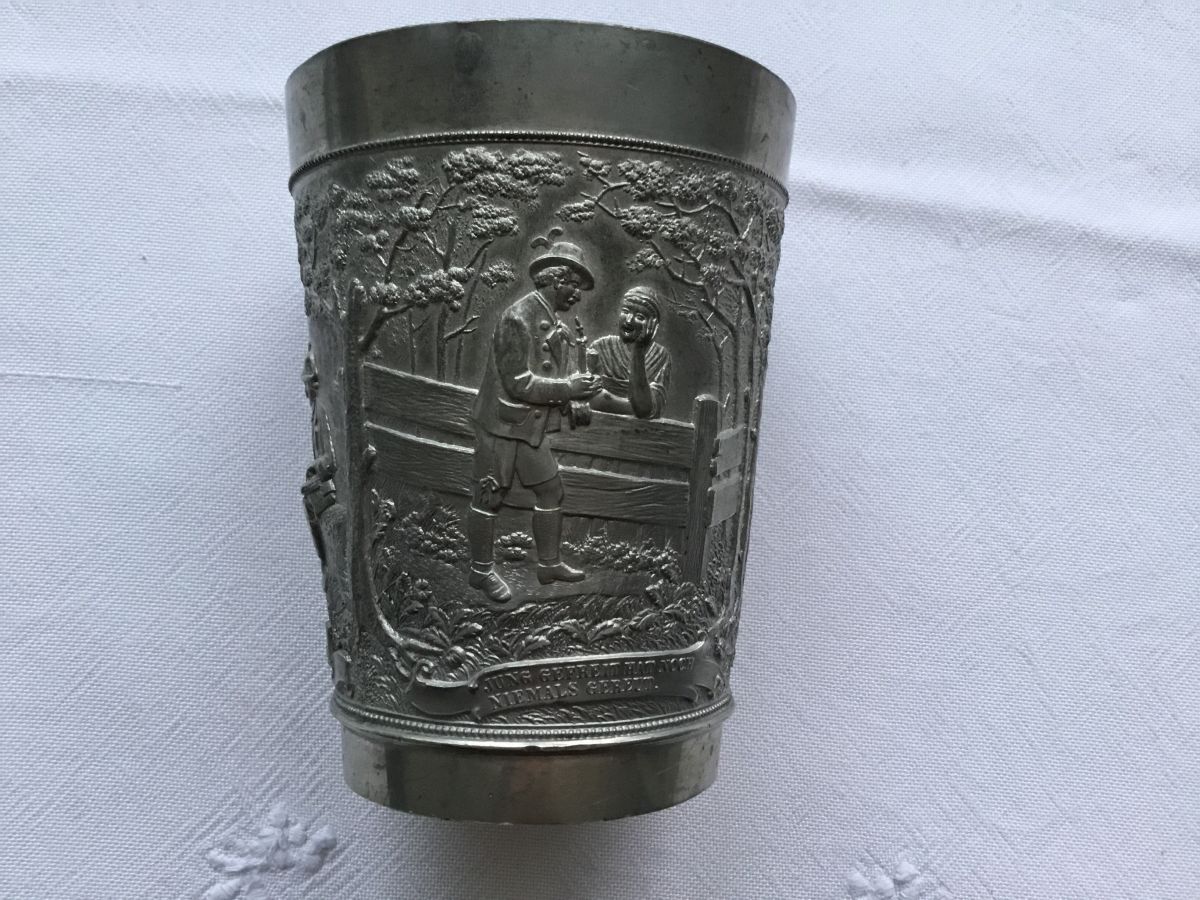 Gobelet en provenance d’allemagne, acheté dans les années 1950. Entièrement gravé et assez lourd(plus de 300g), il fera un parfait pot à crayons.