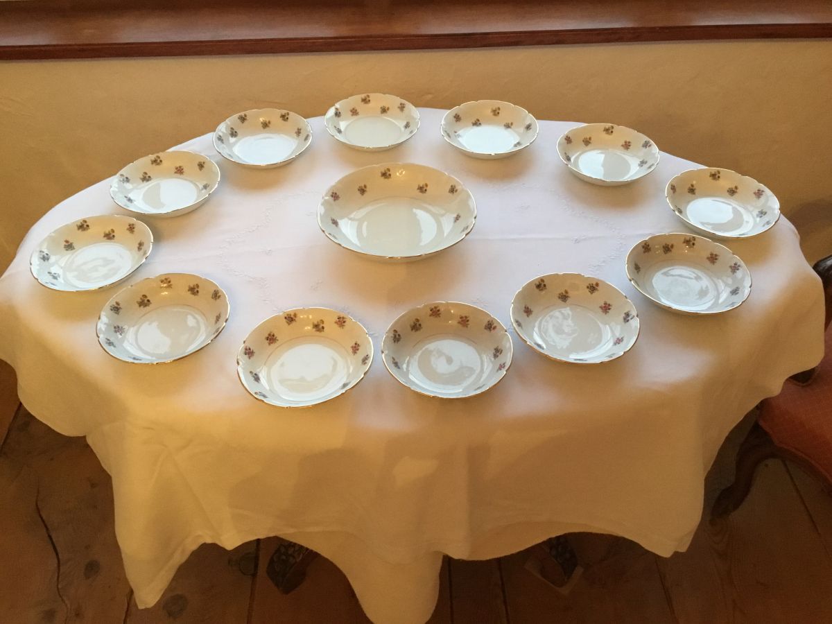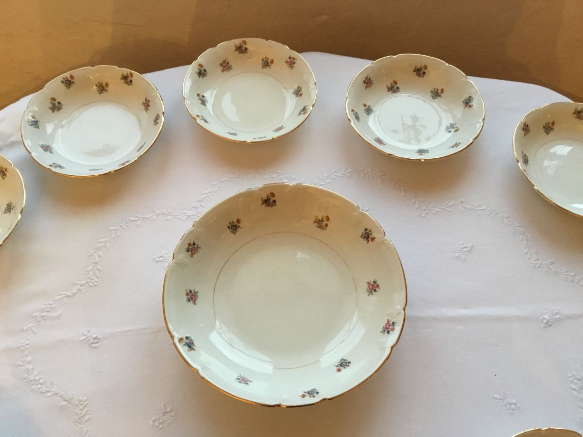 Un grand plat creux et ses 12 assiettes assorties, bord doré. Décor de petits bouquets sur les bords internes et cercle doré au fond. Charmant pour un dessert de salade de fruits ou crème.
