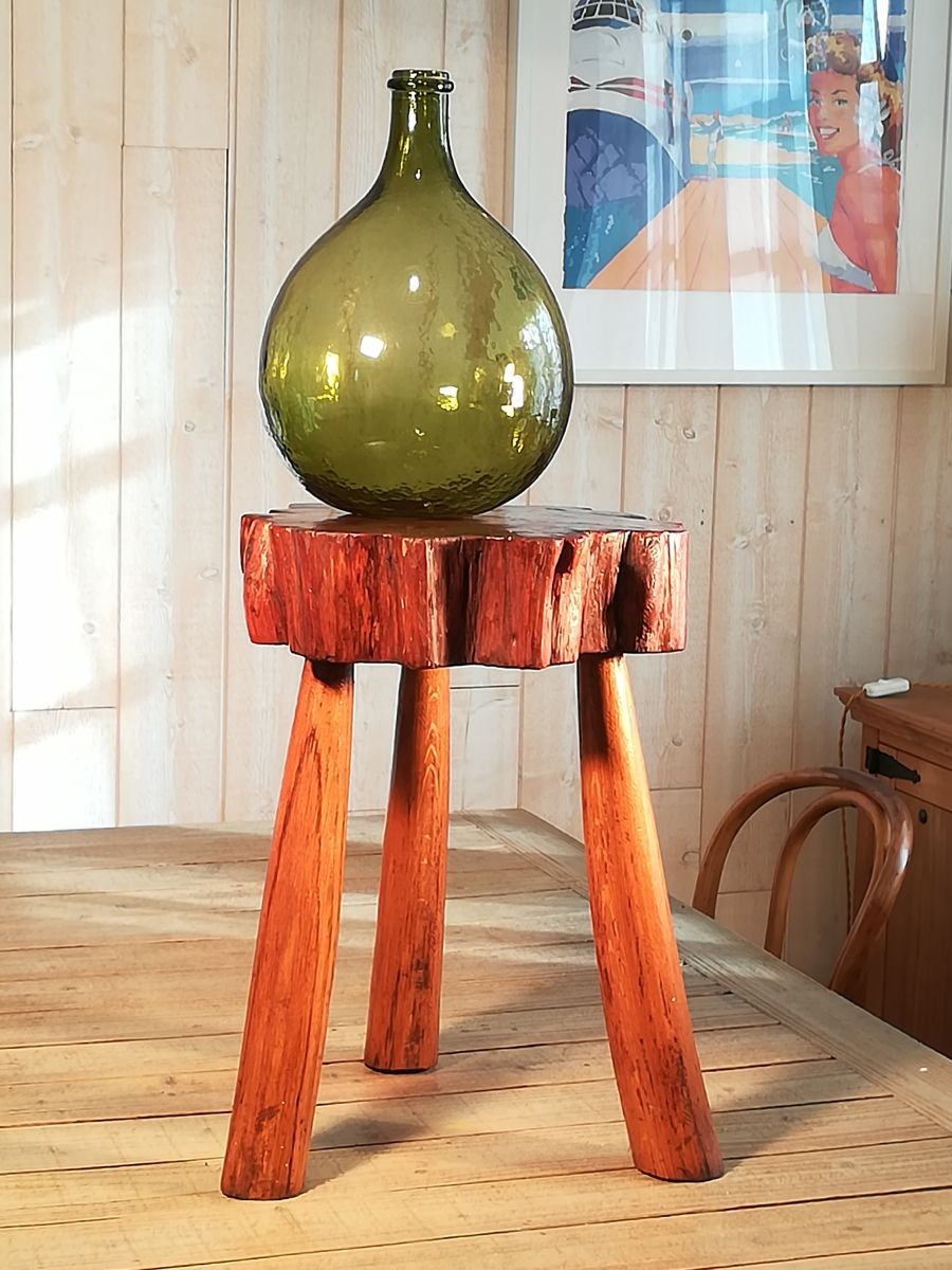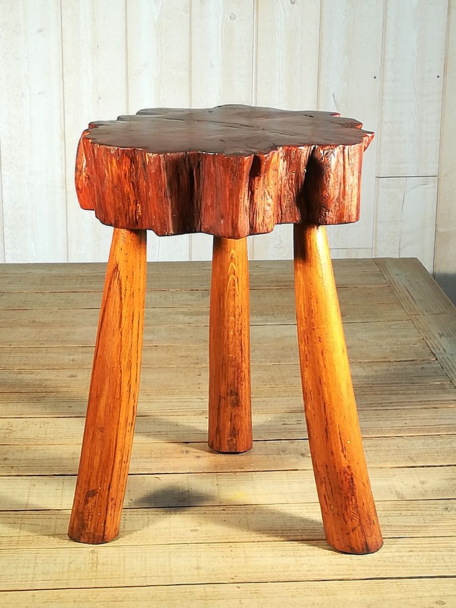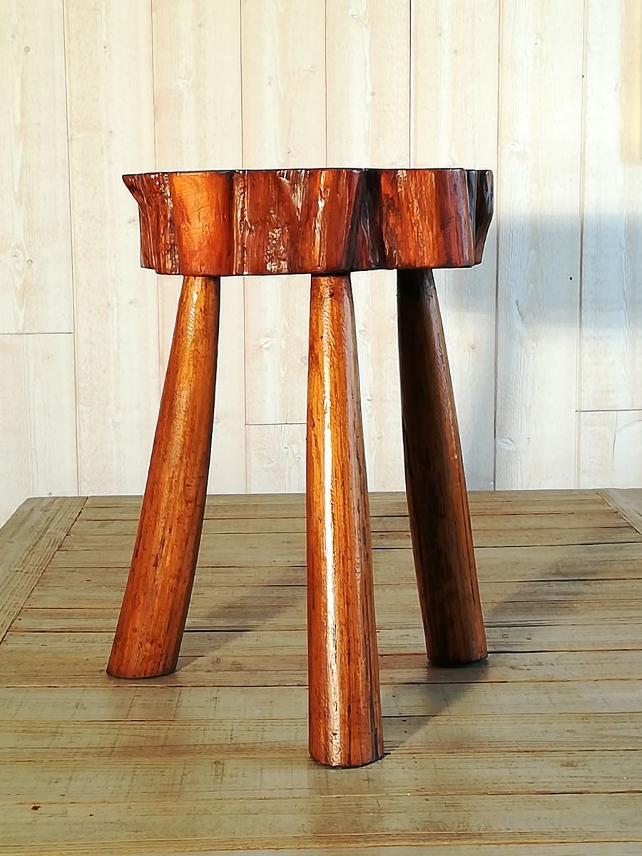 Bout de canapé tripode ou gros tabouret en bois brut massif vernis de couleur marron foncé et marron plus clair pour les pieds. De style "brustalist", il est très joli pour une déco bohème chic. Massif et stable.