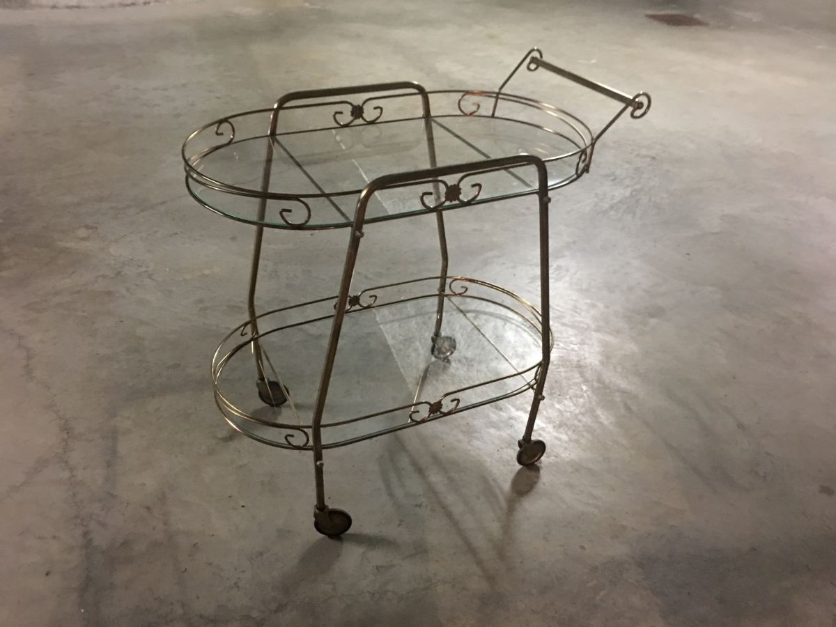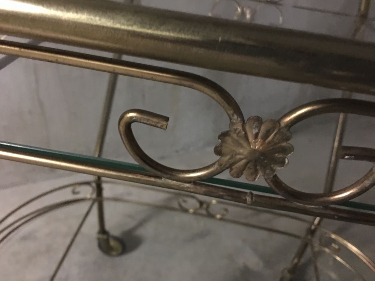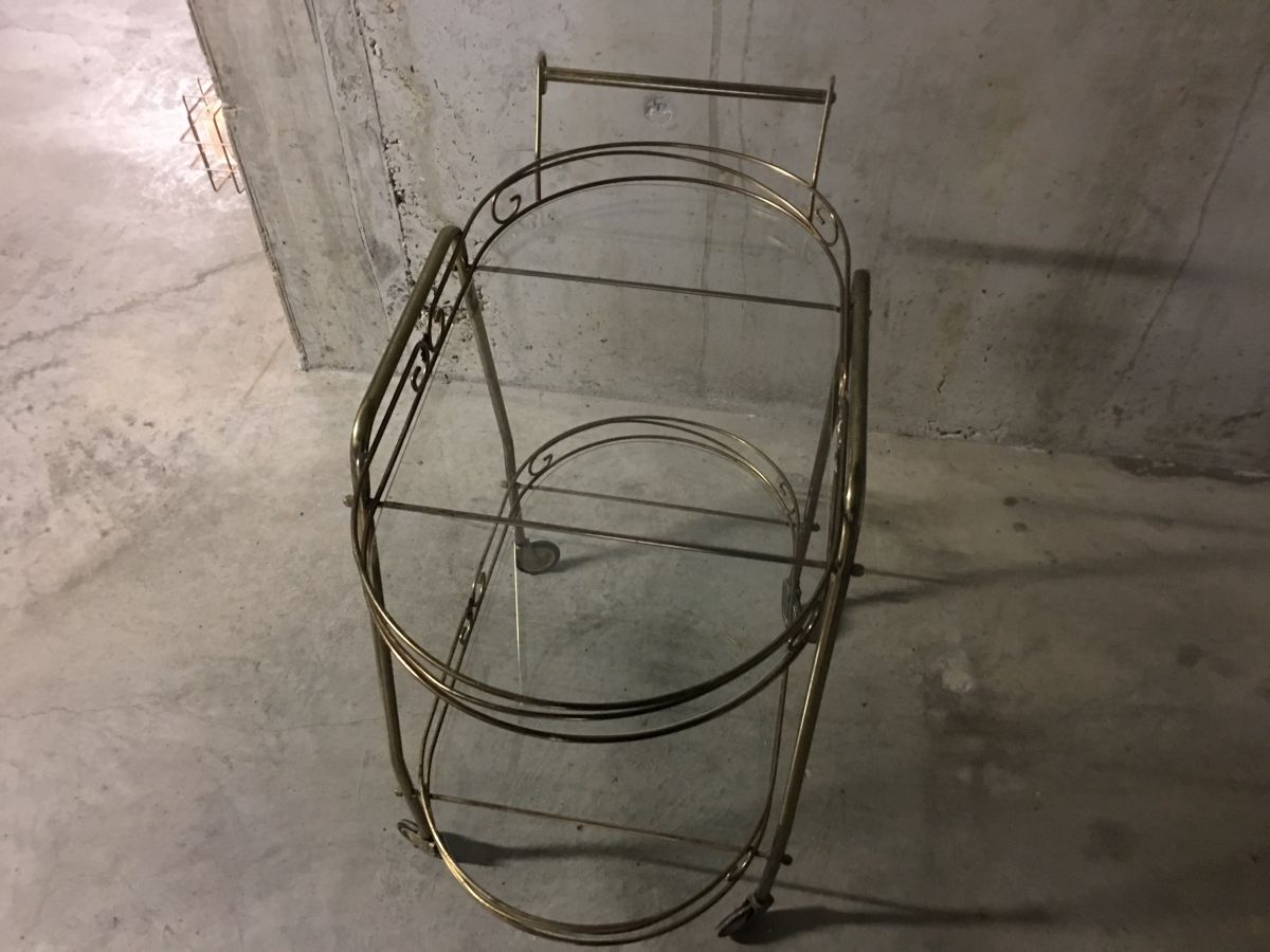 Desserte à roulettes des années 50 en laiton, 2 plateaux vitrés 75x40cm, dimensions (cm) : L.80xH.76xP.45, quelques traces d’usage normal sur le laiton, bon état.