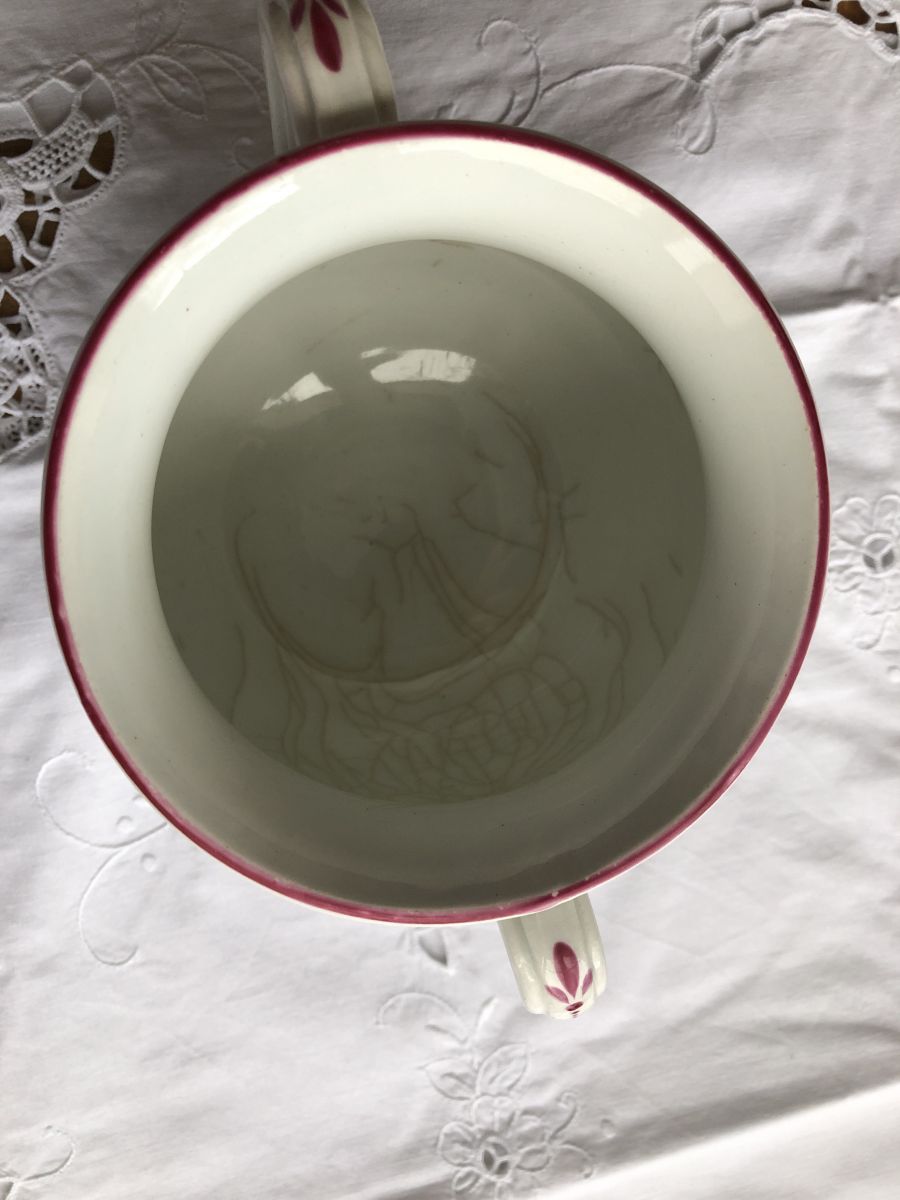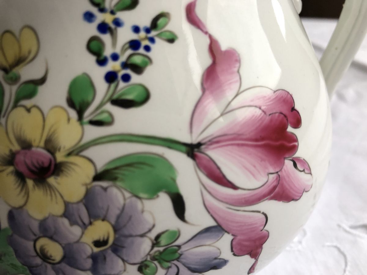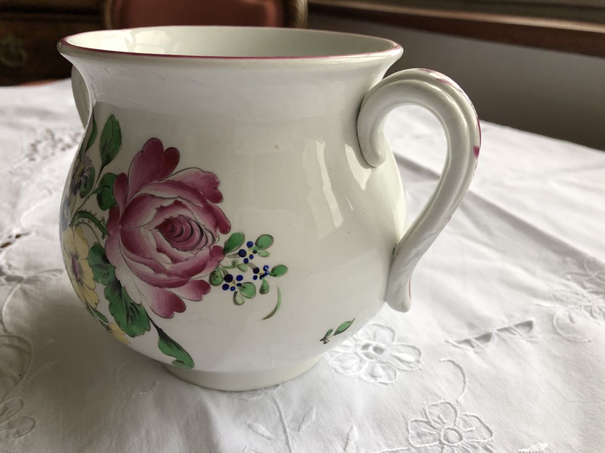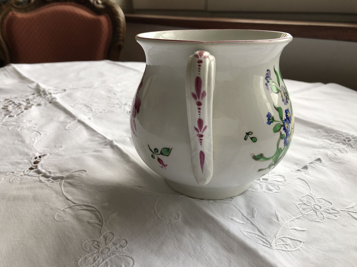 Joli pot à deux anses, décor de fleur peint à la main. Il est en parfait état hormis quelques fêlures à l’intérieur, non visibles de l’extérieur (voir photo). Il date du début du XXe siècle.