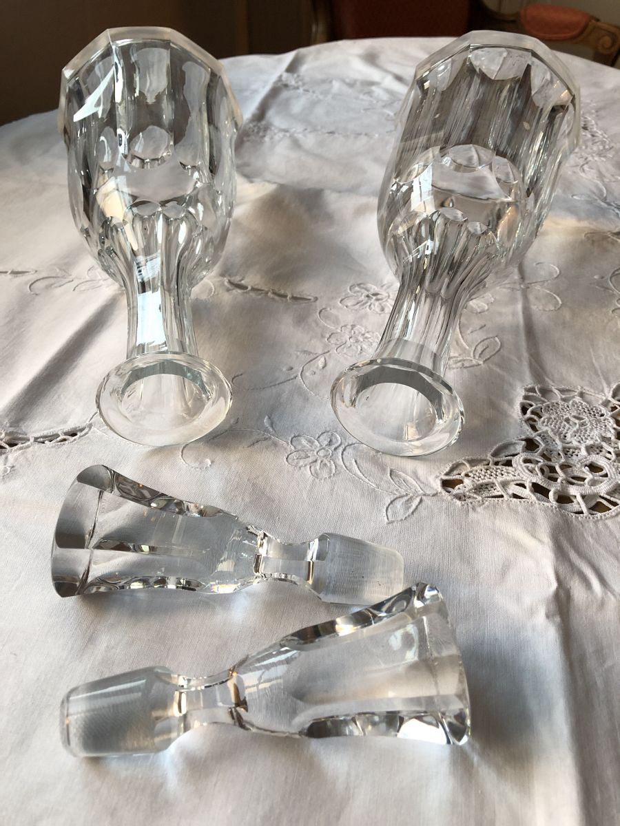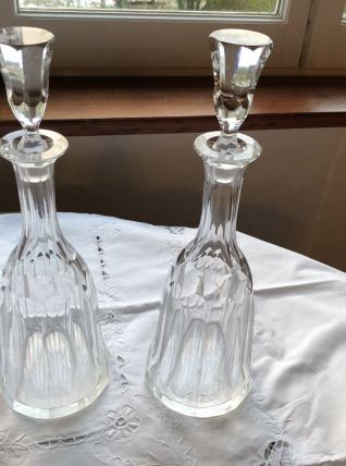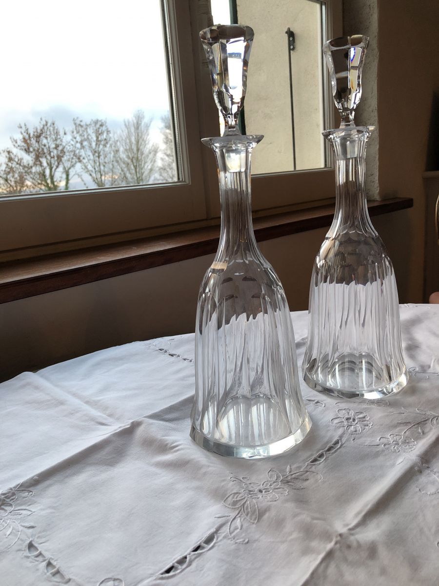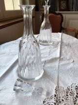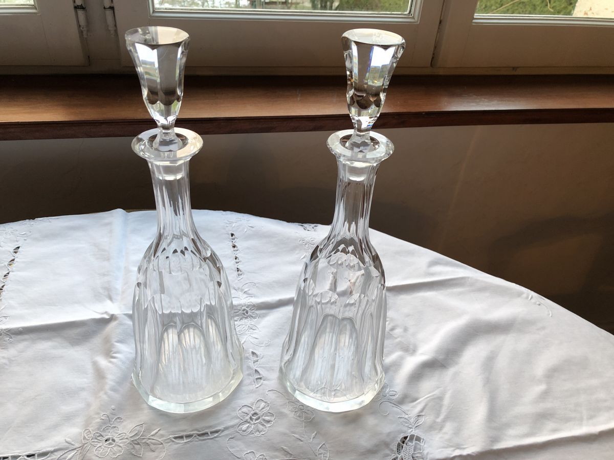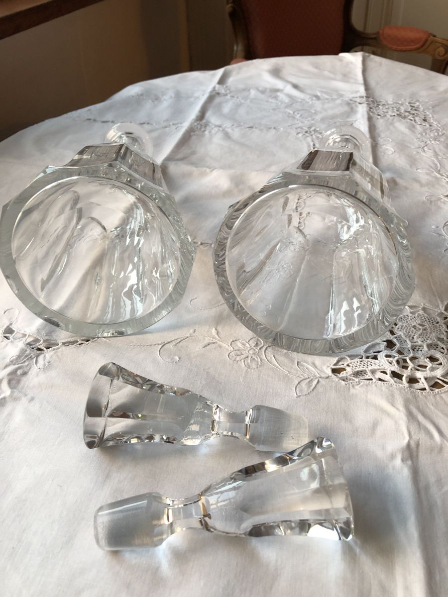 En parfait état, sans fêlure ni ébréchure ces deux carafes en cristal , probablement de Bohême, mesurent environ 28cm de haut sans le bouchon et 36 cm avec. La base mesure environ 11,5 cm de diamètre.
