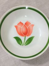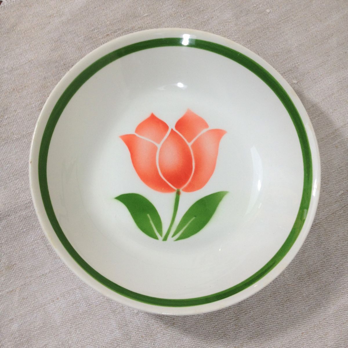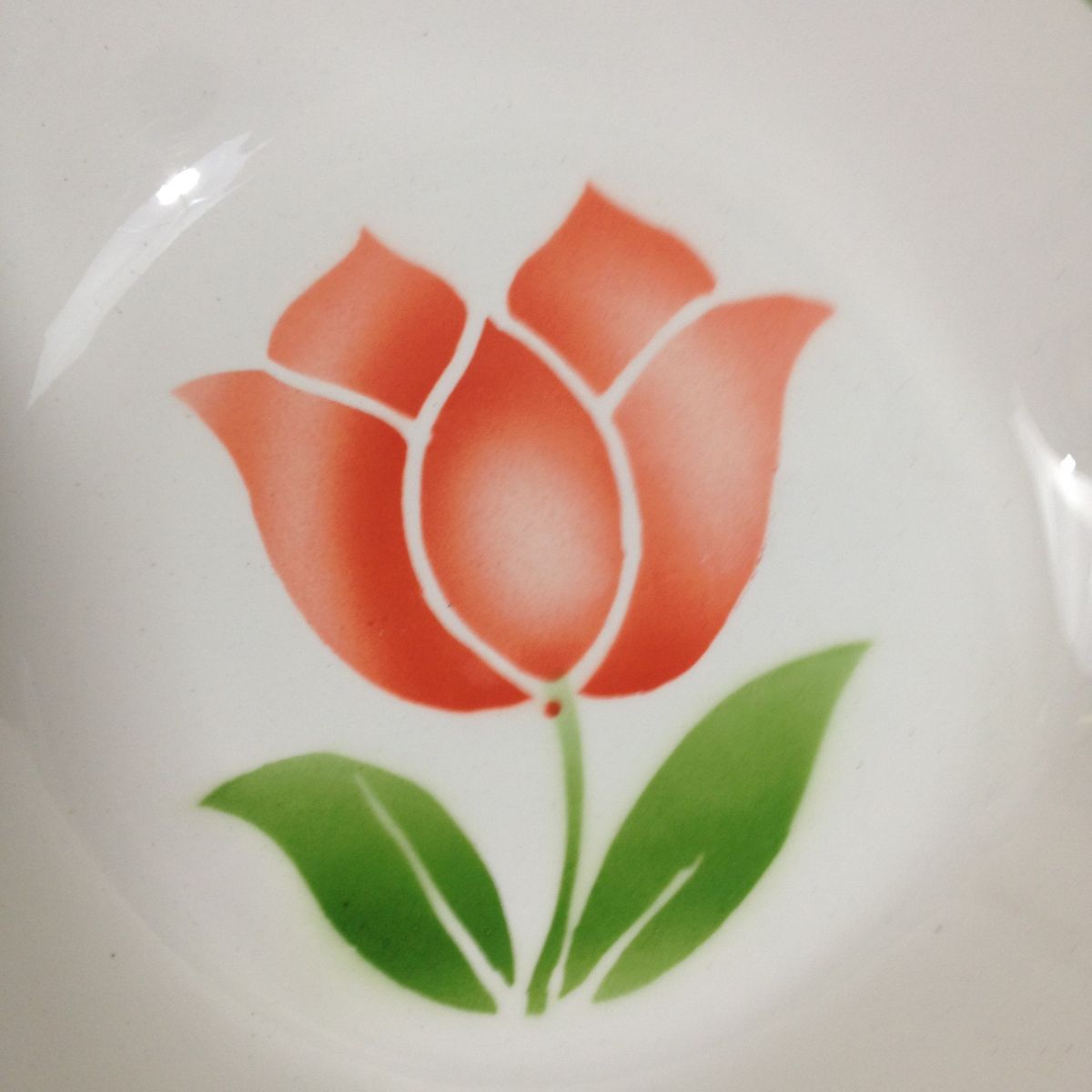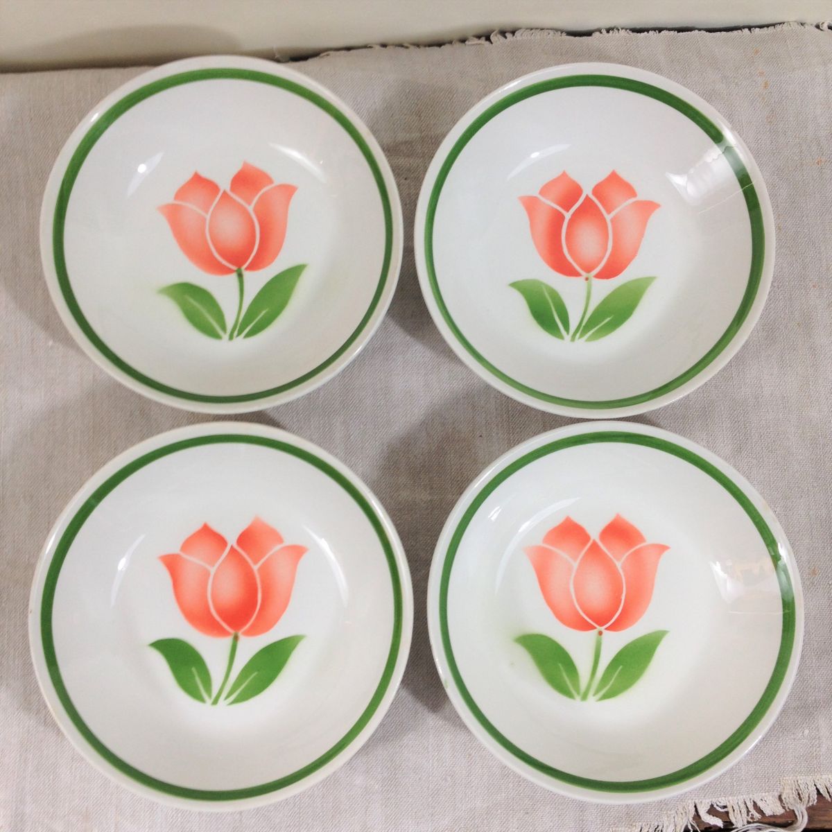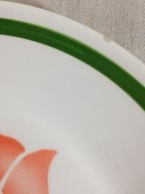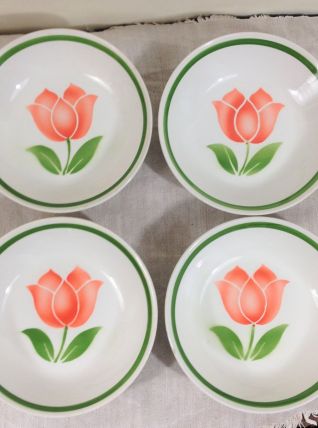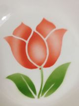 Fraîches et acidulées, 4 jolies assiettes estampillées "Moulin des Loups et Orchies" à décor de tulipe au pochoir. Fabriquées dans les années 70, elles ont l'avantage de passer au lave-vaisselle!