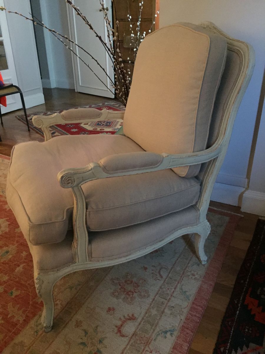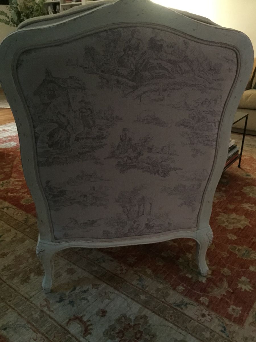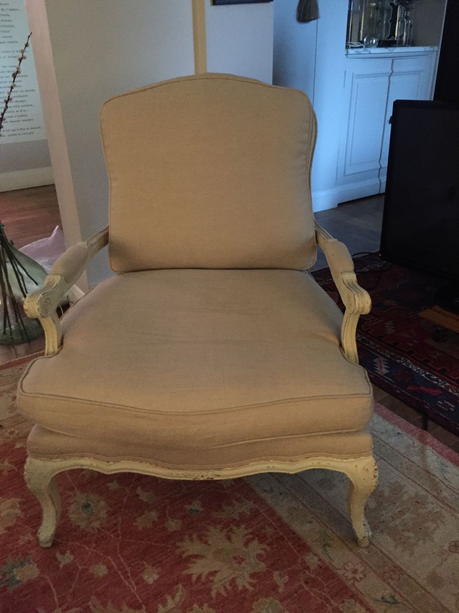 Très jolie bergère de chez Blanc d’Ivoire en lin naturel et dos de la bergère en toile de jouy.