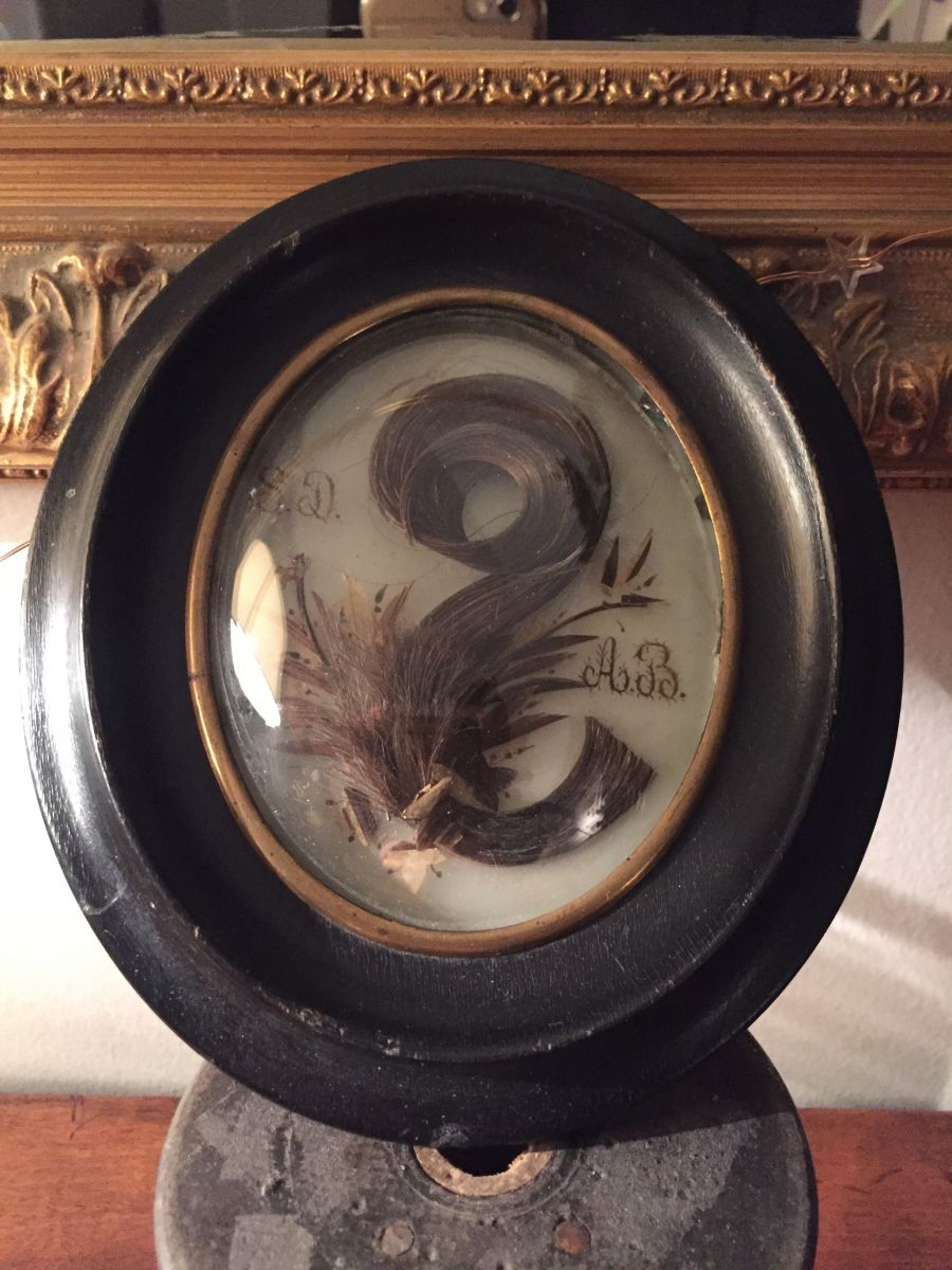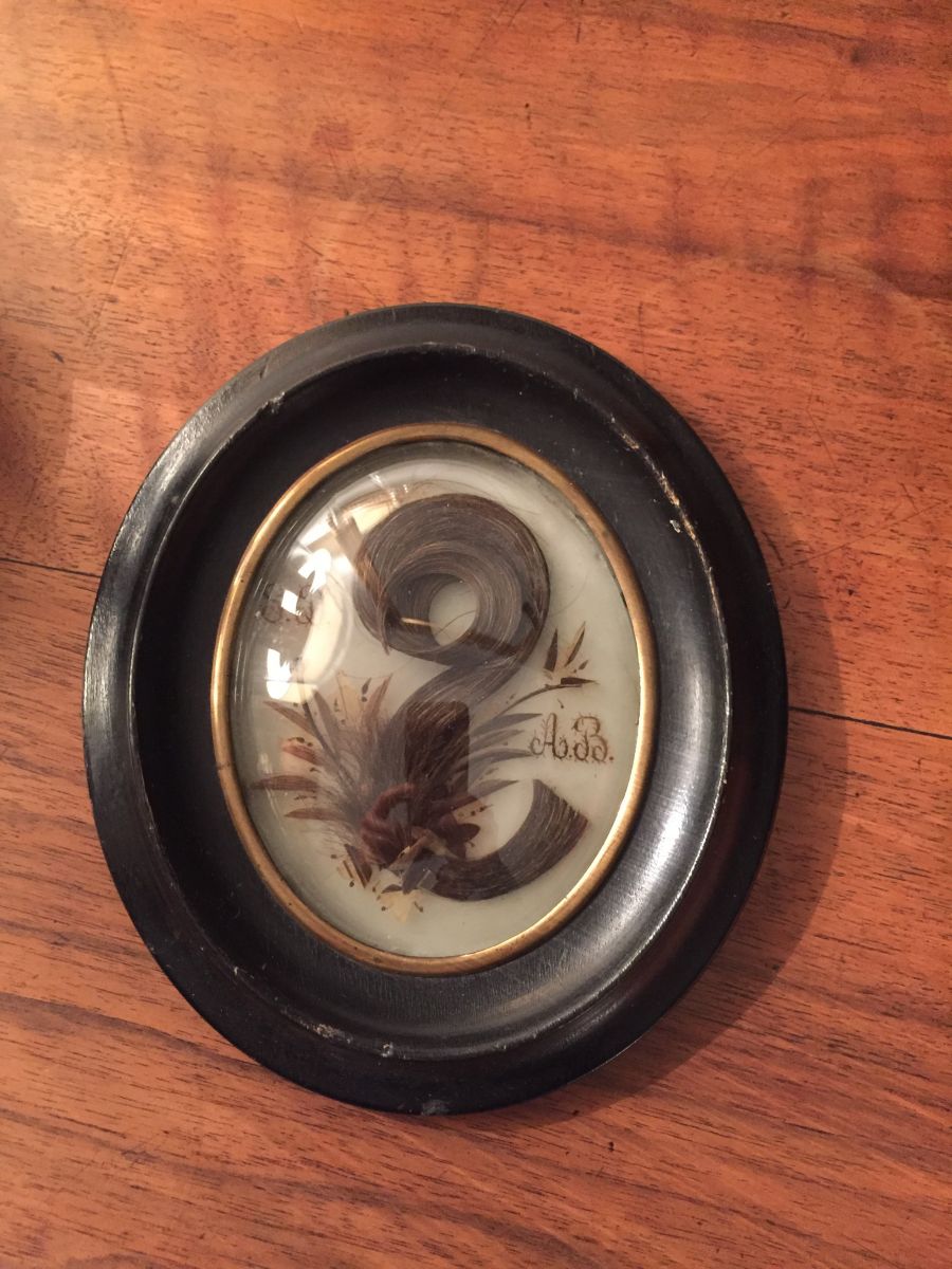 Ancien reliquaire cadre à cheveux Napoléon III avec les initiales de l’enfant. Le verre est bombé.
