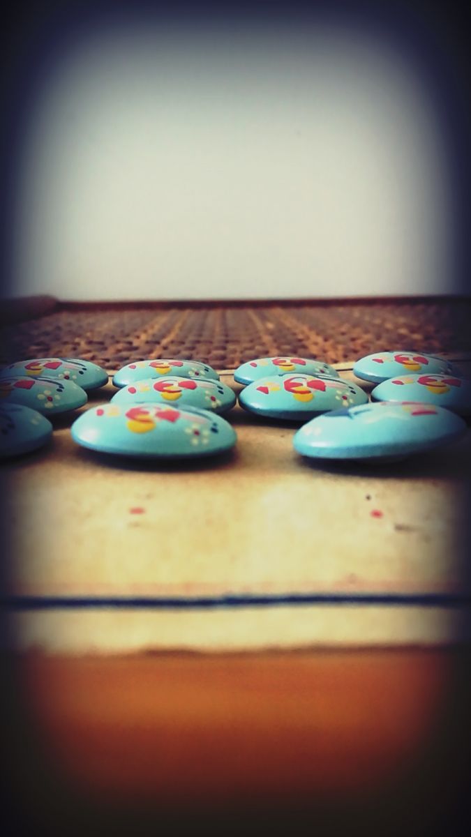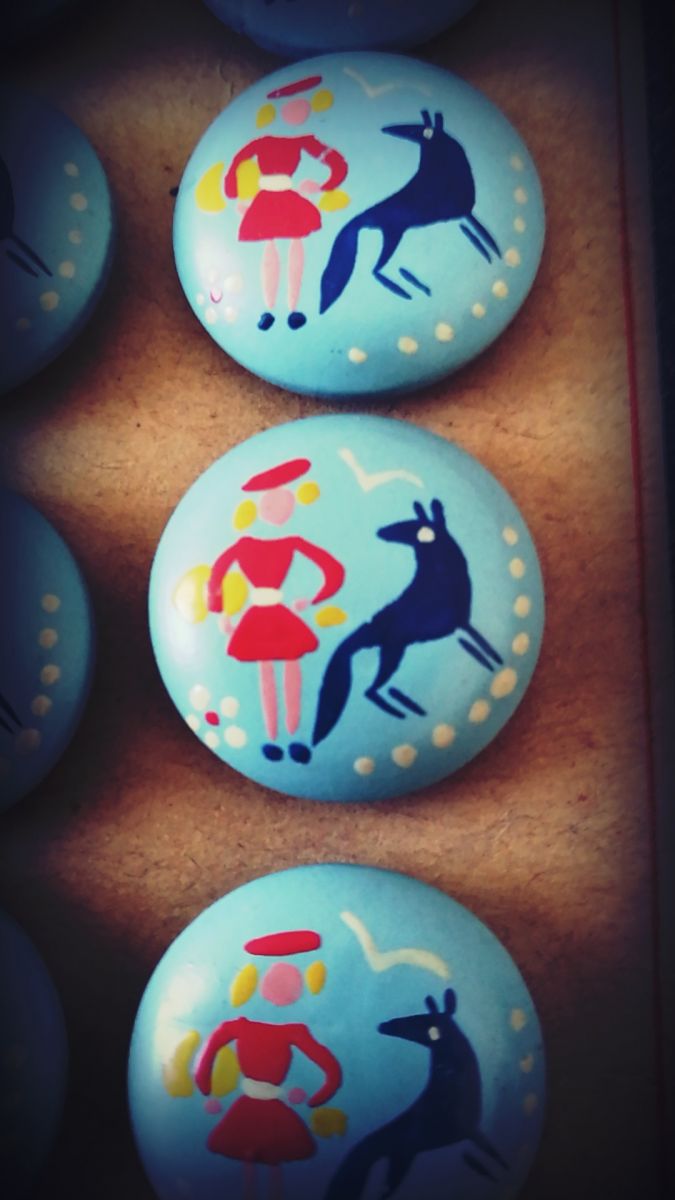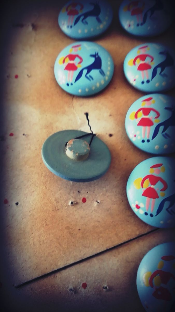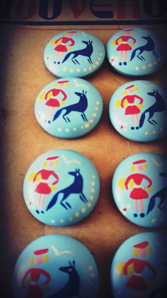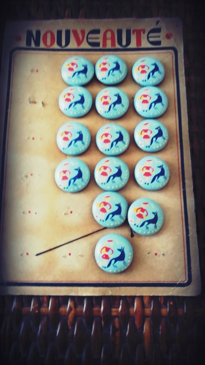 Lot de 15 boutons anciens en bois bleu ciel avec motif naïf de fillette et loup.