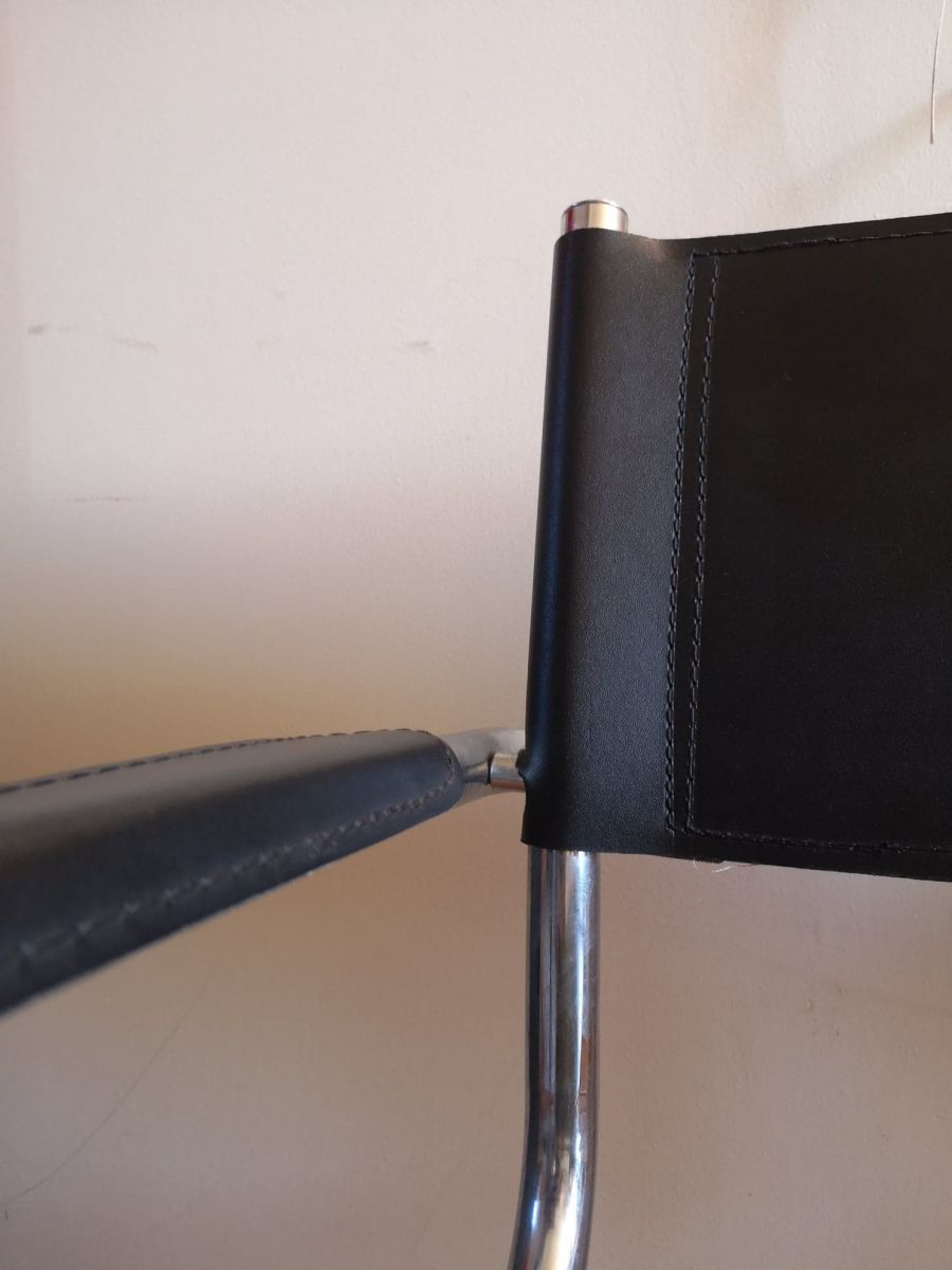 Structure tubulaire en acier chromé et cuir noir pour le dossier, l'assise et les accoudoirs.