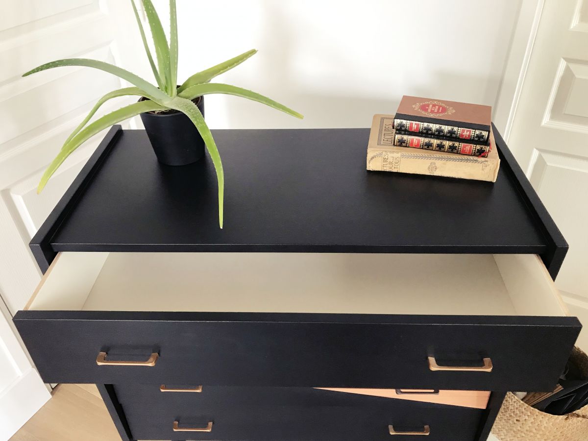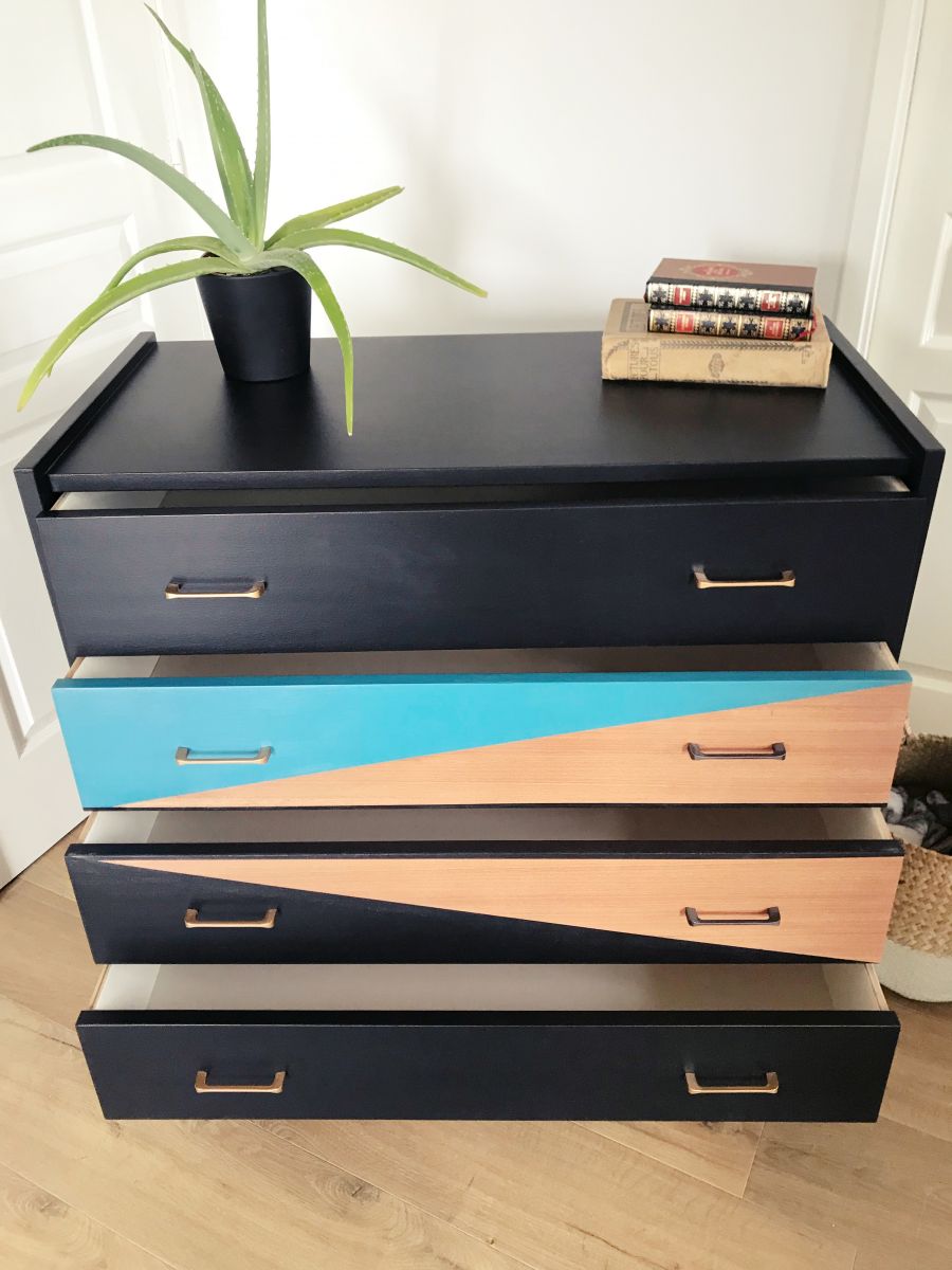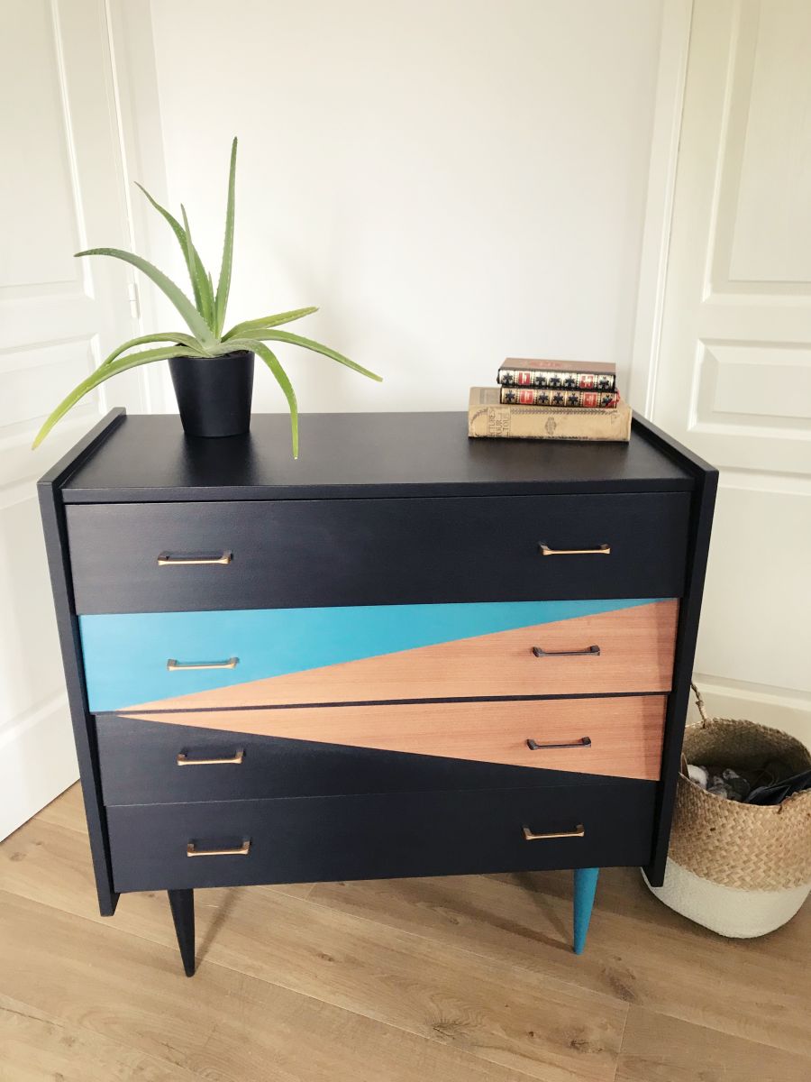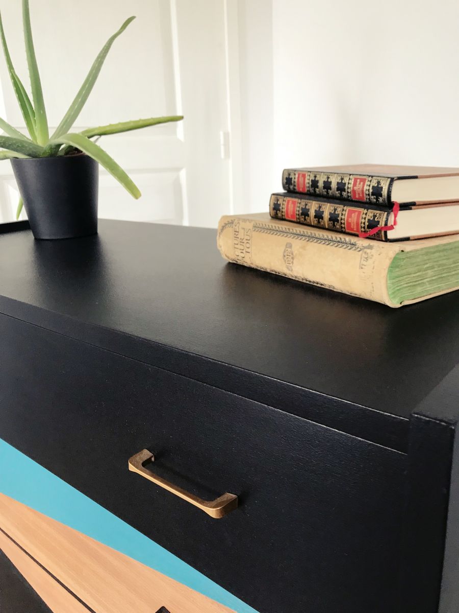 les détails : jeu de couleurs graphique, intérieur des tiroirs blanc milkshake, couleurs des poignées (d’origine) alternées or/noir métal, pied avant droit bleu en couleur de rappel